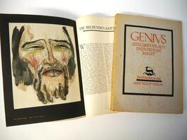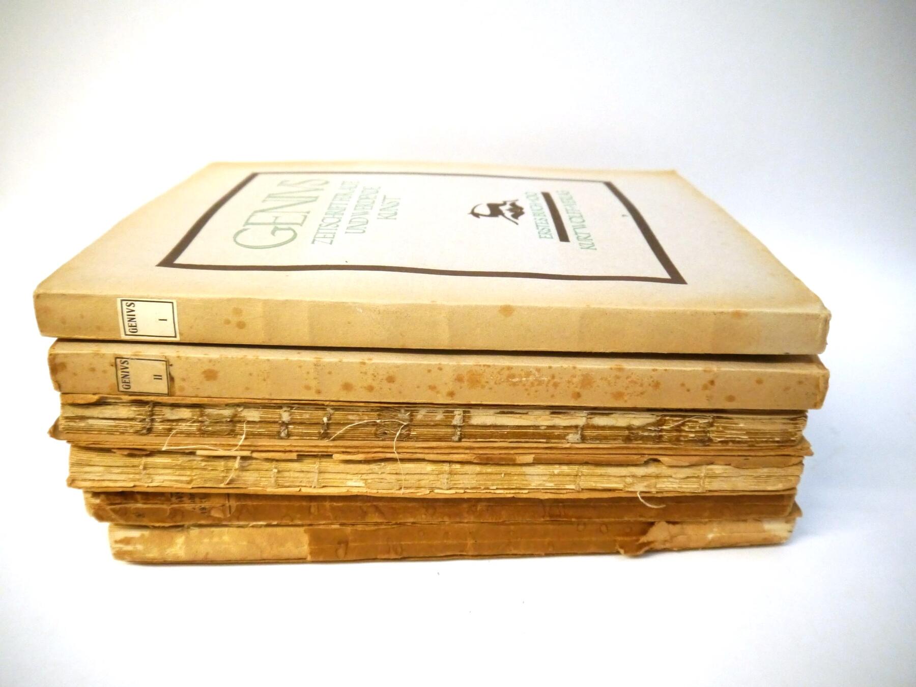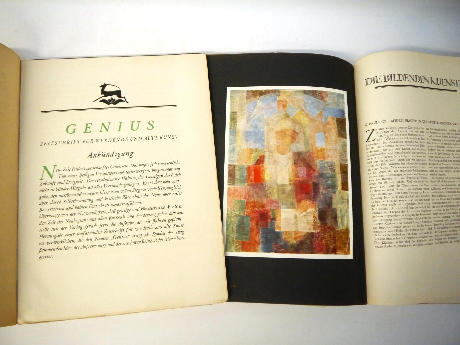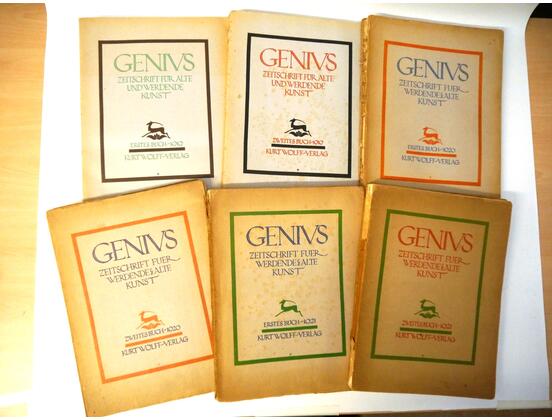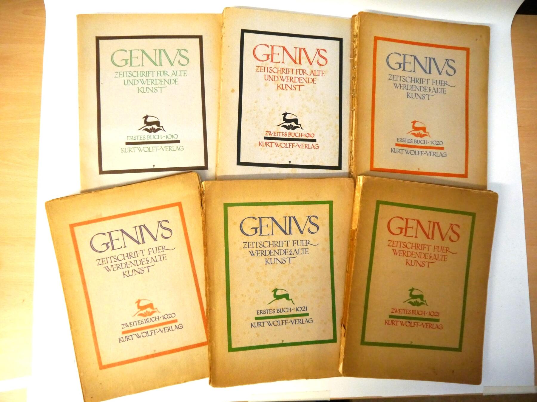 'Genius. Zeitschrift Fur Werdende unde alte Kunst', Munich, Leipzig, Kurt Wolff, 1919-1921, three volumes in six original parts (all that was ever published), edited Hans Mardersteig and Carl Georg Heise, illustrated throughout with numerous mounted illustrations but apparently lacking the 16 woodcuts/etching/litho's by Schmidt-Rotluff, Franz Kafka, Maxim Gorky, Alfred Dublin, Herman Hesse and others, each folio, original printed wraps, parts 3 & 4 lacking backstrips, 5 & 6 backstrips with part loss/wear, some loose leaves etc (6)