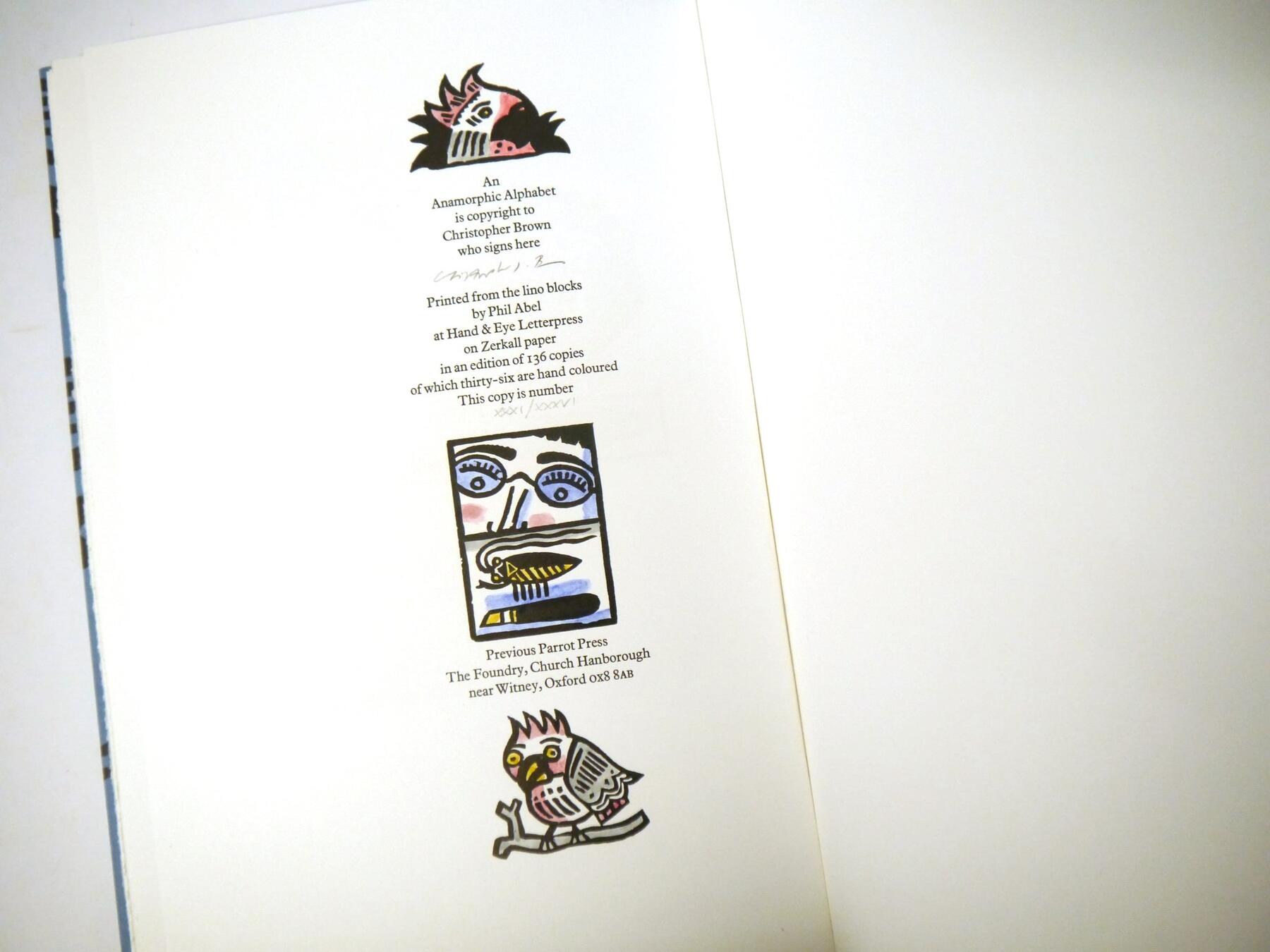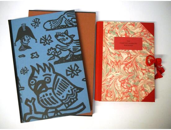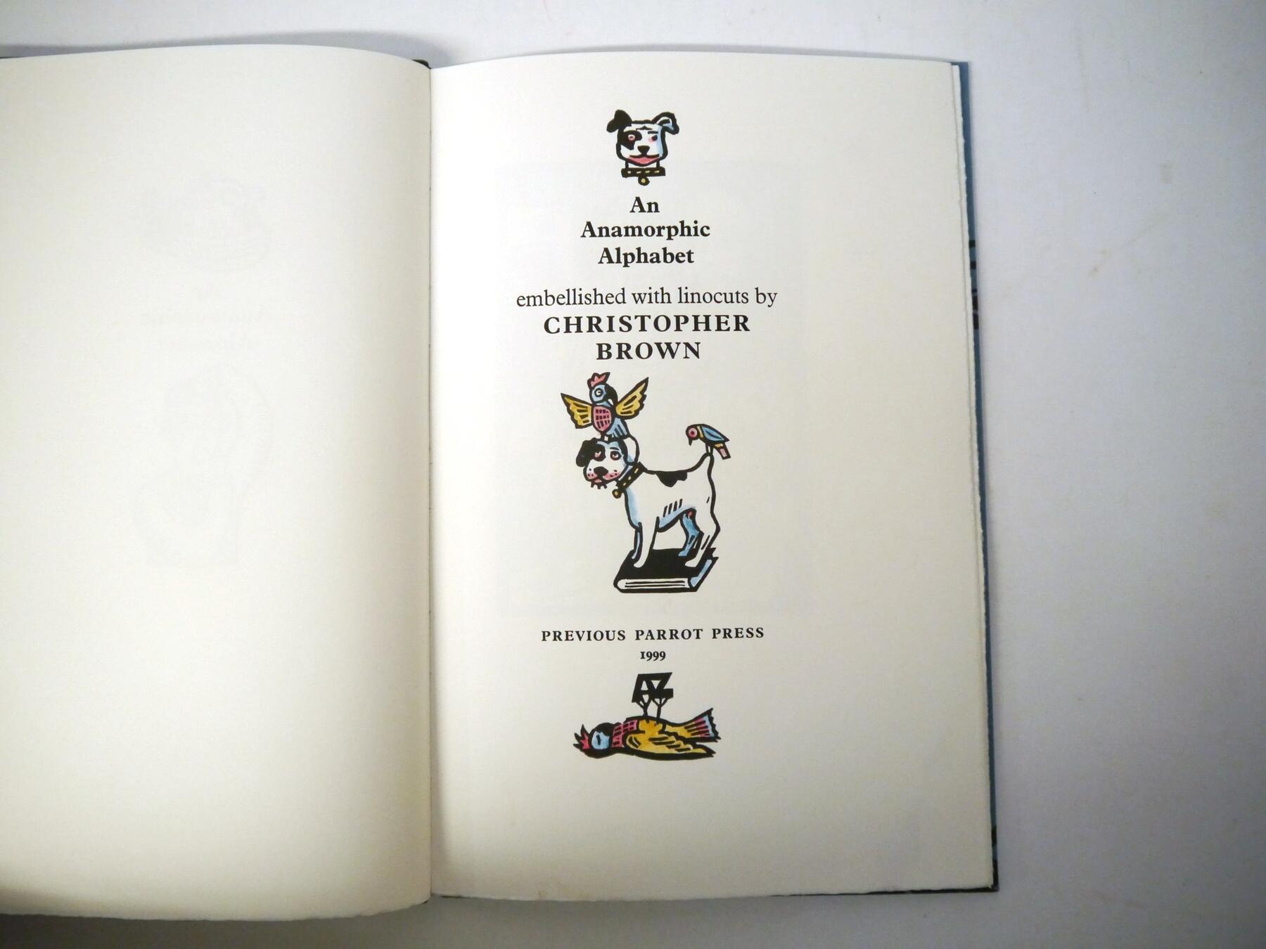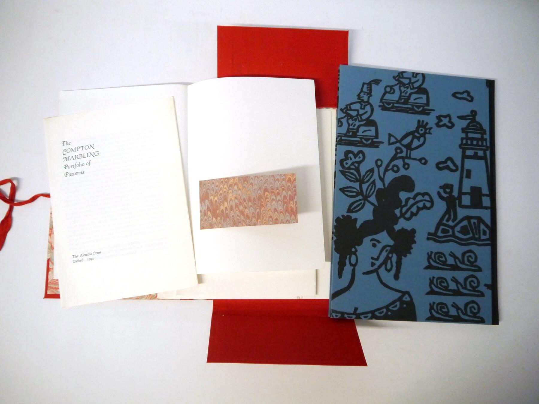 Christopher Brown: 'An Anamorphic Alphabet' The Previous Parrot Press, 1999, limited edition, 136 copies in total, this one of 36 copies (numbered XXXI/XXXVI) with the linocut illustrations hand coloured, original quarter navy morocco gilt, linocut design pictorial paper covered boards, slip case; plus 'The Compton Marbling Portfolio of Patterns', Oxford, The Alembic Press, 1992, limited edition of text and 17 with tipped in samples as called for, all housed loose as issued in original half cloth over marbled paper covered boards portfolio, printed paper label, silk ribbon ties (2)