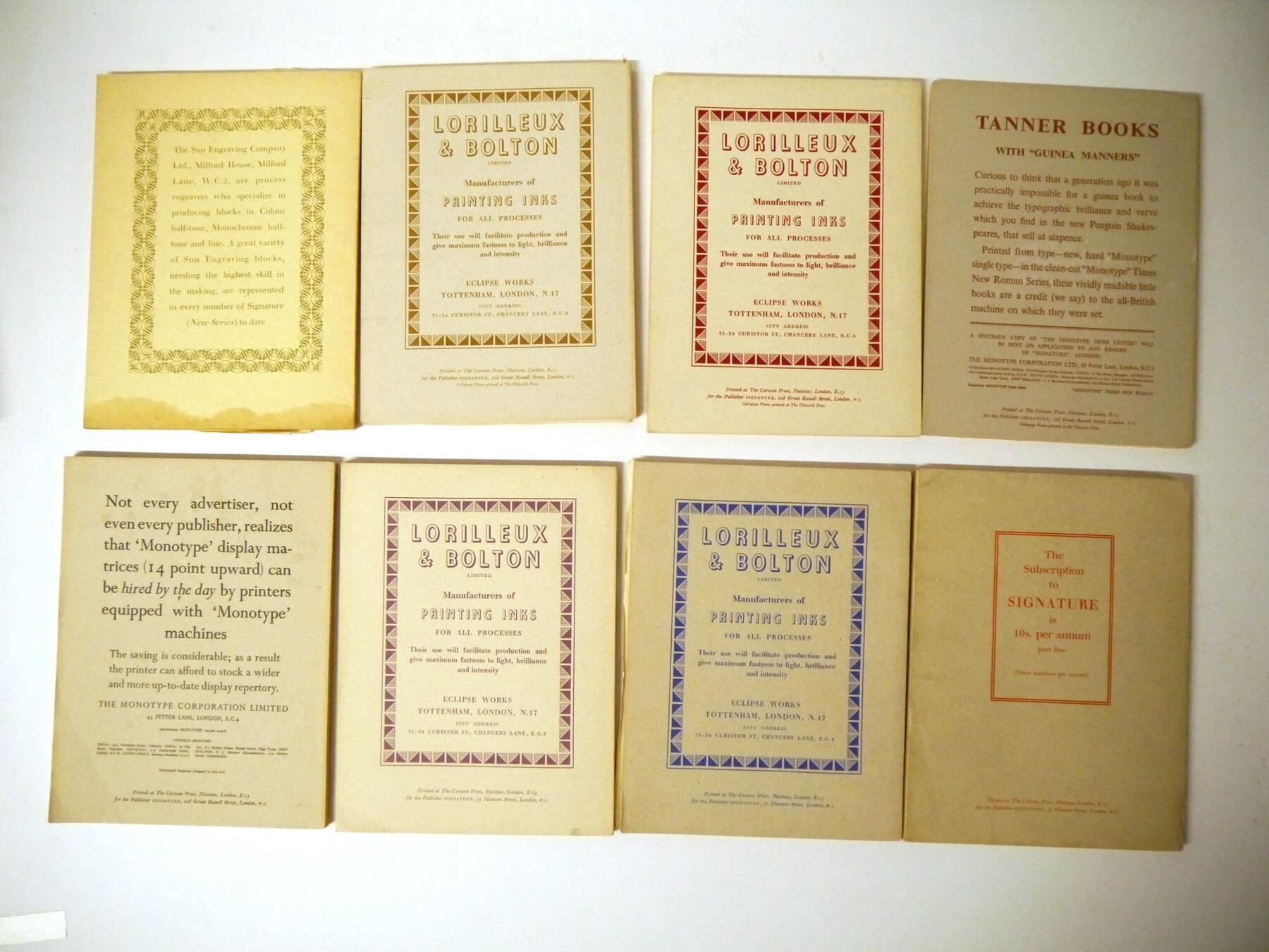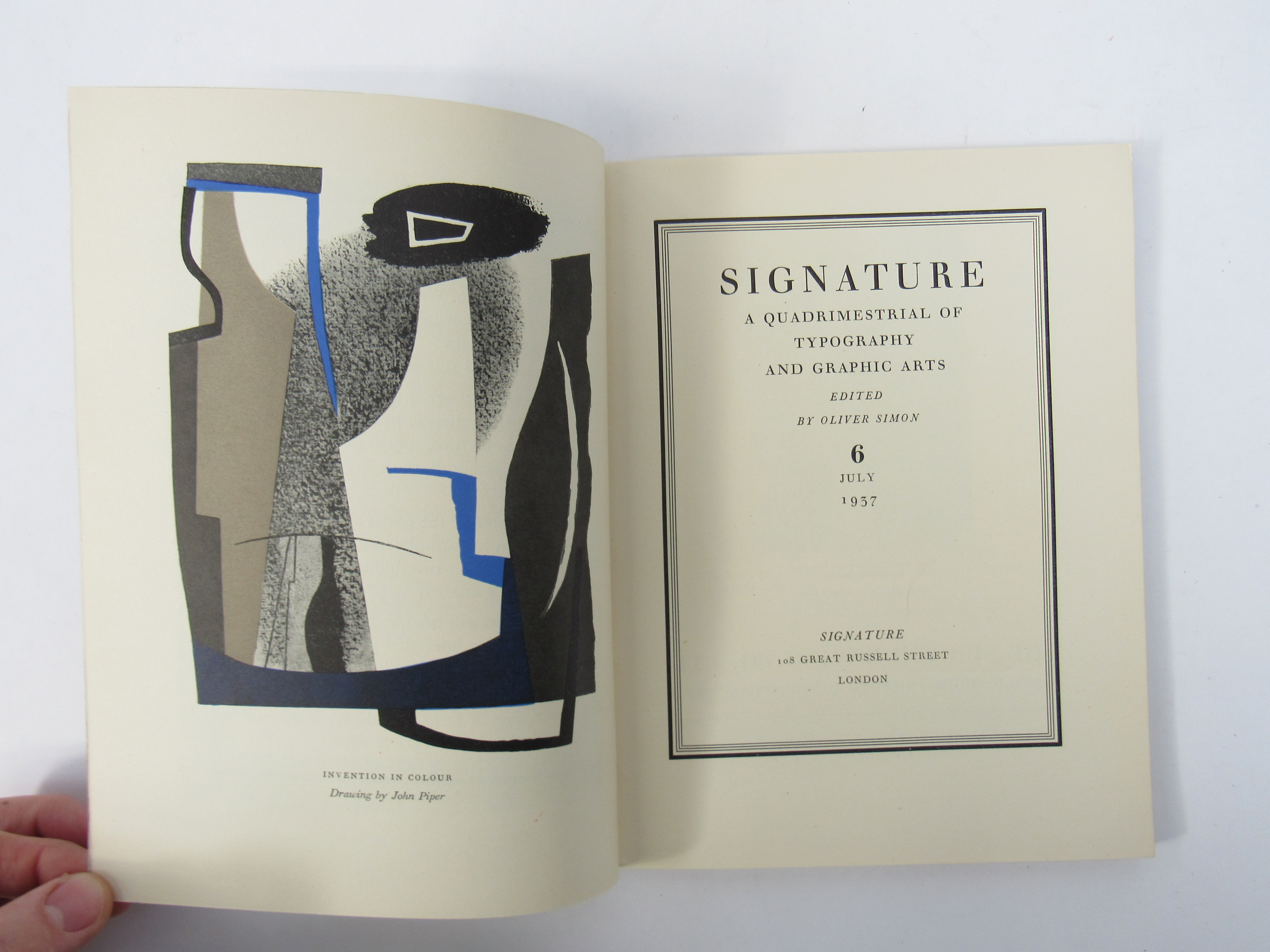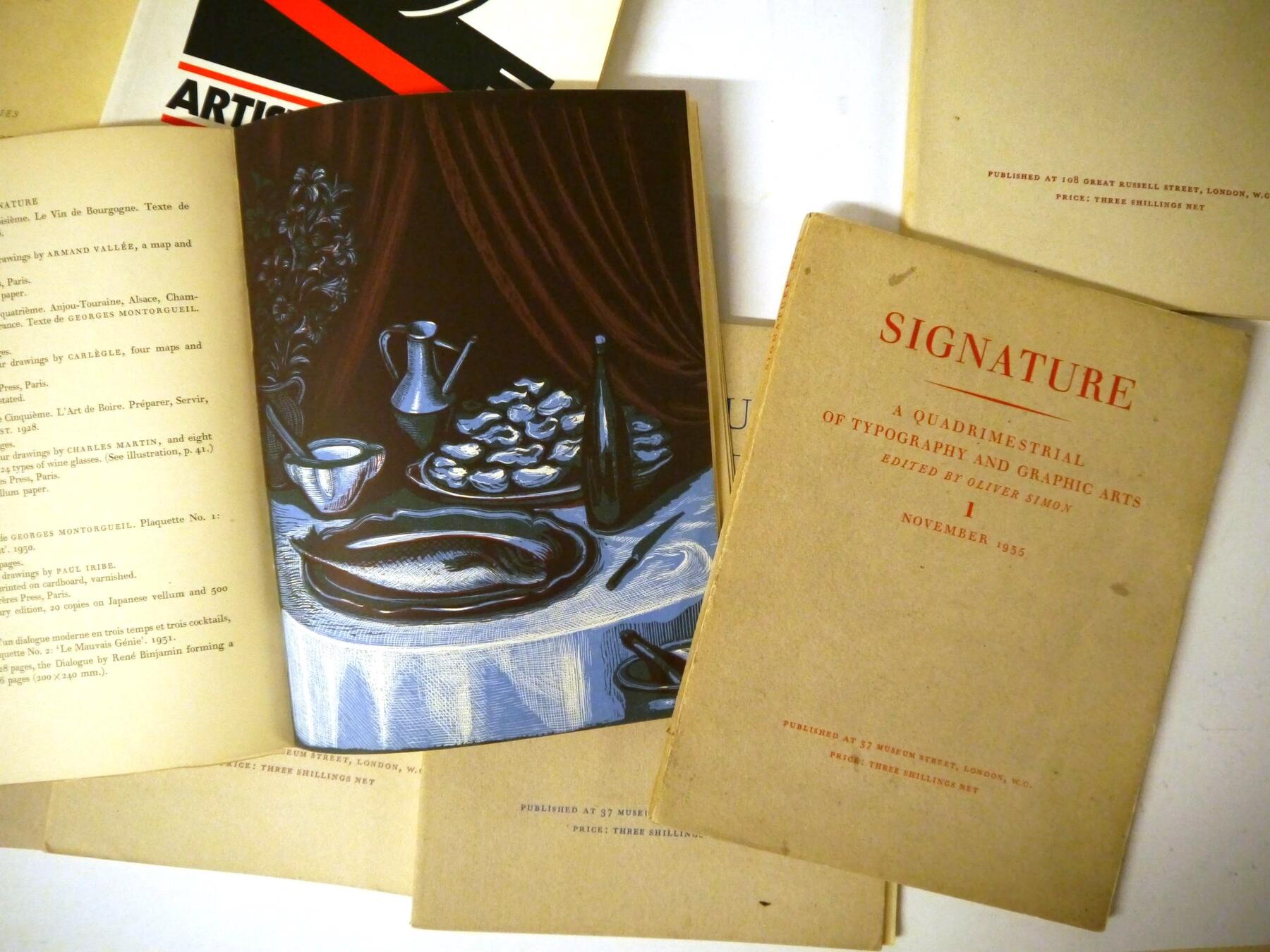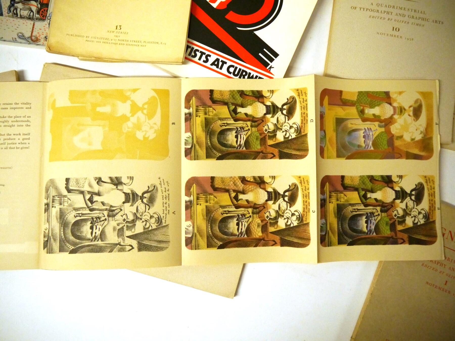 'Signature: A Quadrimestrial of Typography and Graphic Arts', edited Oliver Simon, London, Curwen Press, 8 assorted numbers comprising No.s 1-3 (Nov 1935, March 1936, July 1936) plus No.s 5,6,7,10 and new series number 13, 1951, each original printed wraps, illustrations and content by leading artists & illustrators including Paul Nash, Eric Ravilious, Edward Bawden, Graham Sutherland, Barnett Freedman, John Piper etc. Scarce; together with Powers: 'Art & Print: The Curwen Story', & Gilmour: 'Artists at Curwen', each original pictorial wraps. (10) NB all plates collated complete as per list in each issue
