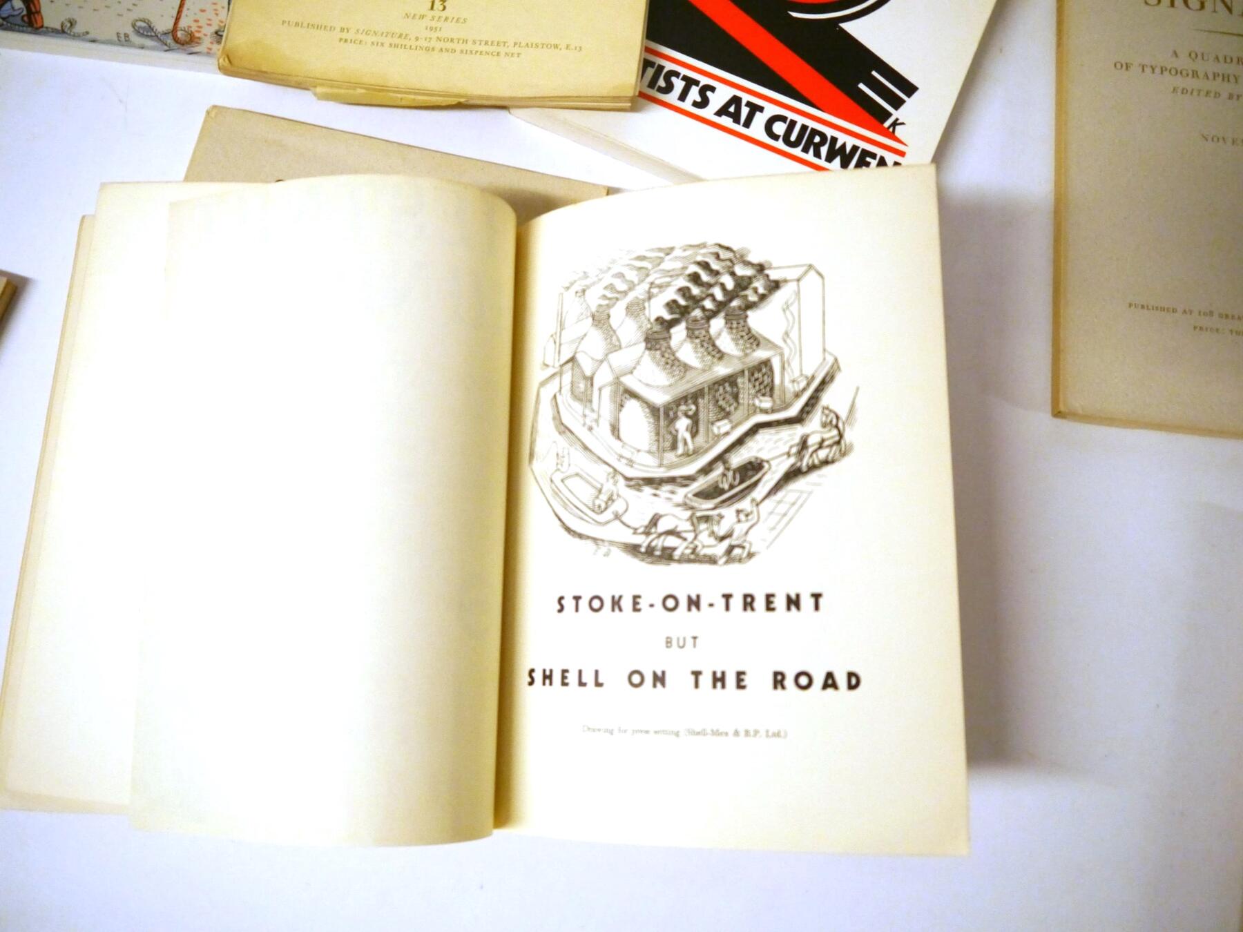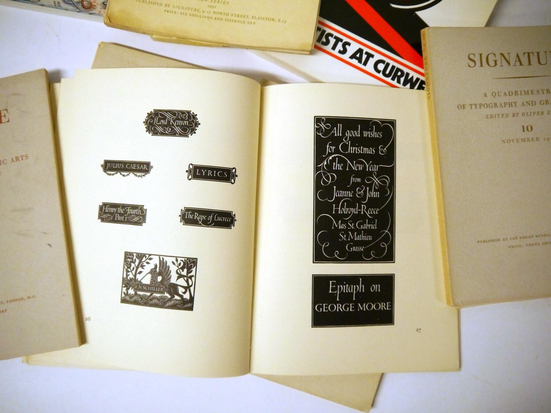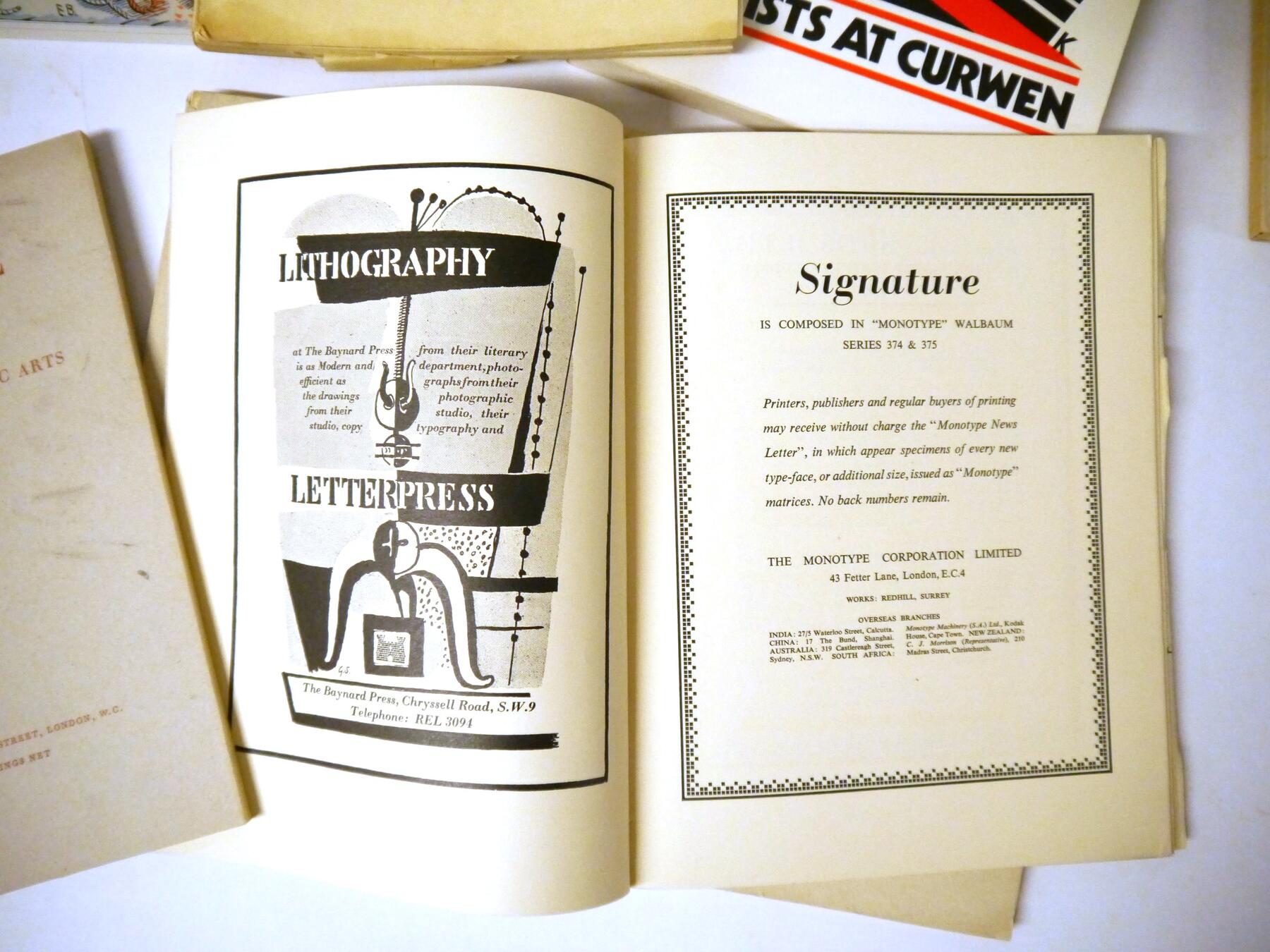 'Signature: A Quadrimestrial of Typography and Graphic Arts', edited Oliver Simon, London, Curwen Press, 8 assorted numbers comprising No.s 1-3 (Nov 1935, March 1936, July 1936) plus No.s 5,6,7,10 and new series number 13, 1951, each original printed wraps, illustrations and content by leading artists & illustrators including Paul Nash, Eric Ravilious, Edward Bawden, Graham Sutherland, Barnett Freedman, John Piper etc. Scarce; together with Powers: 'Art & Print: The Curwen Story', & Gilmour: 'Artists at Curwen', each original pictorial wraps. (10) NB all plates collated complete as per list in each issue