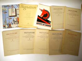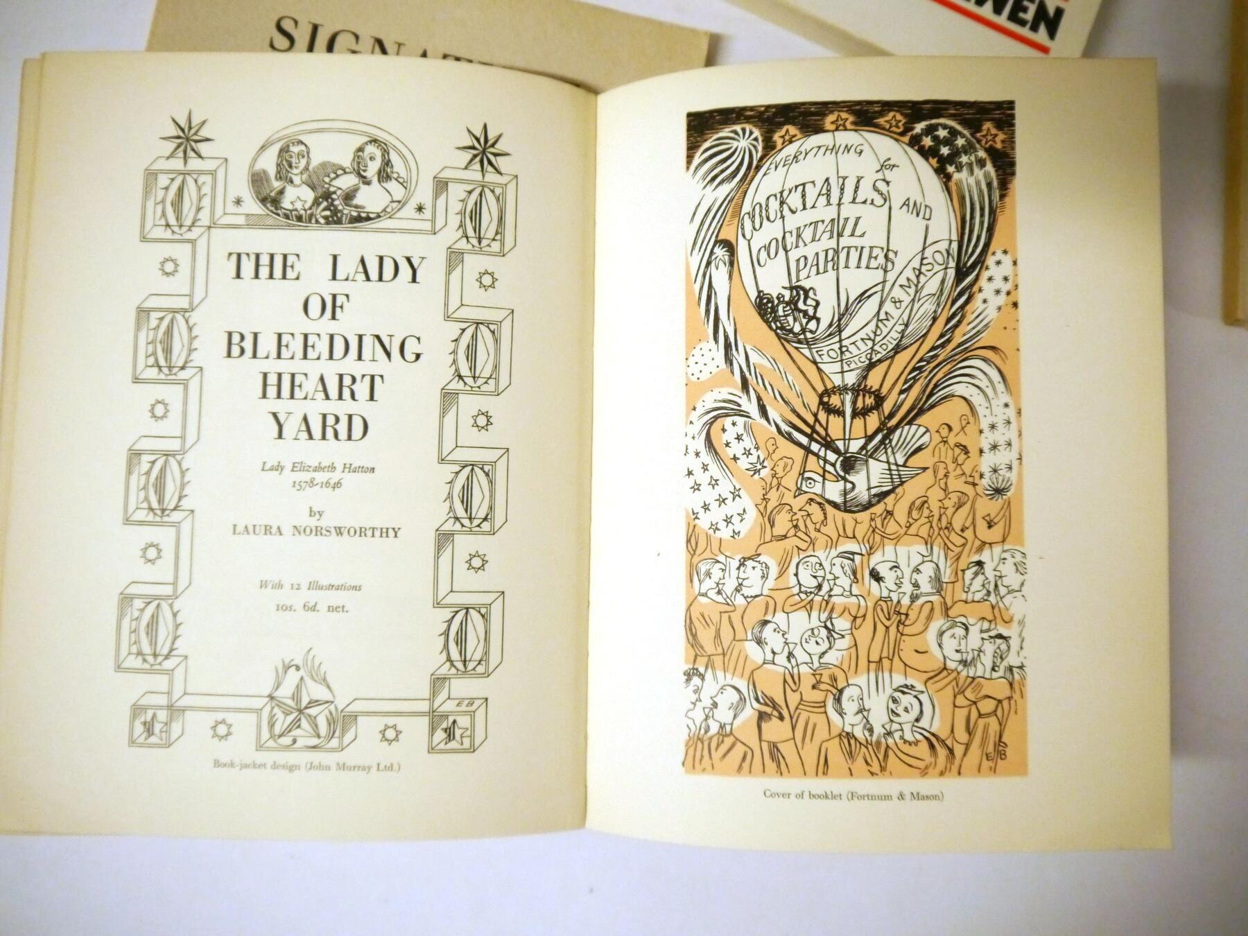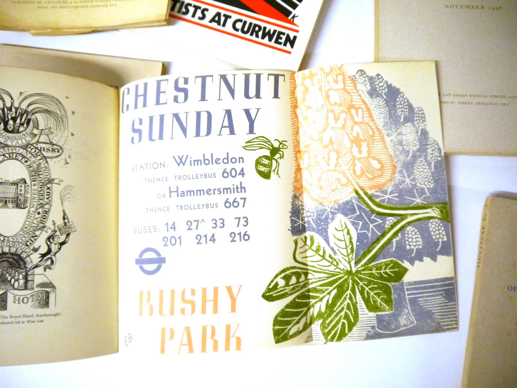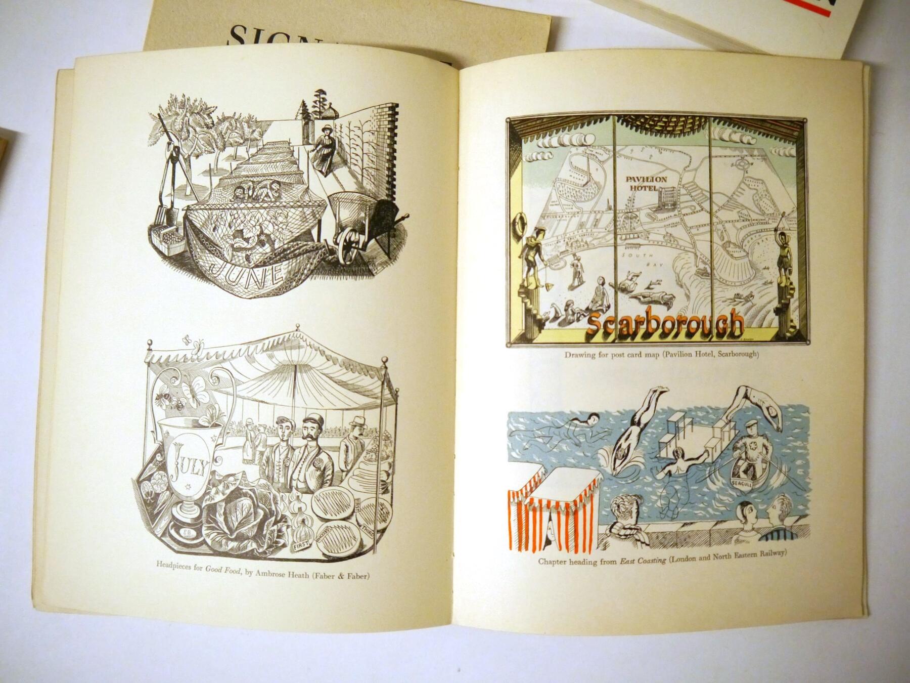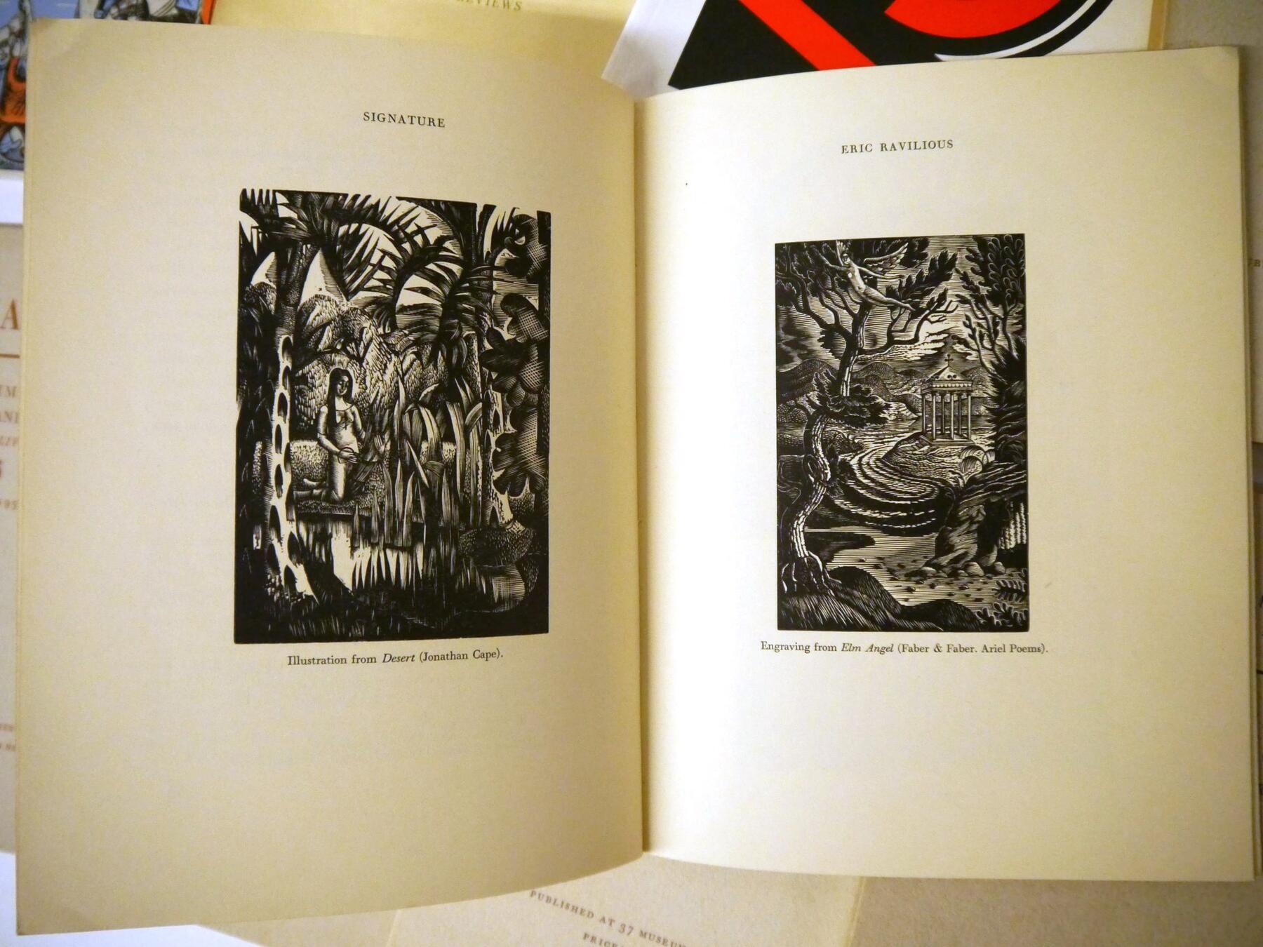 'Signature: A Quadrimestrial of Typography and Graphic Arts', edited Oliver Simon, London, Curwen Press, 8 assorted numbers comprising No.s 1-3 (Nov 1935, March 1936, July 1936) plus No.s 5,6,7,10 and new series number 13, 1951, each original printed wraps, illustrations and content by leading artists & illustrators including Paul Nash, Eric Ravilious, Edward Bawden, Graham Sutherland, Barnett Freedman, John Piper etc. Scarce; together with Powers: 'Art & Print: The Curwen Story', & Gilmour: 'Artists at Curwen', each original pictorial wraps. (10) NB all plates collated complete as per list in each issue