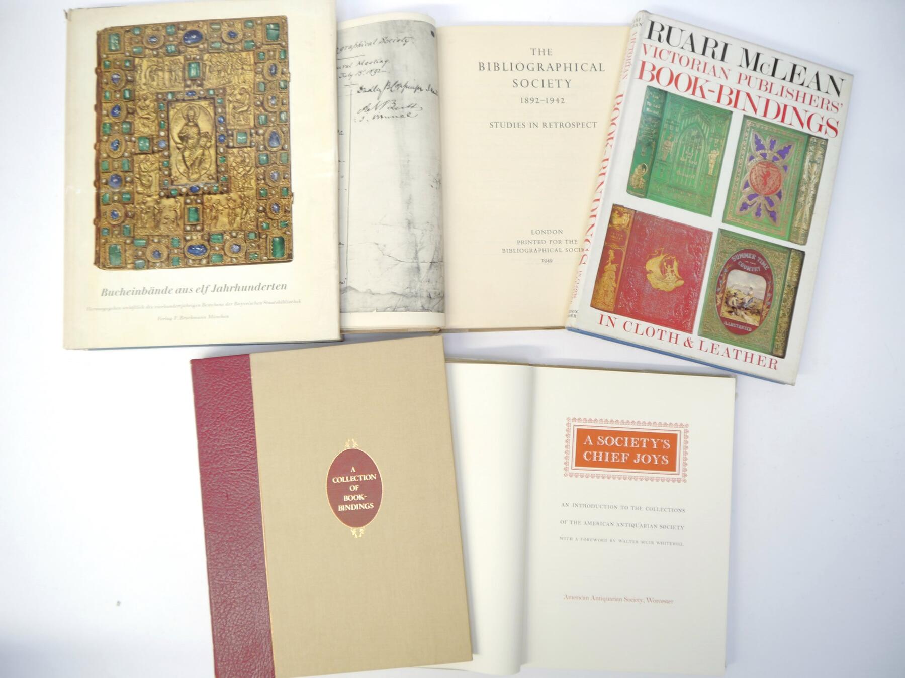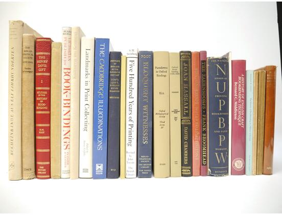 A collection of 20 titles on bookbinding printing etc, including M M Foot ''A Collection of Bookbindings Volume I Studies in the History of Bookbinding'', British Library, 1978, original calf gilt; Broomhead: 'The Zaehnsdoerfs (1842-1947) Craft Bookbinders', 1986, (2,250), original cloth gilt; 'Bookbindings From the Library of Jean Grolier', British Library, 1965, original leatherette gilt; H M Nixon: 'english restoration Bookbindings', 1974, signed and inscribed, original cloth gilt; plus others Douglas & Sydney Cockerell; The Cambridge Illuminations etc (29)