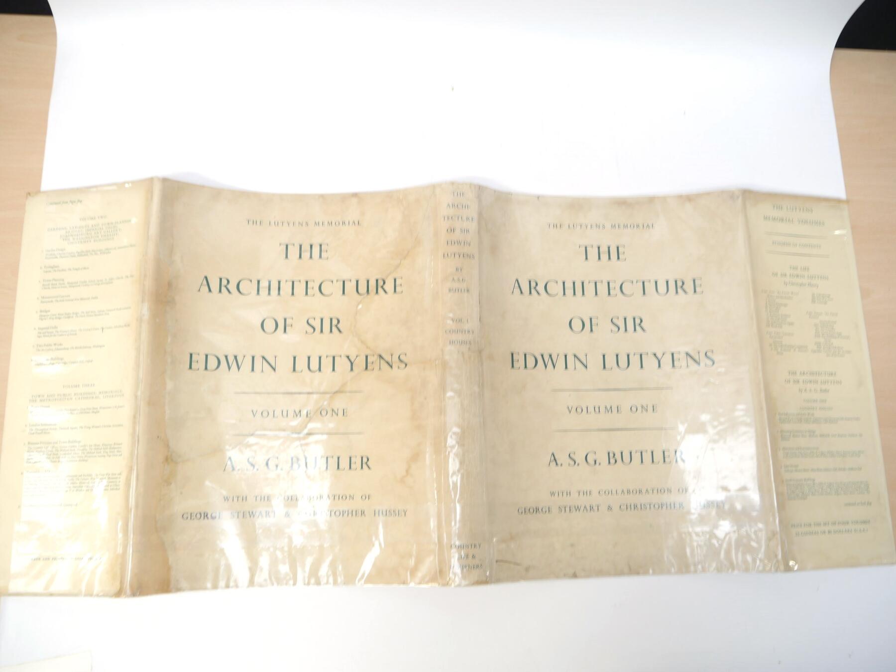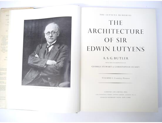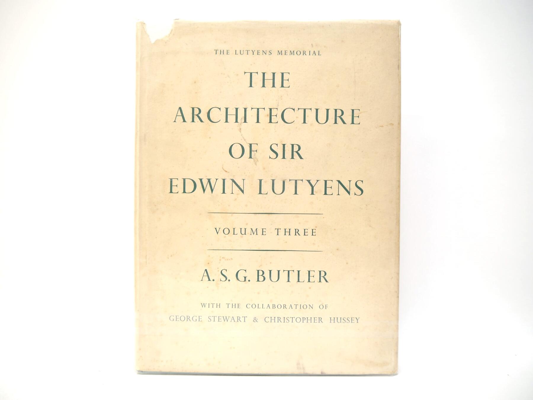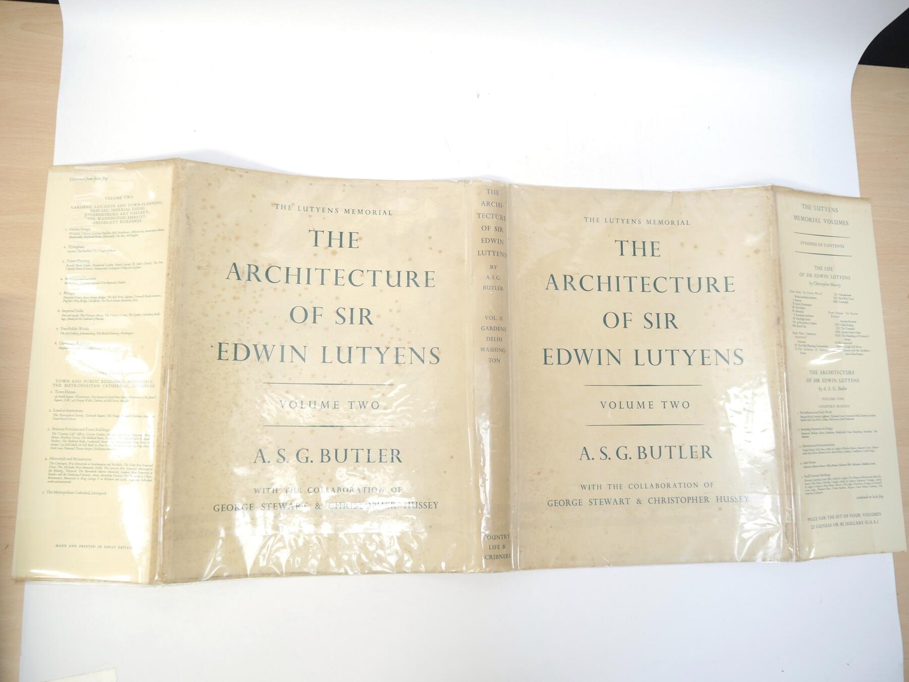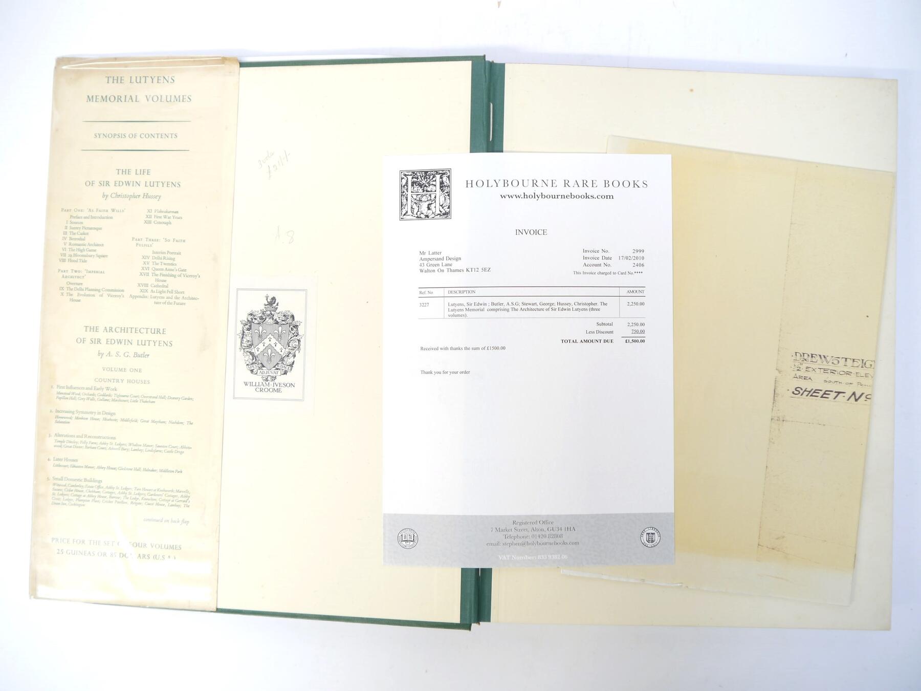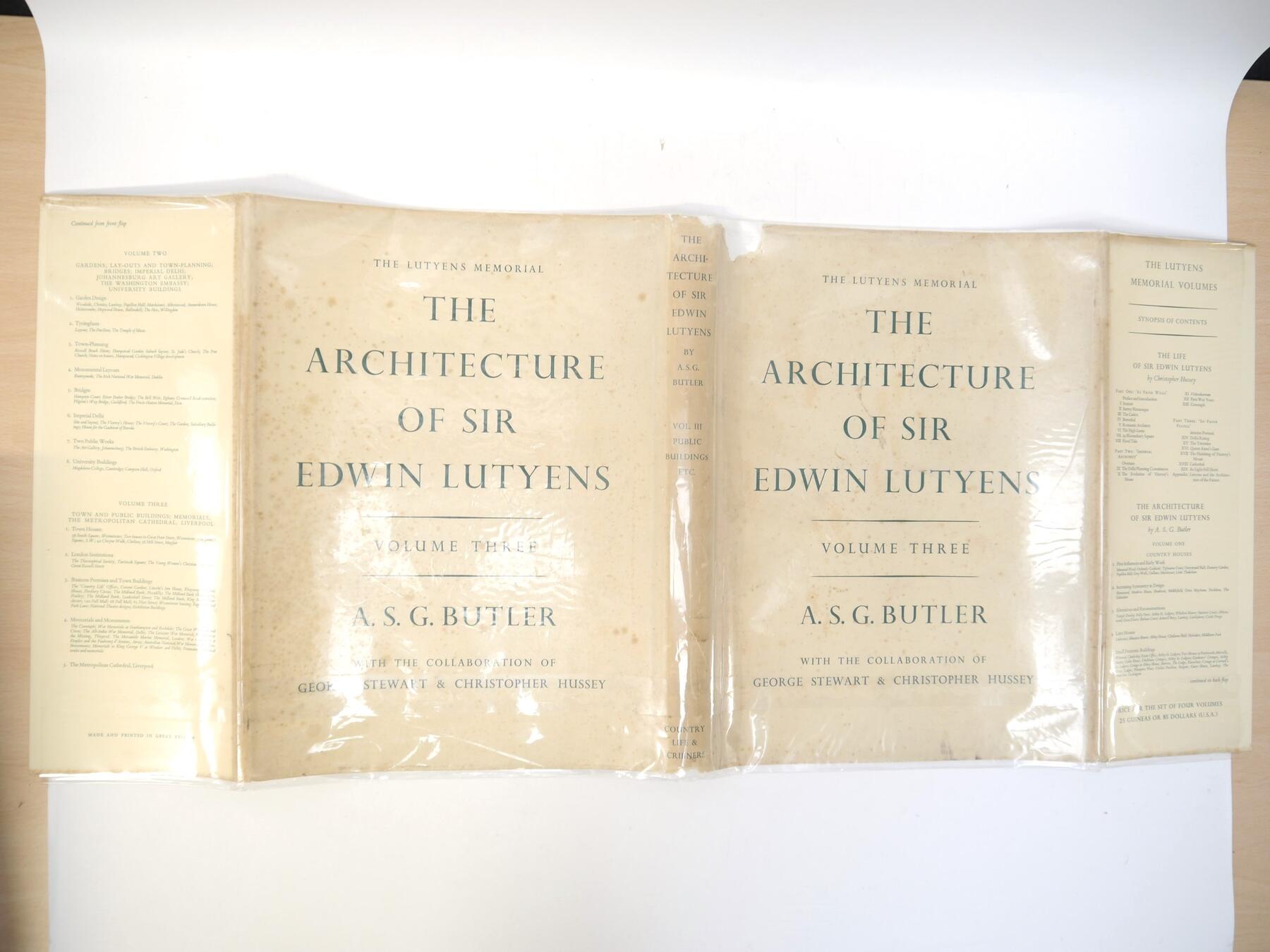A.S.G. Butler: 'The Lutyens Memorial, The Architecture of Sir Edwin Lutyens', London, Country Life, 1950, 1st edition, 3 volumes, numerous monochrome plates and illustrations, many folding, folio, original green cloth gilt, dust wrappers (worn and with some part losses and repairs/restoration), armorial bookplates of William Iveson Croome, large folding facsimile copy of an original Lutyens architectural plan for Castle Drogo, near Drewsteignton, Devon, and 2010 invoice for books loosely inserted, provenance Ian Latter (3)