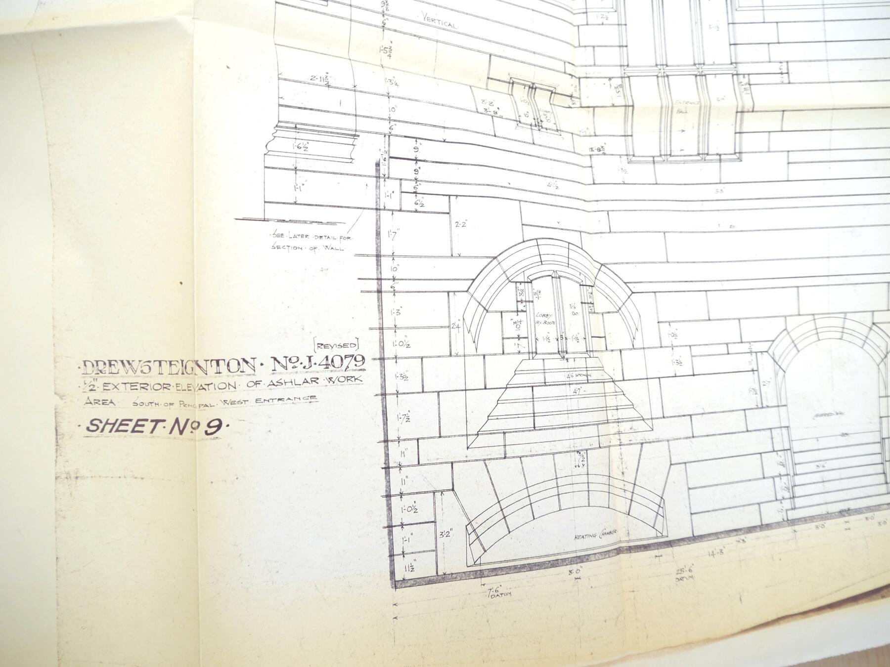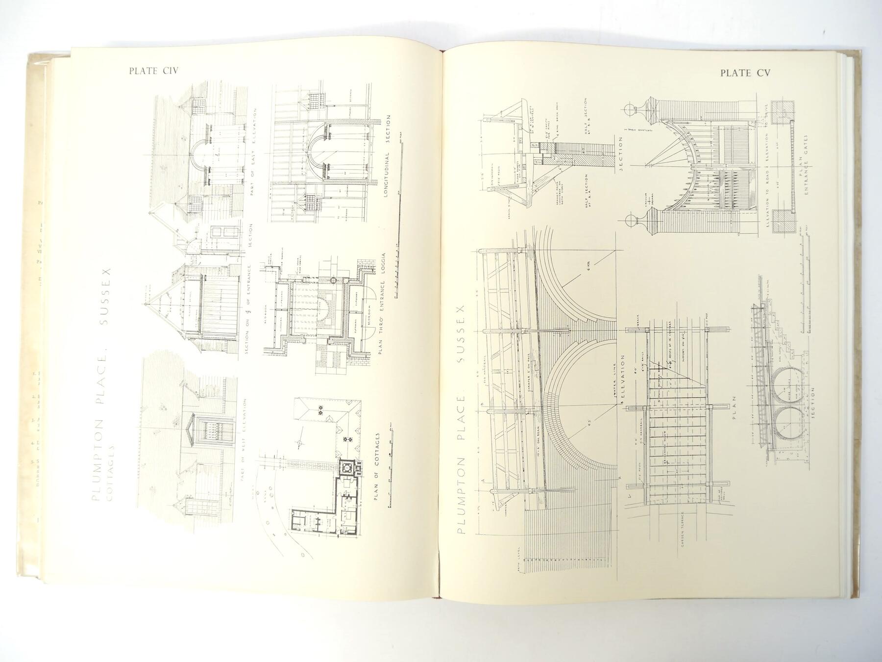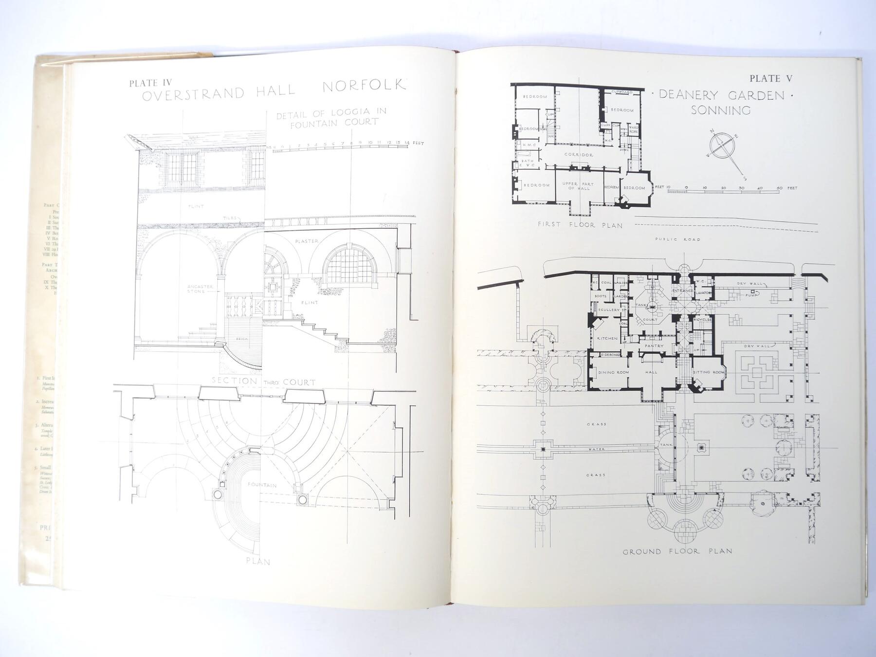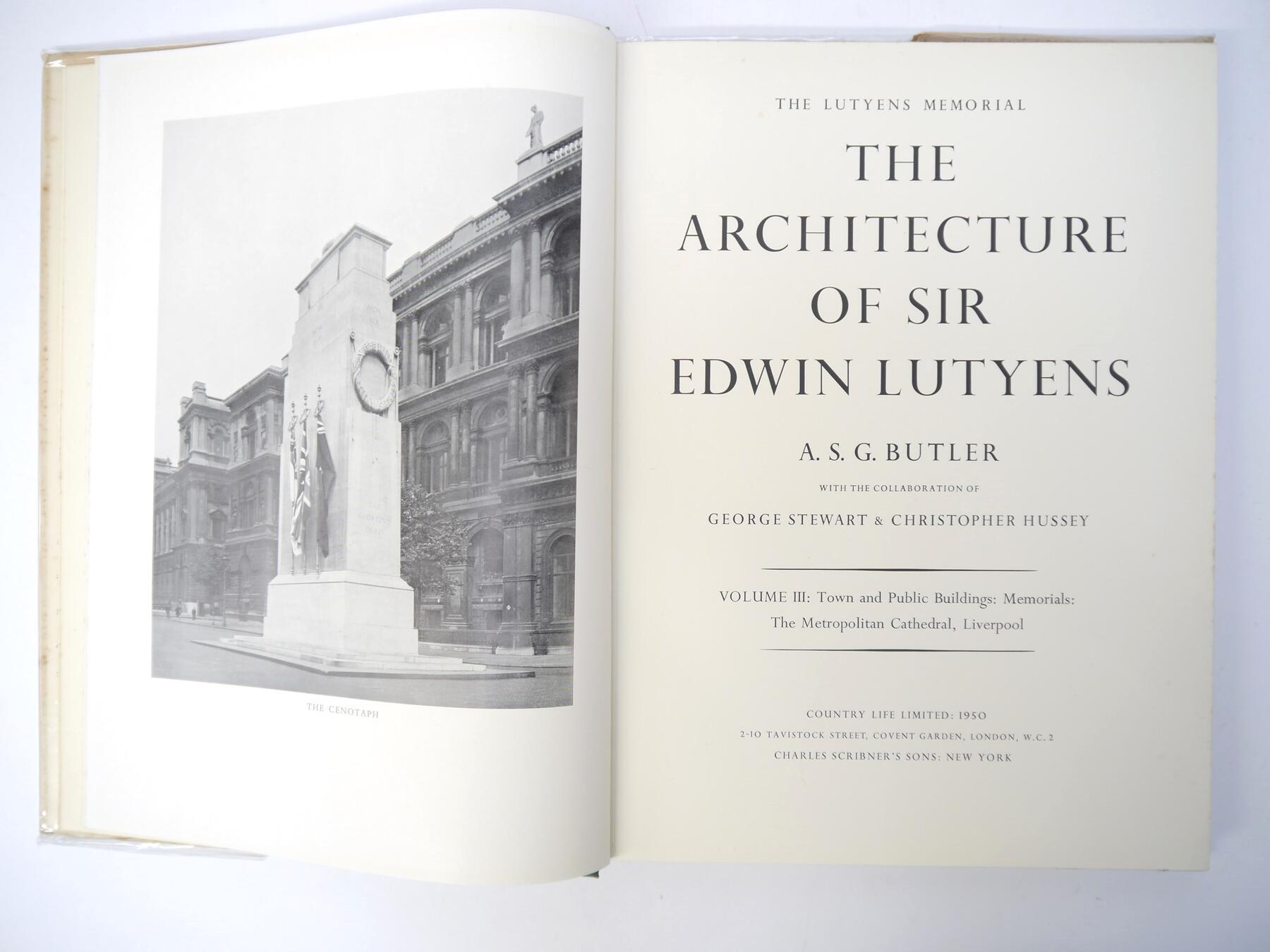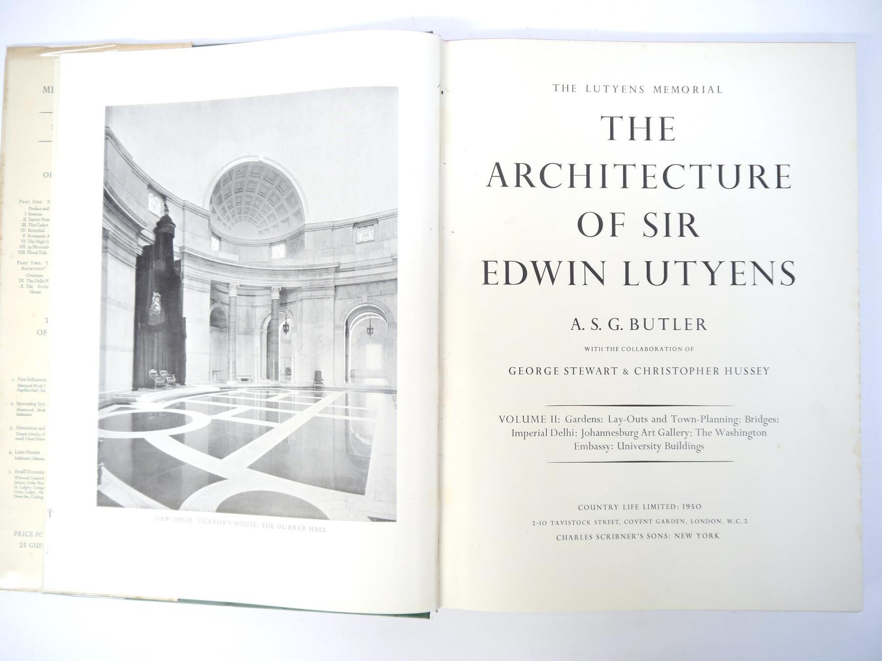 A.S.G. Butler: 'The Lutyens Memorial, The Architecture of Sir Edwin Lutyens', London, Country Life, 1950, 1st edition, 3 volumes, numerous monochrome plates and illustrations, many folding, folio, original green cloth gilt, dust wrappers (worn and with some part losses and repairs/restoration), armorial bookplates of William Iveson Croome, large folding facsimile copy of an original Lutyens architectural plan for Castle Drogo, near Drewsteignton, Devon, and 2010 invoice for books loosely inserted, provenance Ian Latter (3)