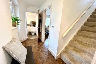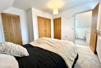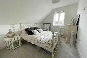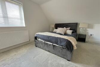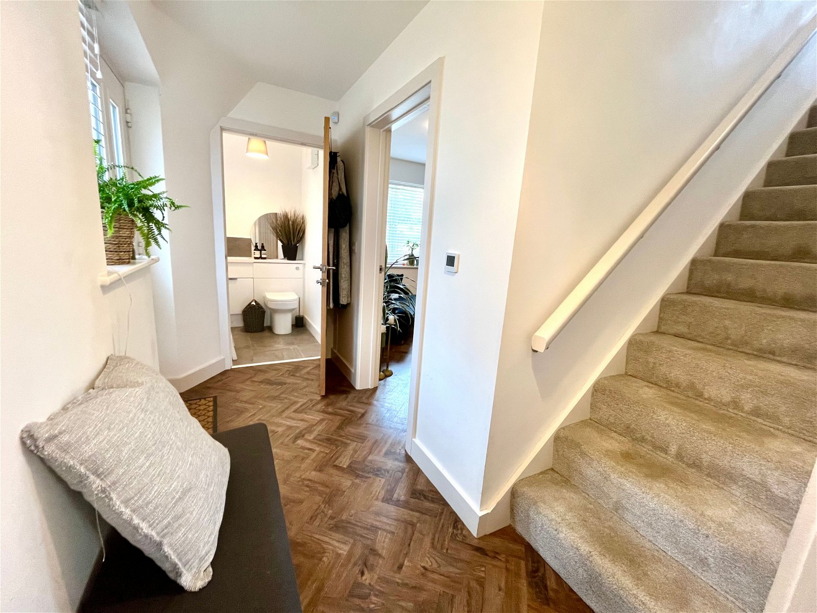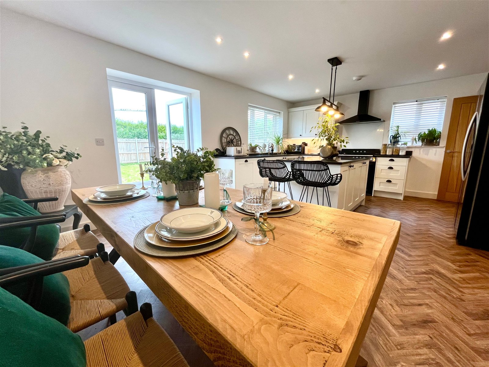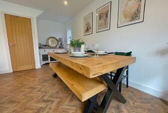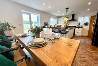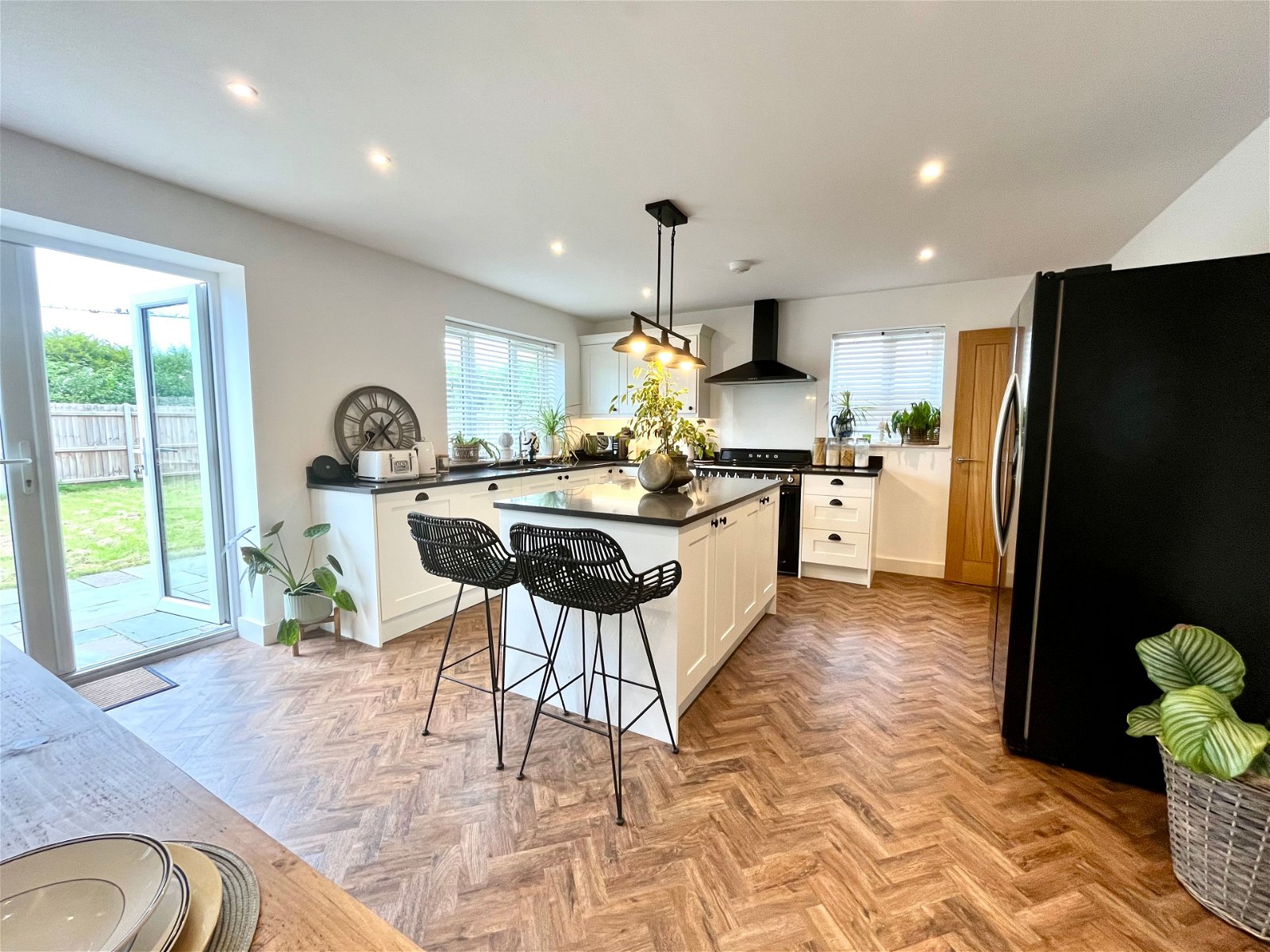 One of only 6 properties in a tucked away exclusive cul-de-sac in the heart of this popular village. The high spec build was completed in 2022. The ground floor is mainly laid to a striking herringbone LVT, the entrance hall makes way for a WC/cloak room and spacious sitting room. Most notably on this level is the striking kitchen/breakfast room. Fitted with bespoke wall and floor units and complemented by an central island with further storage units. The modern suite is topped with a marble surface and holds integrated dishwasher and bin stores. The kitchen currently utilises a high end SMEG range cooker and American style fridge/freezer available by separate negotiation. There is also a handy and dep under stairs storage cupboard, currently adapted to house the washing machine for a useful laundry room. Dining area making use of the views through the double doors to the private enclosed rear garden.