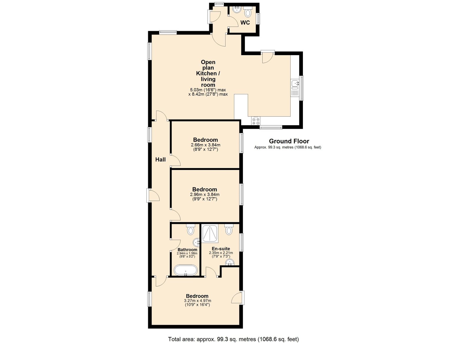 Freshly renovated by the current owner, De Havilland isn’t your average looking property. Aesthetically unique, the property sits on over half and acre and this really sets it apart from other single storey homes. Inside, the sociable, open plan living, in the shape of a spacious kitchen / living room with high ceilings is a great place to spend time with friends and family. In total 1066 square ft of accommodation also comprises 3 bedrooms, main bathroom and a stylish en-suite shower room - a ‘must have’ feature for the majority of buyers.