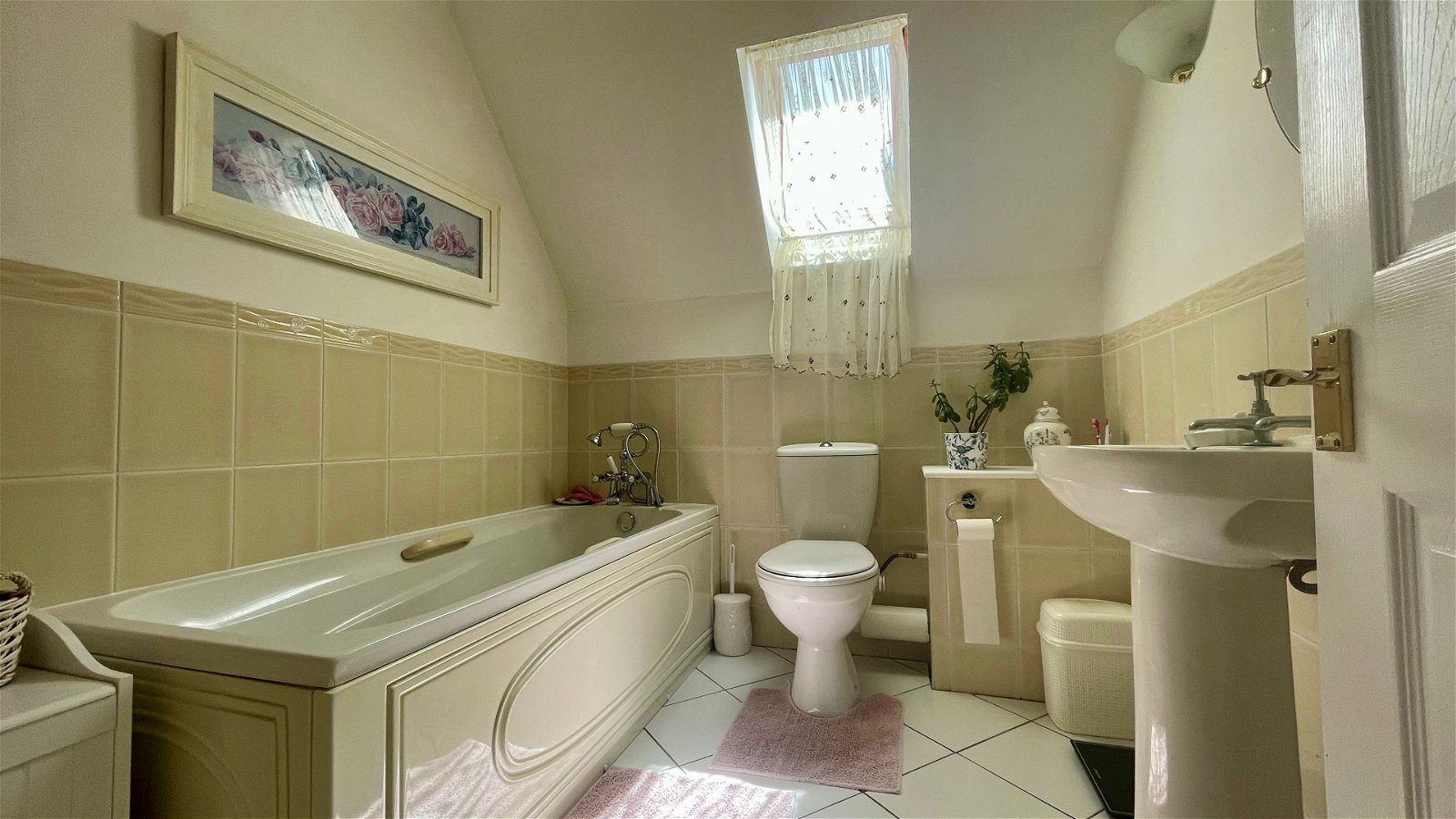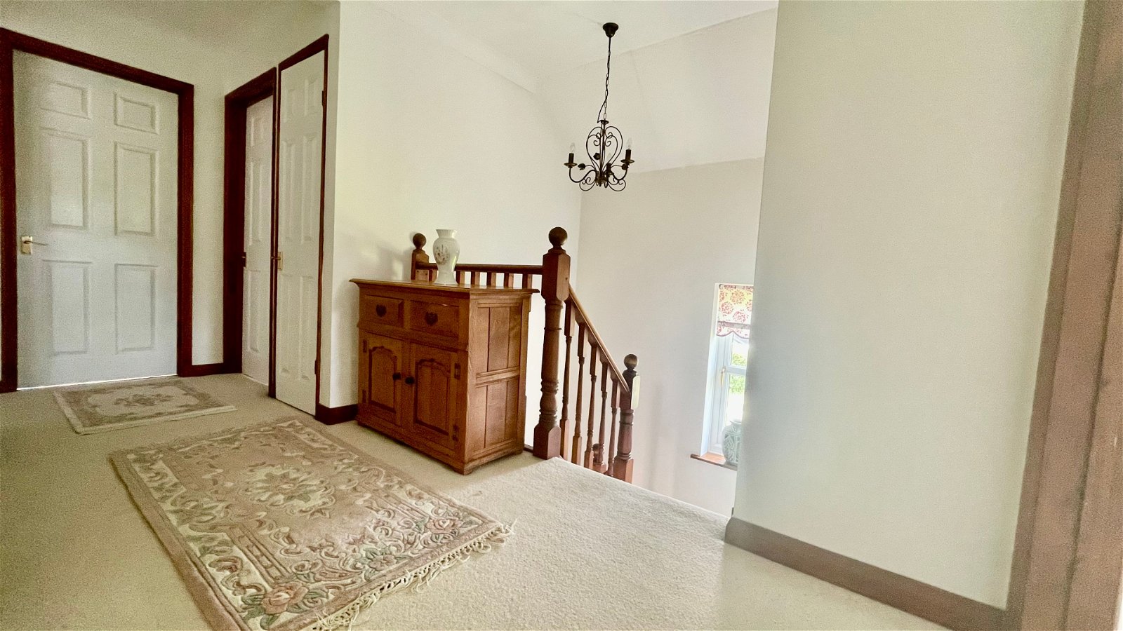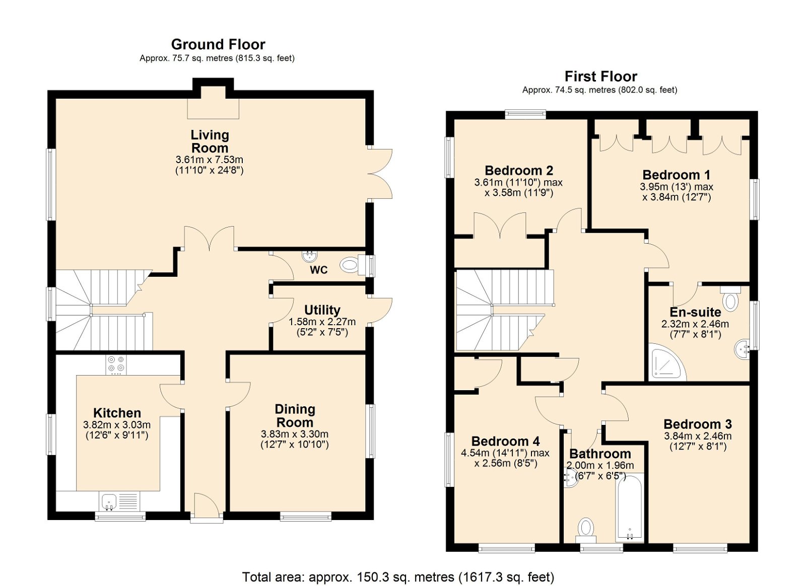 Inside, the entrance hall leads to two spacious reception rooms, the kitchen, a WC, and a utility room, with stairs rising to the first floor. The first reception room is bright and spacious with a window to the side, an inset wood burner, and French doors to the rear garden. The second reception room has double-aspect windows, offering space for dining or other uses. T from a wide entrance hall. The kitchen features double-aspect windows, a range of wall and floor units, a halogen hob with extractor, an electric oven, and a ceramic sink with drainer and mixer tap, along with space for white goods. The utility room includes a stainless steel sink, space for a large fridge freezer, and plumbing for a washing machine, with an external door to the garden. A convenient WC with a low-level toilet and hand wash basin completes the ground floor. The first-floor landing, with a side window, provides access to four bedrooms and the main bathroom. There is also the welcome addition of a large airing cupboard. The principal bedroom includes three double built-in wardrobes and an en-suite with a corner shower cubicle, low-level WC, and hand wash basin over a vanity unit. The additional three bedrooms are all spacious, with one potentially serving as an office and a useful double fitted wardrobe. The fully tiled main bathroom includes a paneled bath with a handheld shower attachment, a low-level WC, and a hand wash basin. Overall, this property offers a spacious and versatile family home with ample outdoor space in a private setting.
