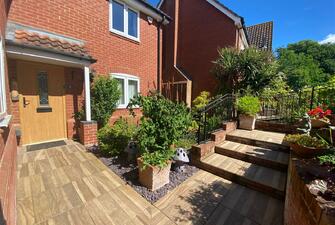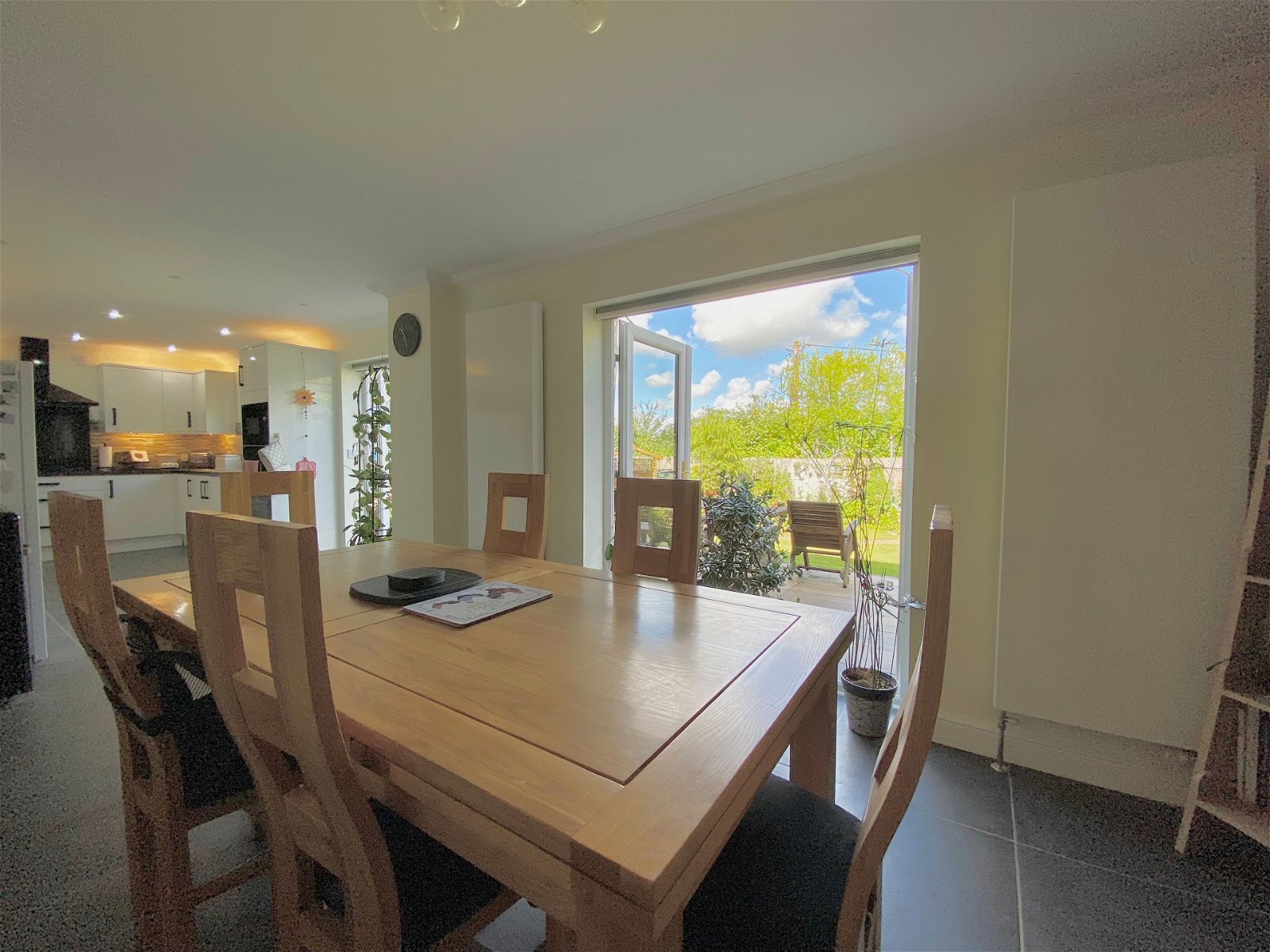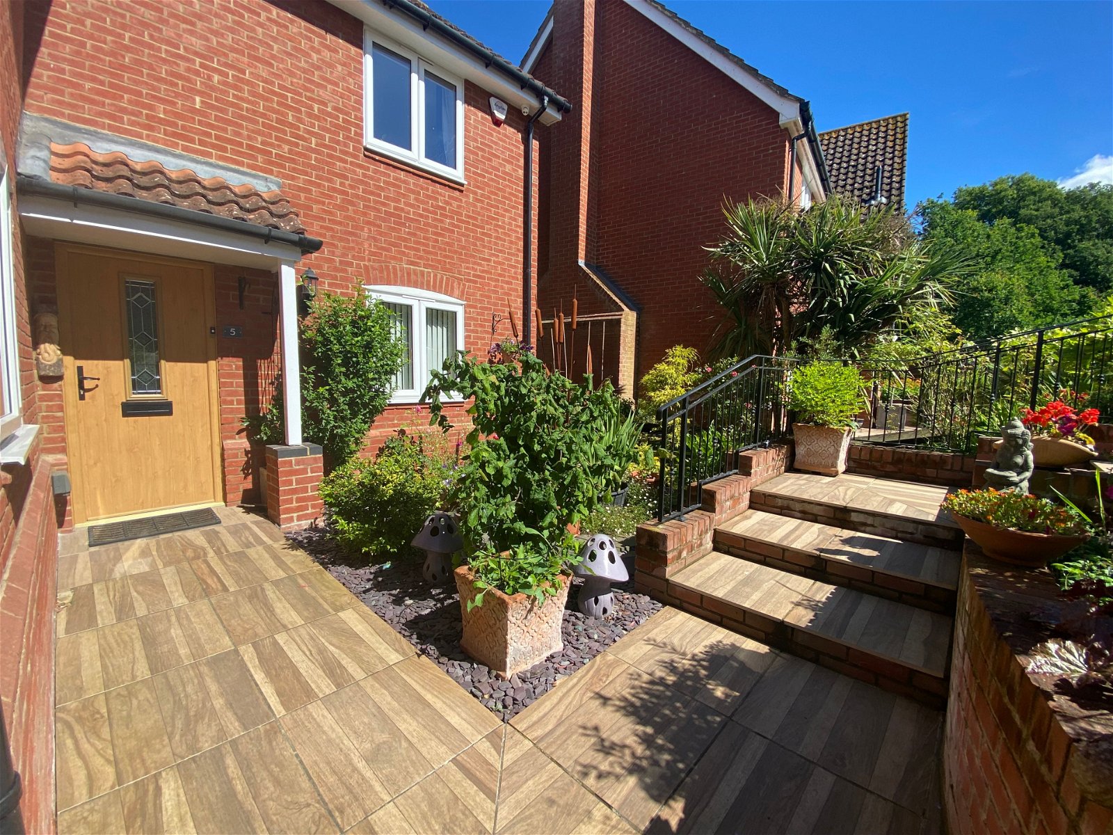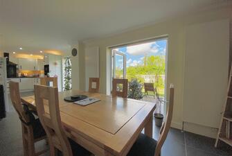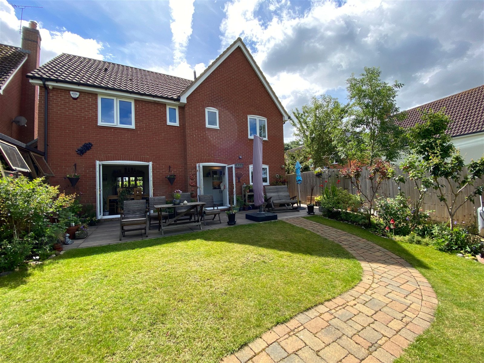 To the front of the the property there is a double garage with parking to the front. Shallow steps, tastefully finished with wood effect porcelain tiles lead down to the sheltered front garden with pedestrian access to the side and leading to the rear. To the rear there the garden is accessed from multiple points on the ground floor. Two sets of French doors open out to a recently installed wood effect porcelain patio perfect for alfresco dining in the summer months. The rear garden is mainly laid to lawn with mature shrub borders. A footpath winds down to the rear of the garden offering an alternative shady spot to sit.