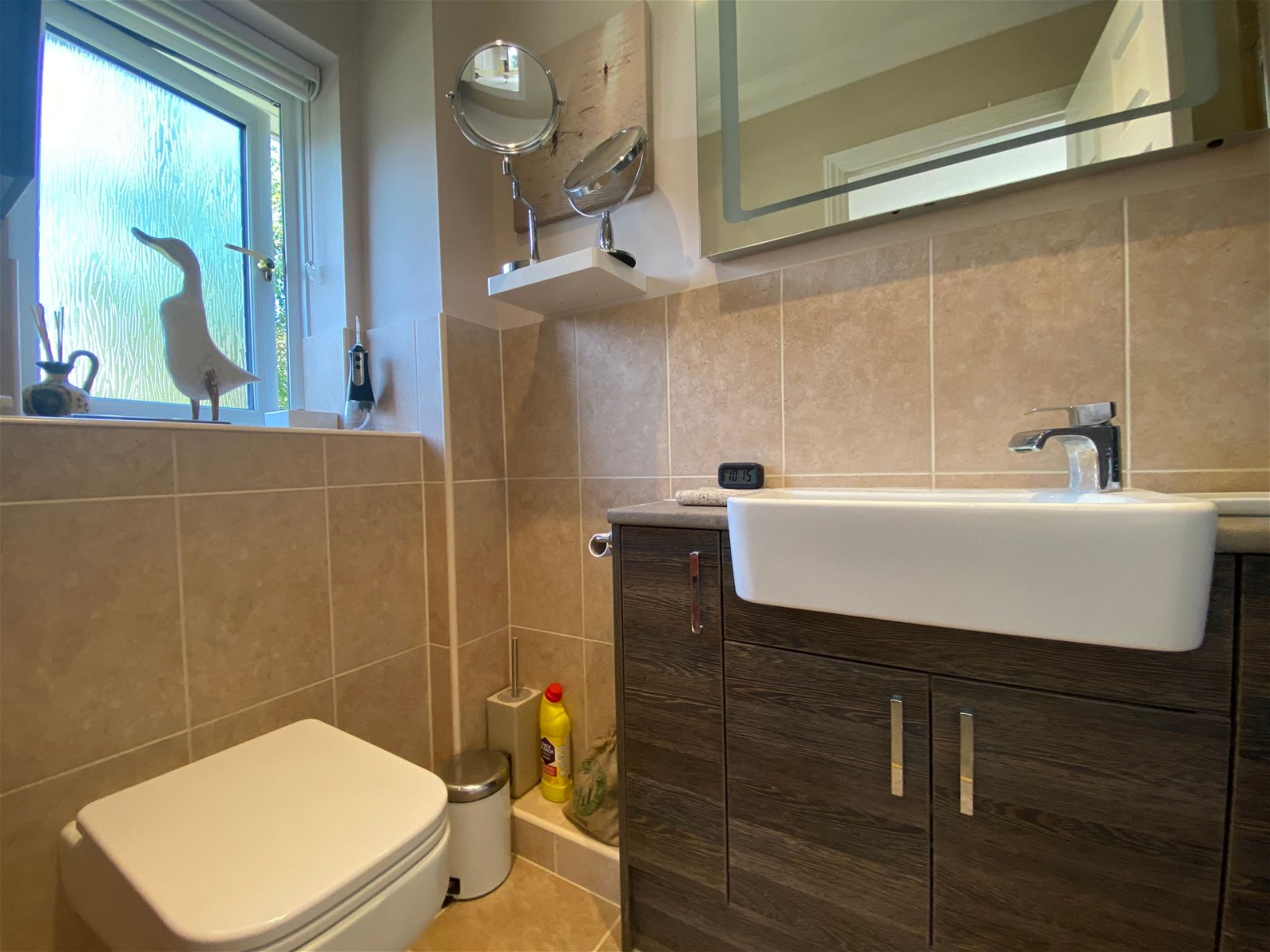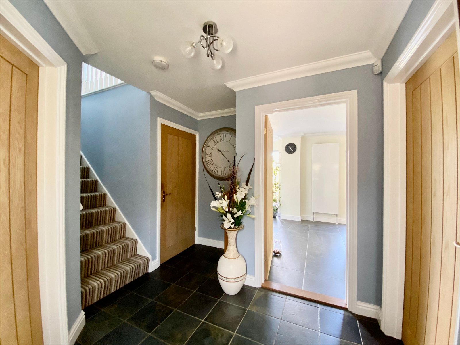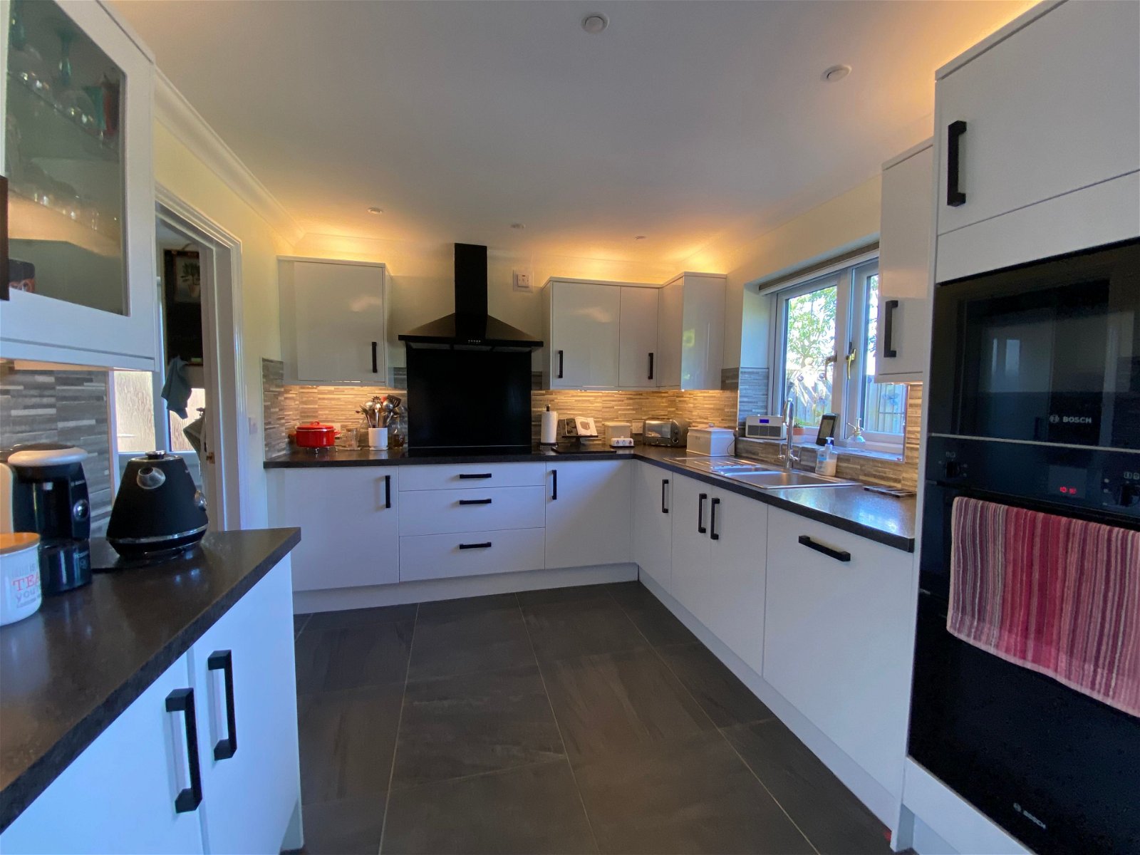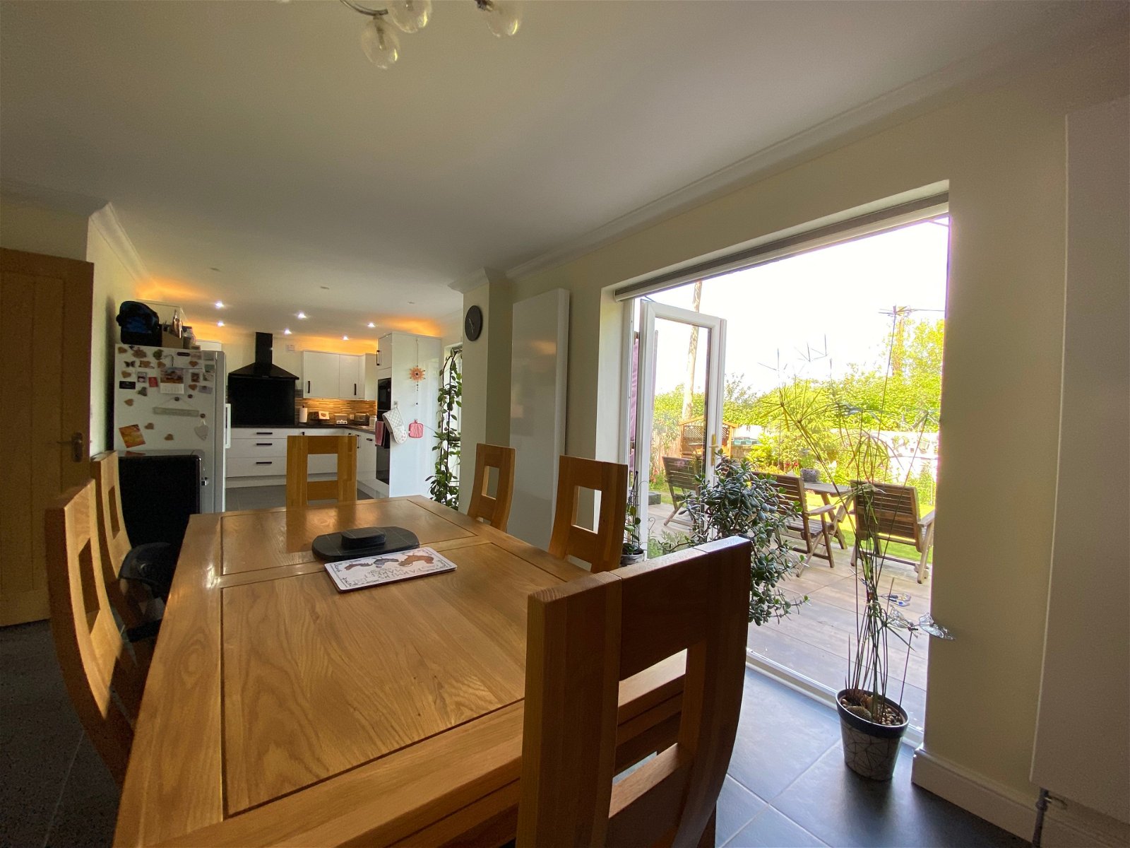 To the front of the the property there is a double garage with parking to the front. Shallow steps, tastefully finished with wood effect porcelain tiles lead down to the sheltered front garden with pedestrian access to the side and leading to the rear. To the rear there the garden is accessed from multiple points on the ground floor. Two sets of French doors open out to a recently installed wood effect porcelain patio perfect for alfresco dining in the summer months. The rear garden is mainly laid to lawn with mature shrub borders. A footpath winds down to the rear of the garden offering an alternative shady spot to sit.