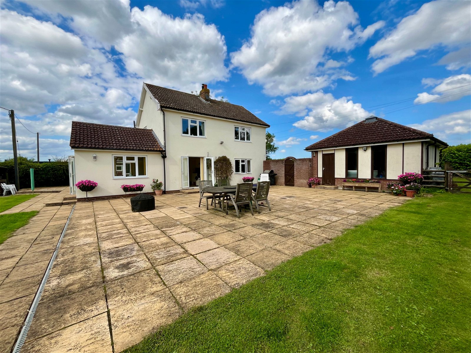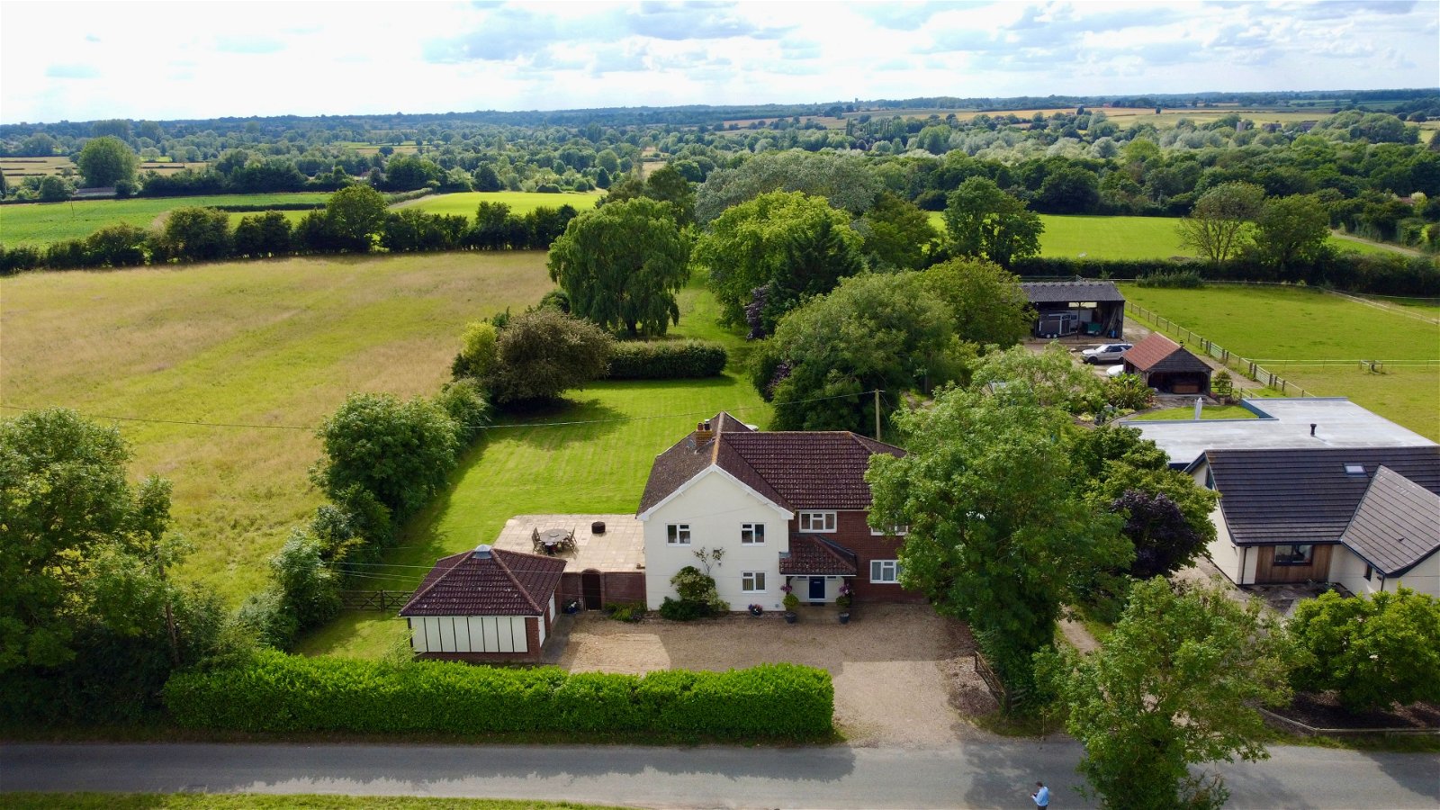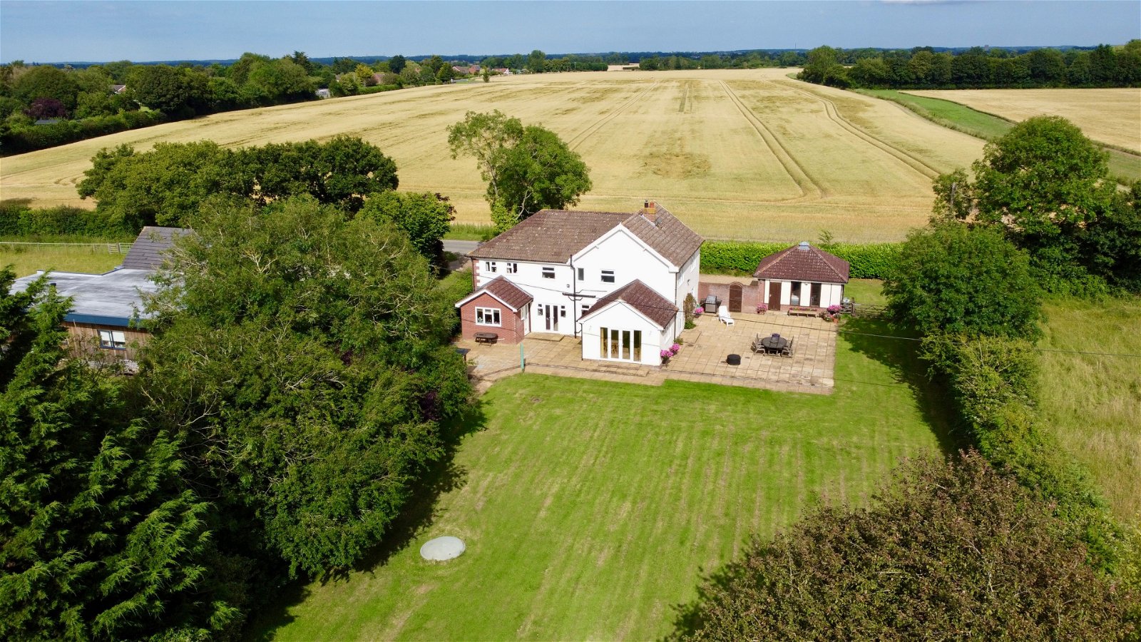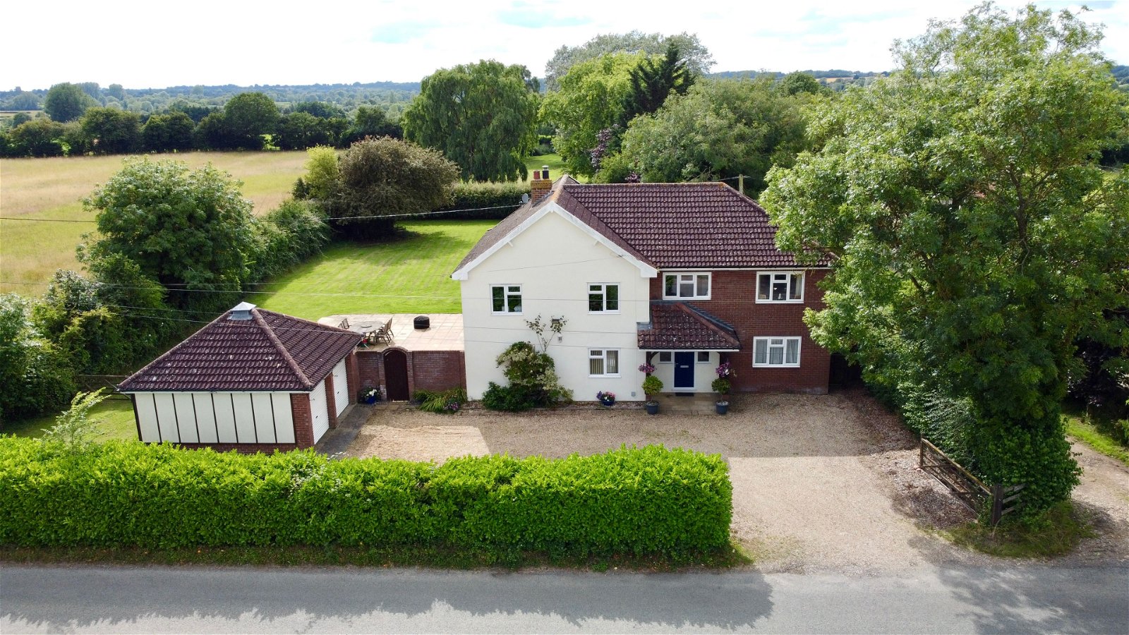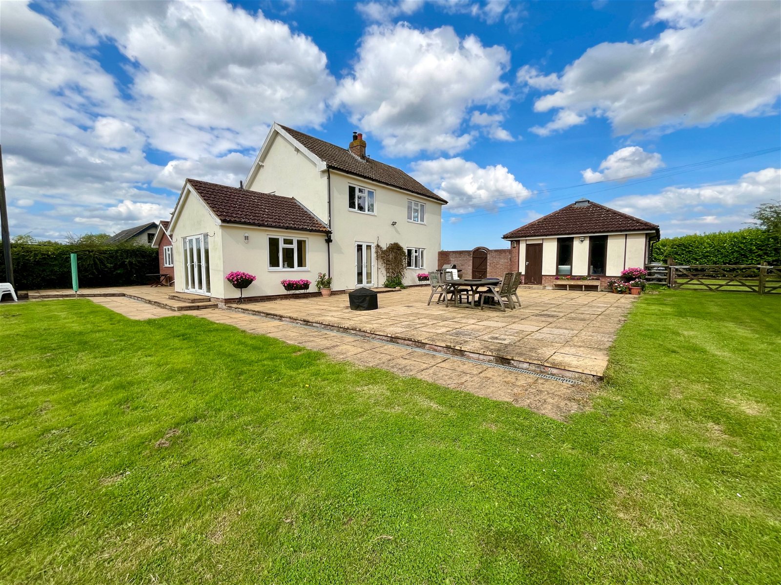 With stunning field views to the front and 1.3 Acres of land, this country property offers an amazing opportunity for a growing family and potential for equestrian use. To the front of the property there is generous shingle driveway providing off road parking for several vehicles and access to the detached vaulted garage with roller doors, power and light. To the rear of the property there is a mature garden with extensive patio and brick built shed. The boundary is mainly made up from mature hedgerow and trees.
