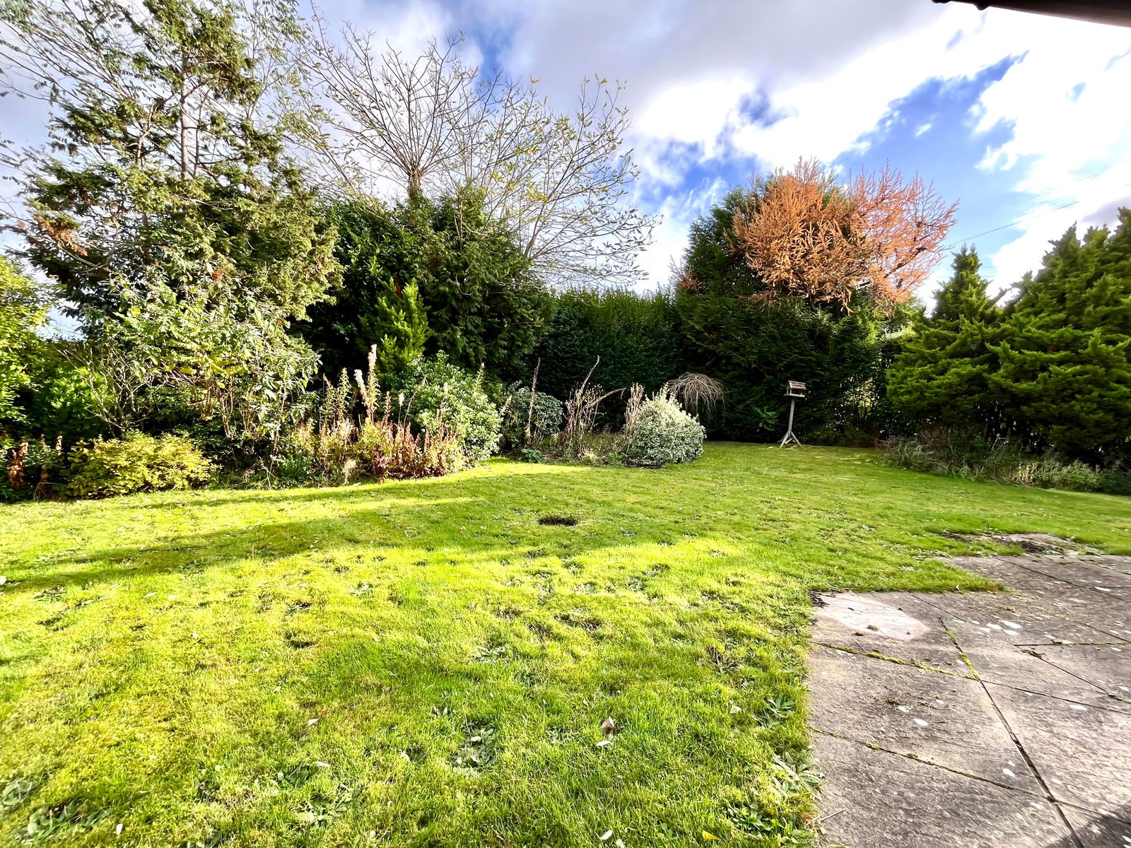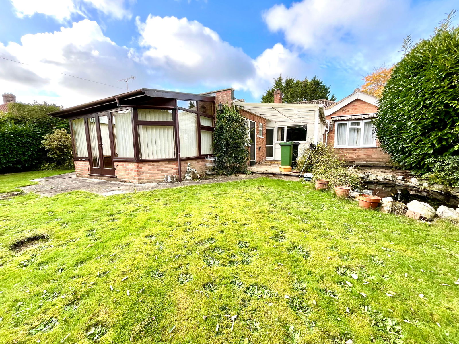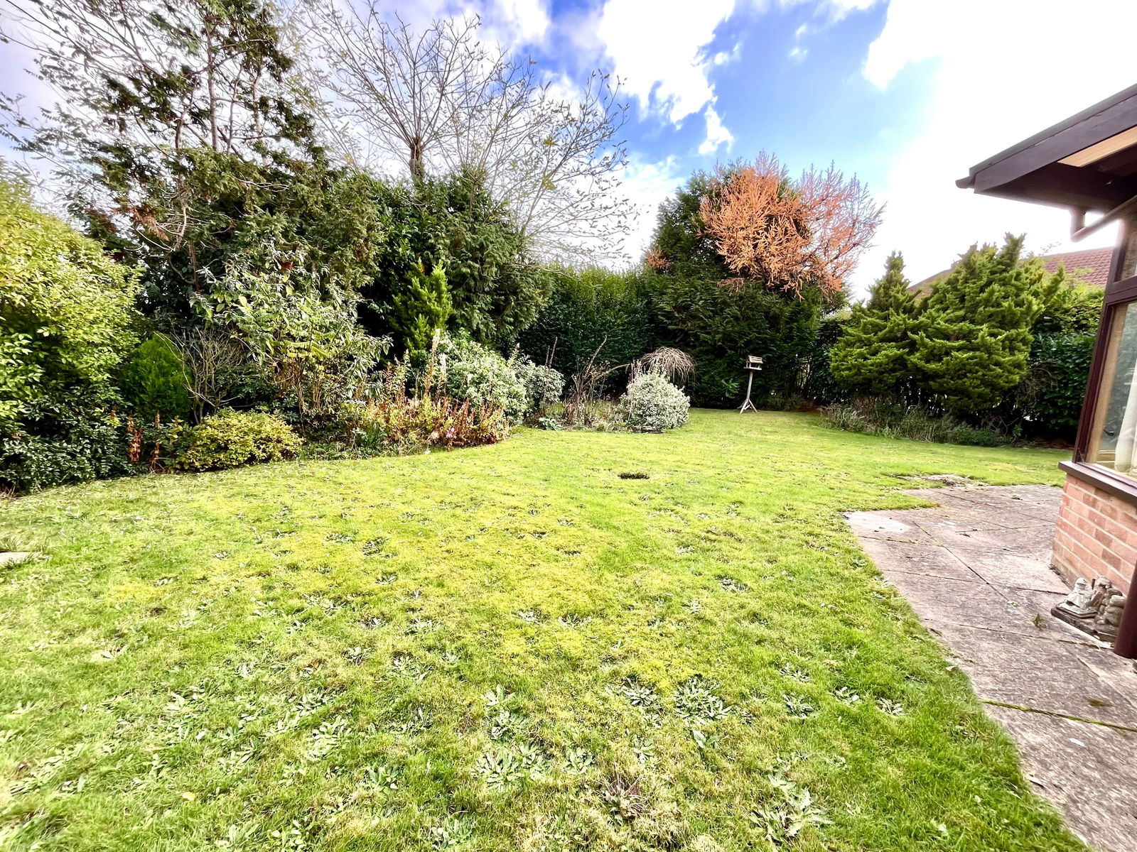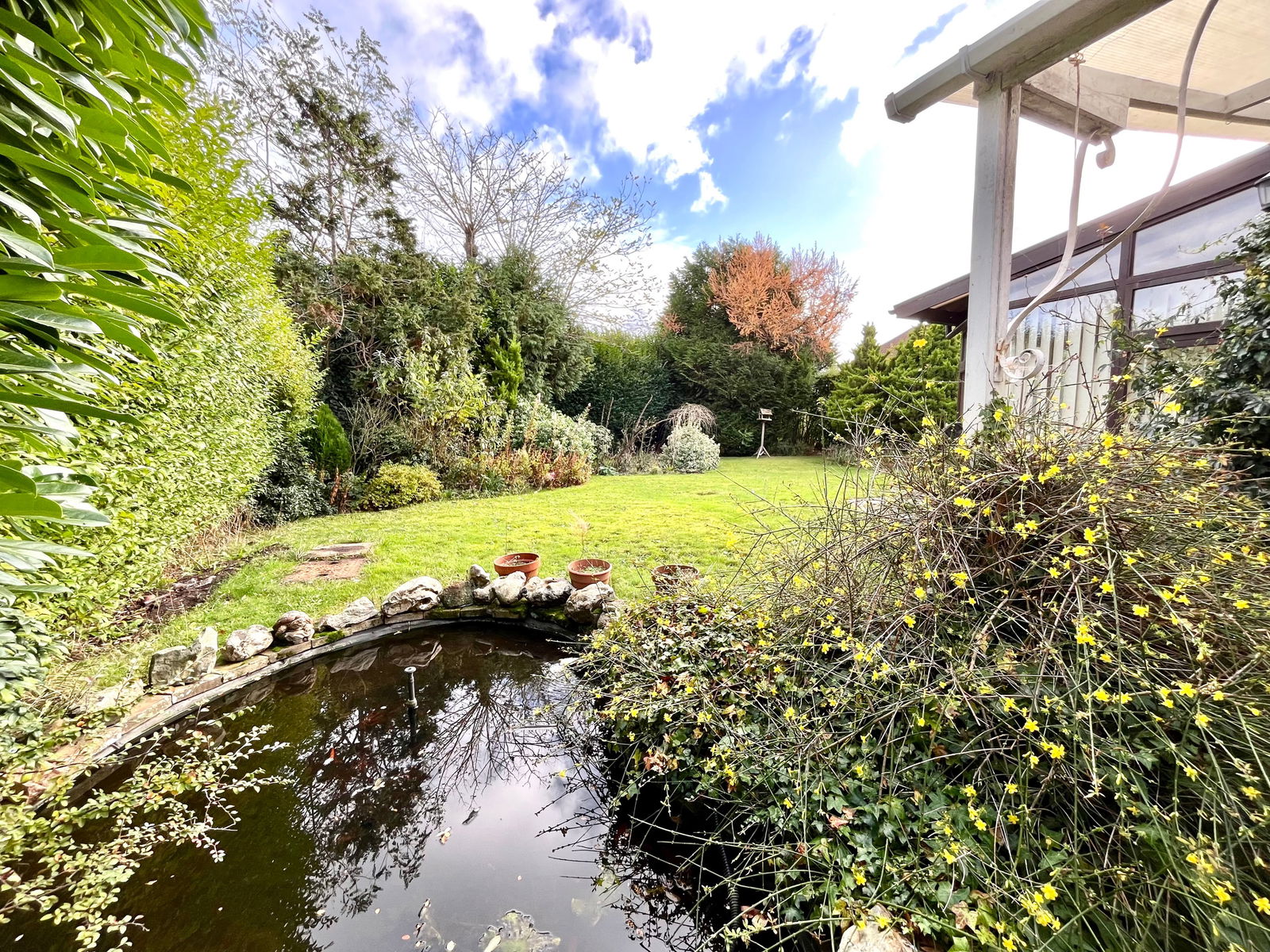 The bungalow sits on a corner plot with gardens to both the front and rear. The rear garden is particularly appealing, with a charming ornamental pond adding character to the mature landscaping. A driveway provides off-road parking and gives access to the garage.