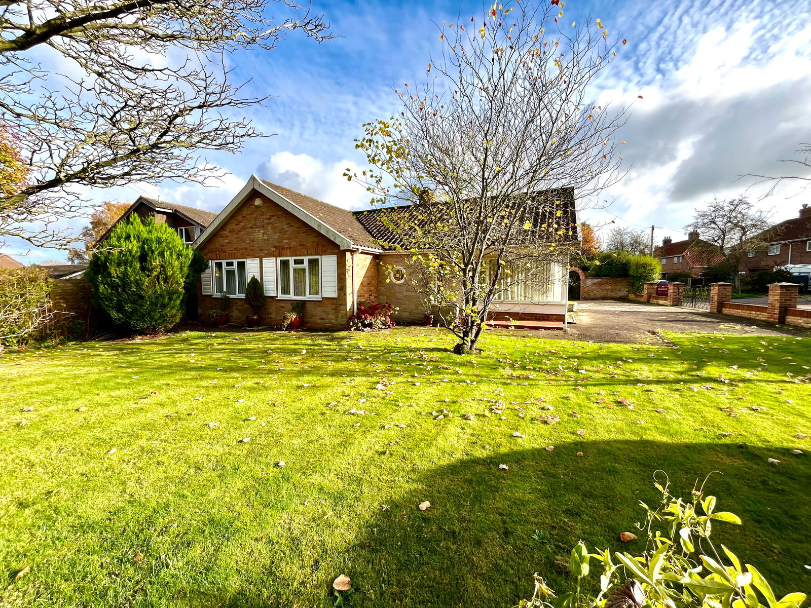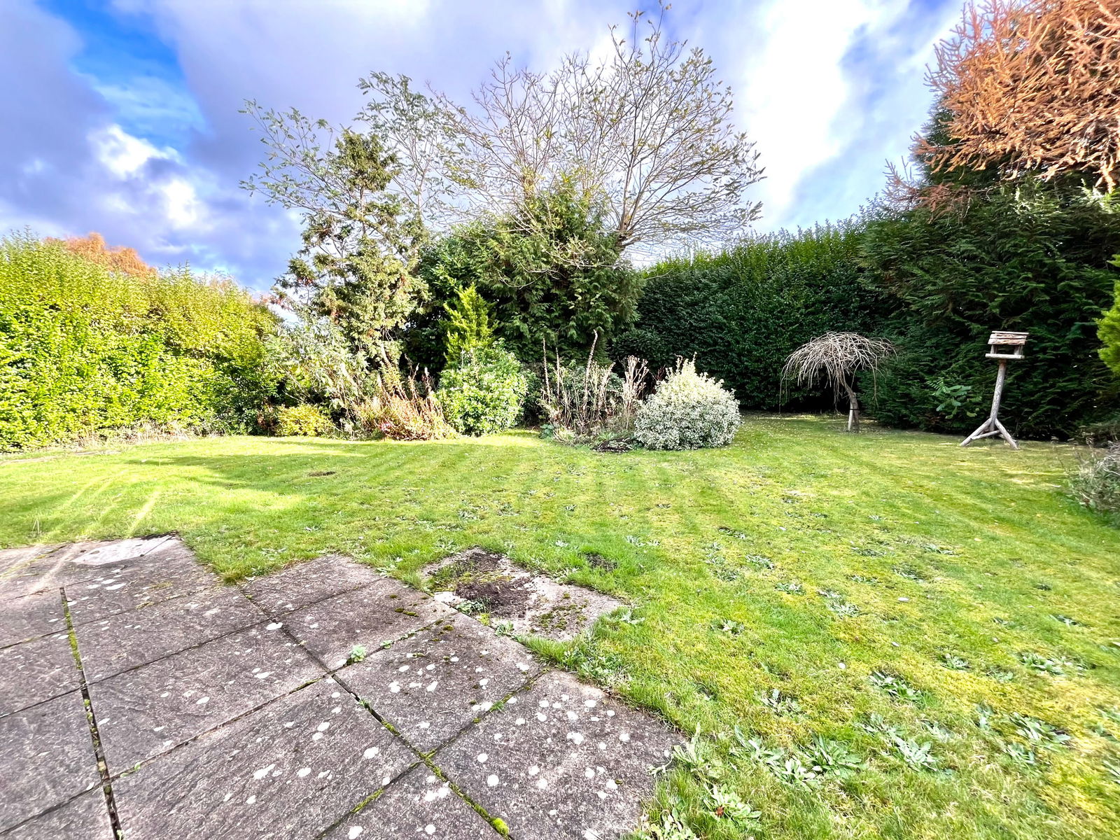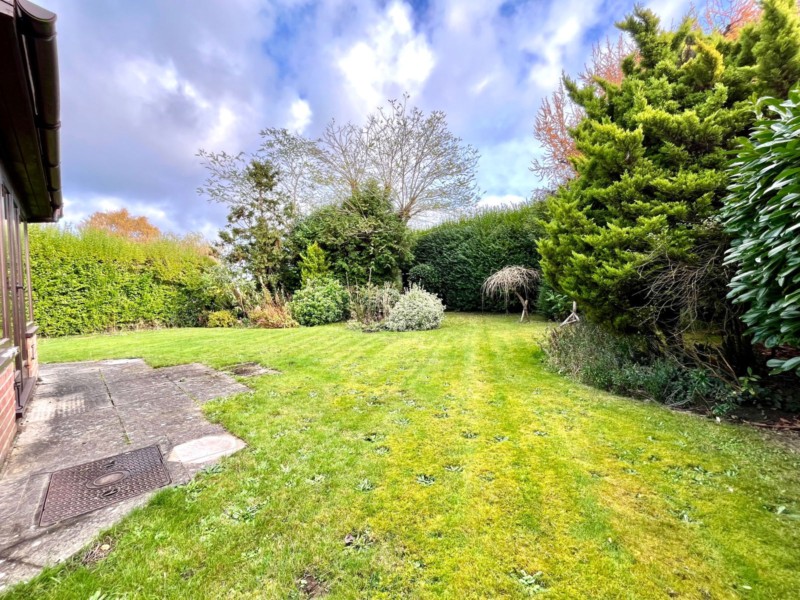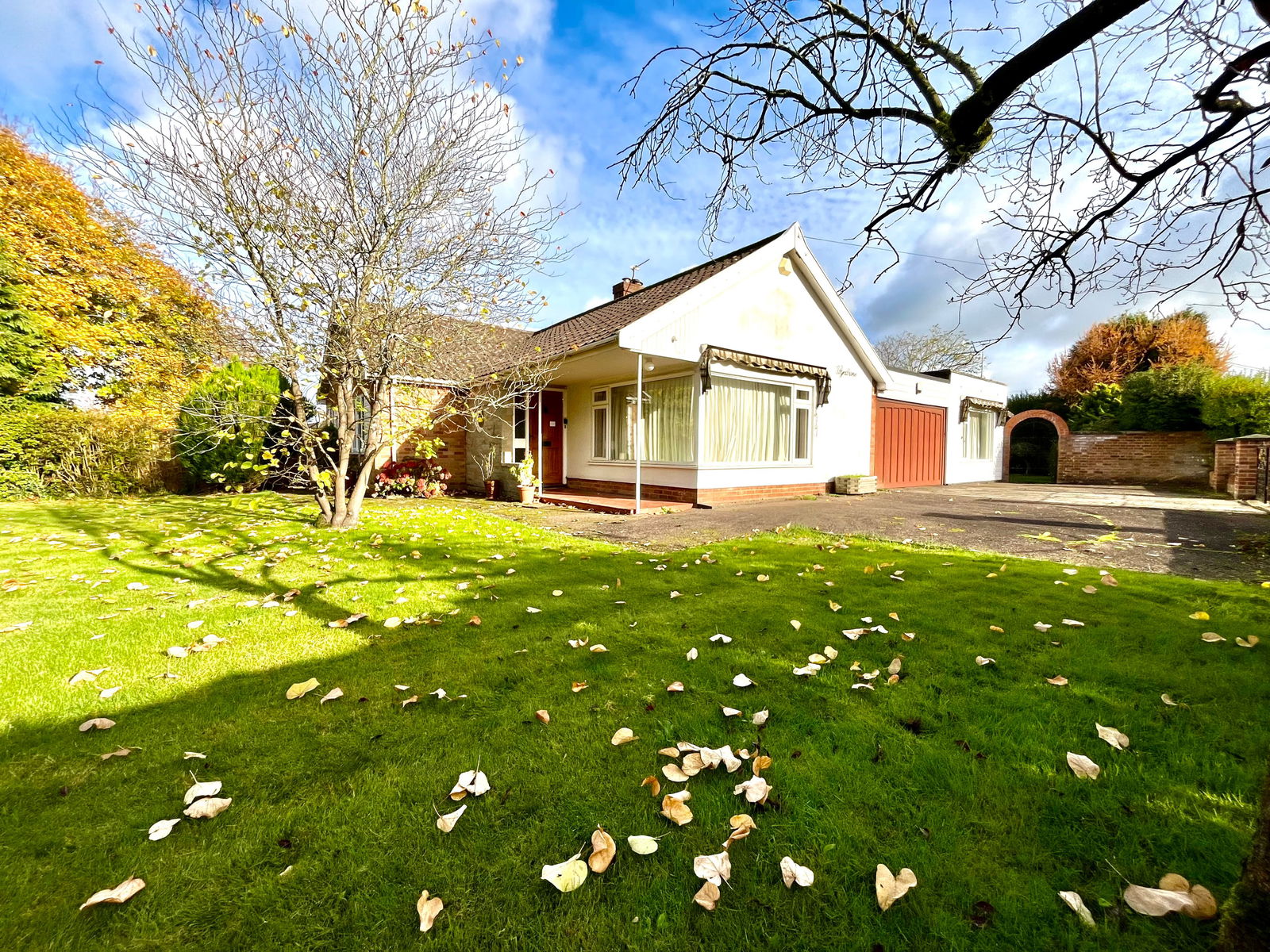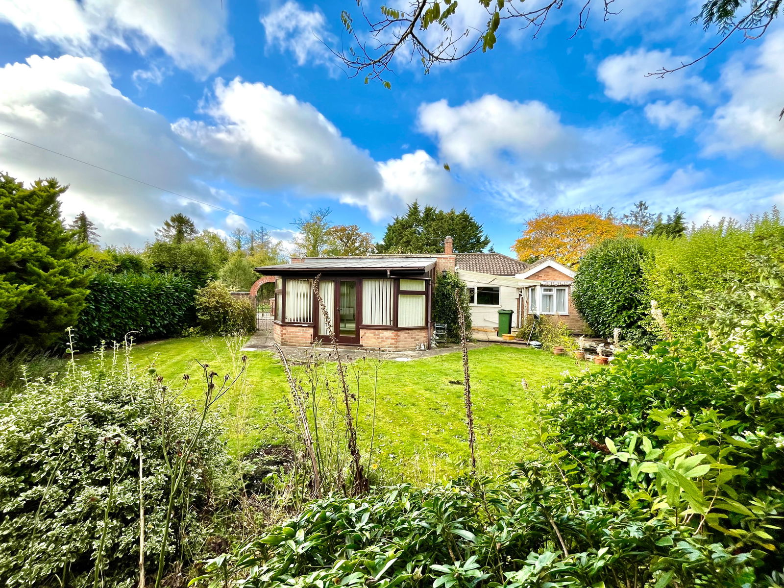 The bungalow sits on a corner plot with gardens to both the front and rear. The rear garden is particularly appealing, with a charming ornamental pond adding character to the mature landscaping. A driveway provides off-road parking and gives access to the garage.