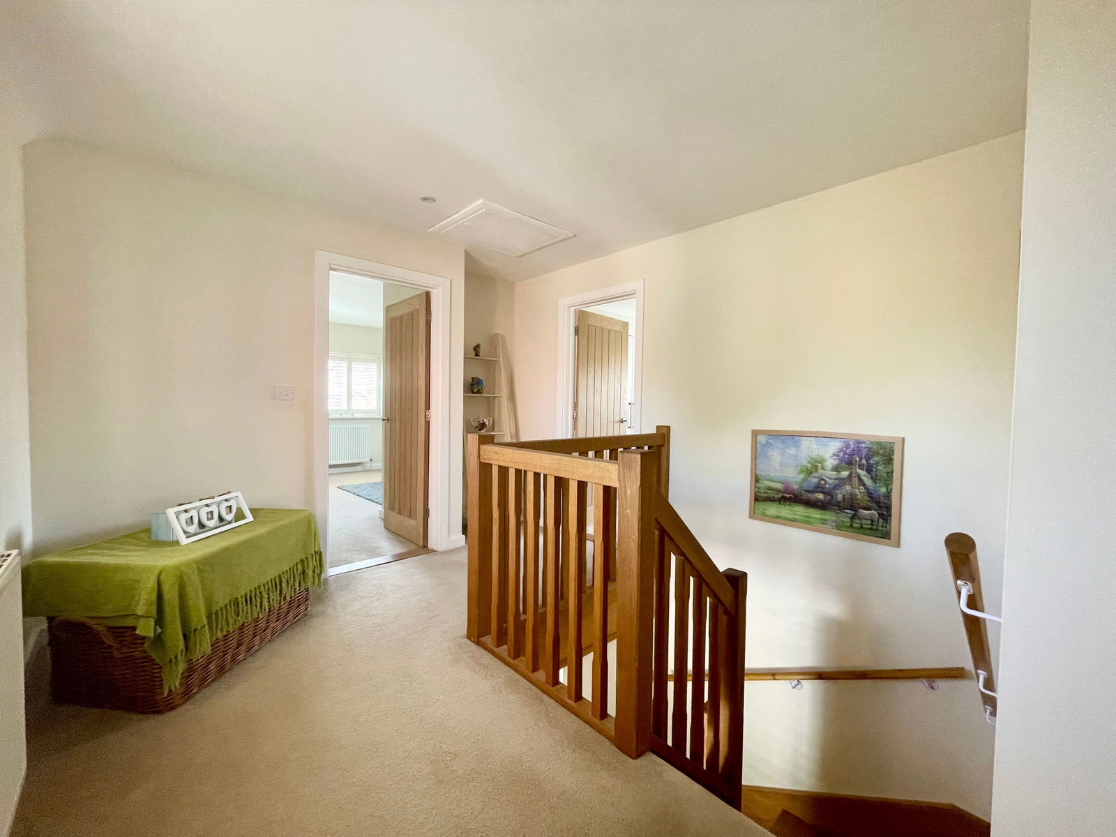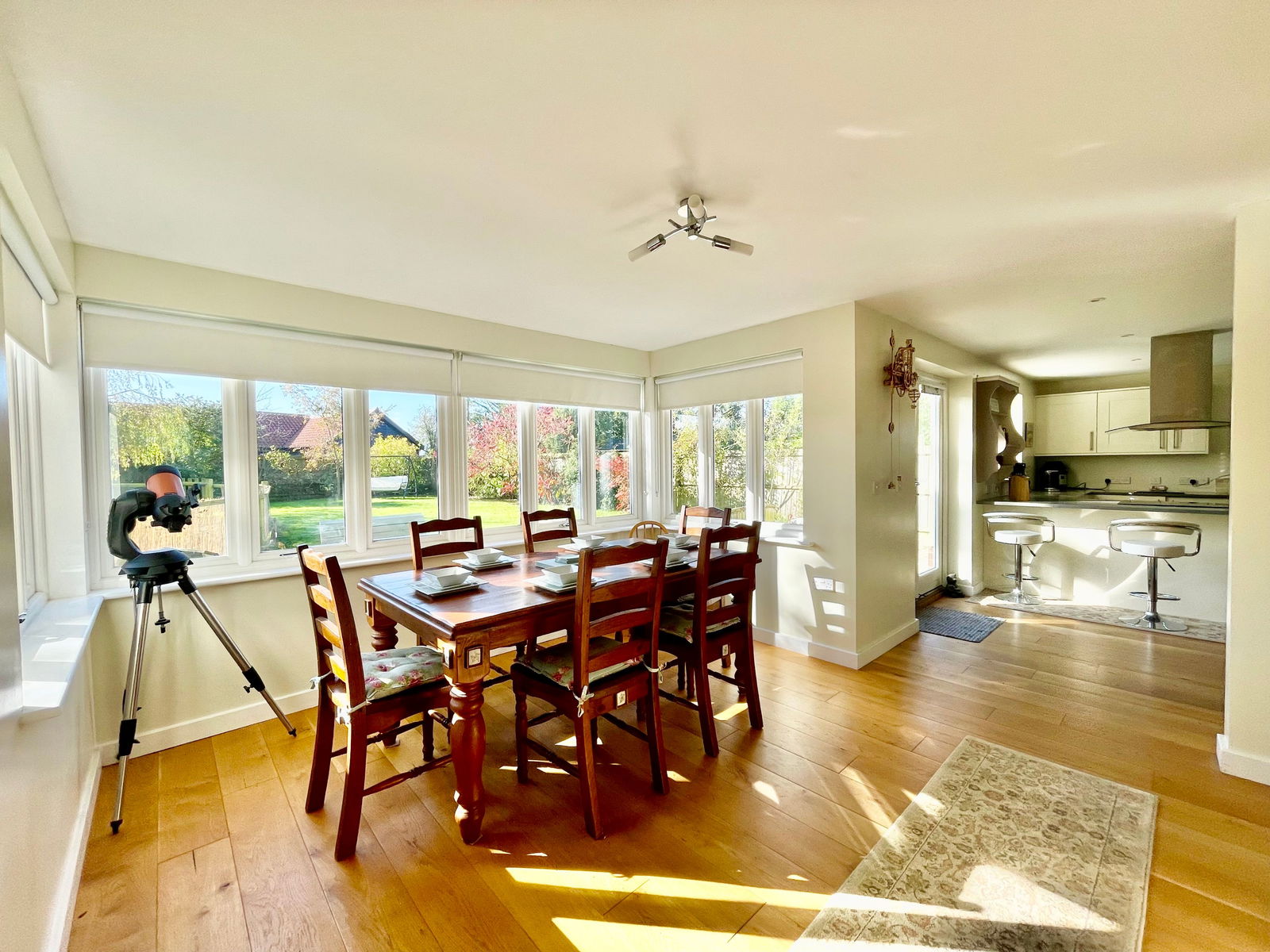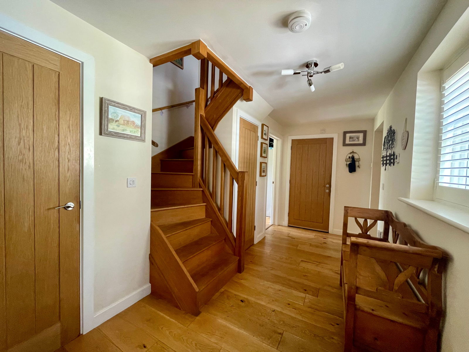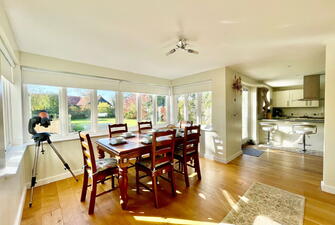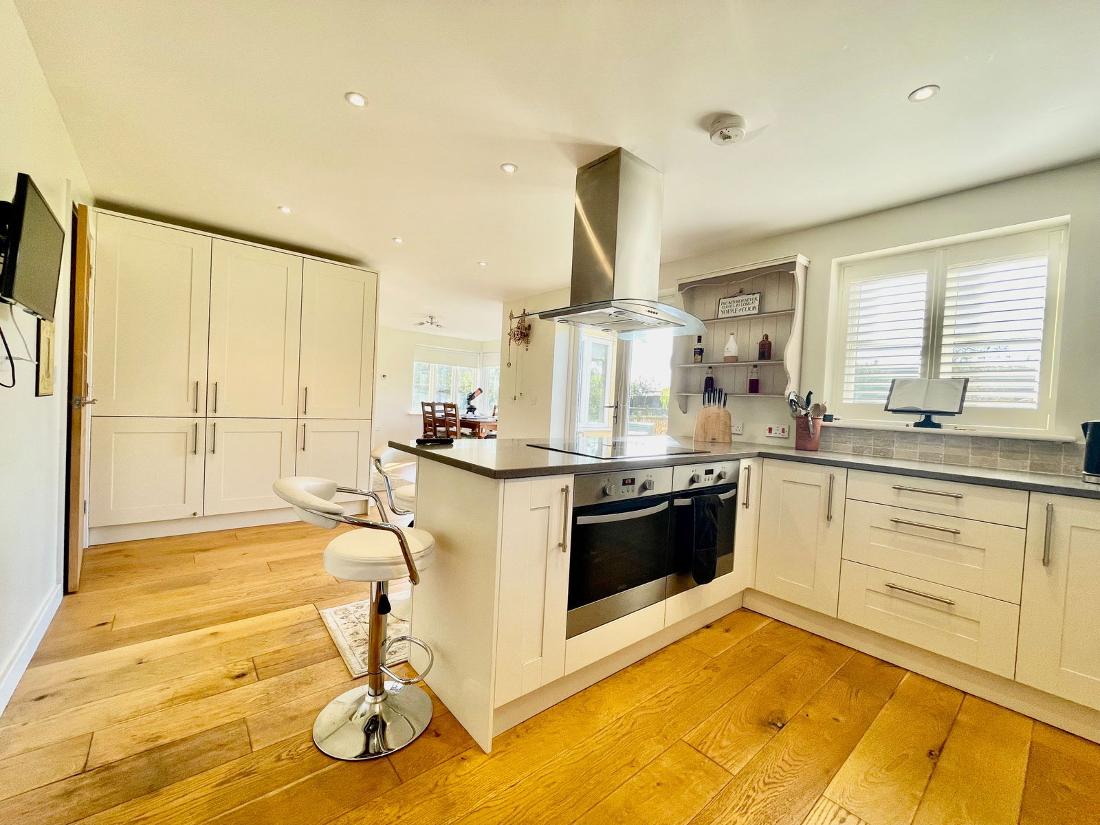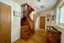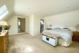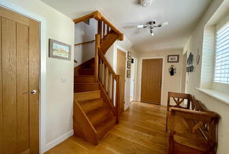 Nursery End is a unique detached family residence, thoughtfully crafted with an emphasis on energy efficiency. The property features advanced sustainable technologies, including photovoltaic panels and air source heating, which are validated by its impressive Energy Performance Certificate. The home exudes quality from the moment you step inside, with underfloor-heated oak flooring on the ground level and a beautifully hand-crafted oak staircase that stands as a testament to its excellent build. The ground floor layout is well-considered, offering a smooth flow between rooms that enhances the spacious entrance hall, making it an integral part of the living space. The open plan Kitchen/Dining room offer a sociable space to entertain or host family meals. The modern well equipped kitchen offers a range of floor level and wall mounted cupbourds and intergrated dishwasher and fridge freezer. There is welcome addition of a useful utility room with butler sink. The first floor mirrors this sense of space with a large landing area, capable of housing additional furniture if needed, and serves four generously sized double bedrooms, two of which have en-suite facilities. The design is also commendable for its ample built-in storage options, including wardrobes and cupboards, which are cleverly integrated throughout. Although the construction is modern, the house pays homage to traditional farmhouse architecture with its tall pitched roof and classic lines. The rear of the house is particularly striking, featuring a full-height bay window that not only adds character but also creates a grand dining space that flows naturally into the kitchen area. Additionally, the property includes an integrated double garage with convenient internal access, making it a functional and versatile space for both parking and storage needs.