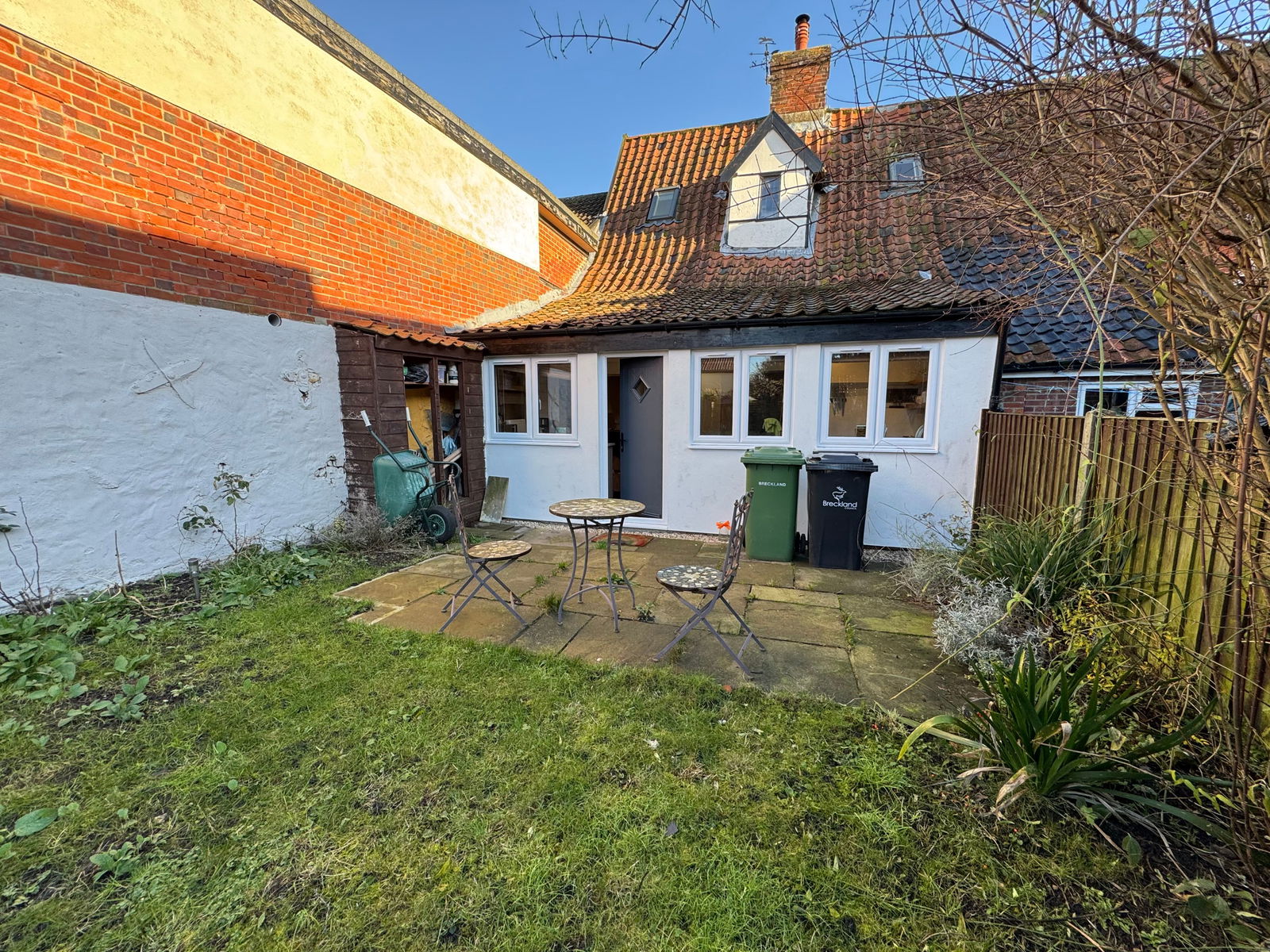 A small rear garden with paved patio area which is to be fenced with willow fencing panels. Parking is on-road of which there is plenty around the village green.
