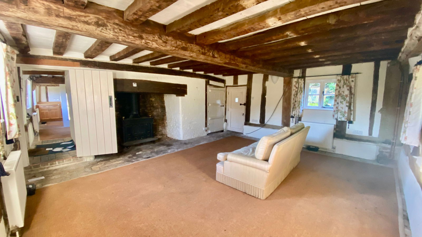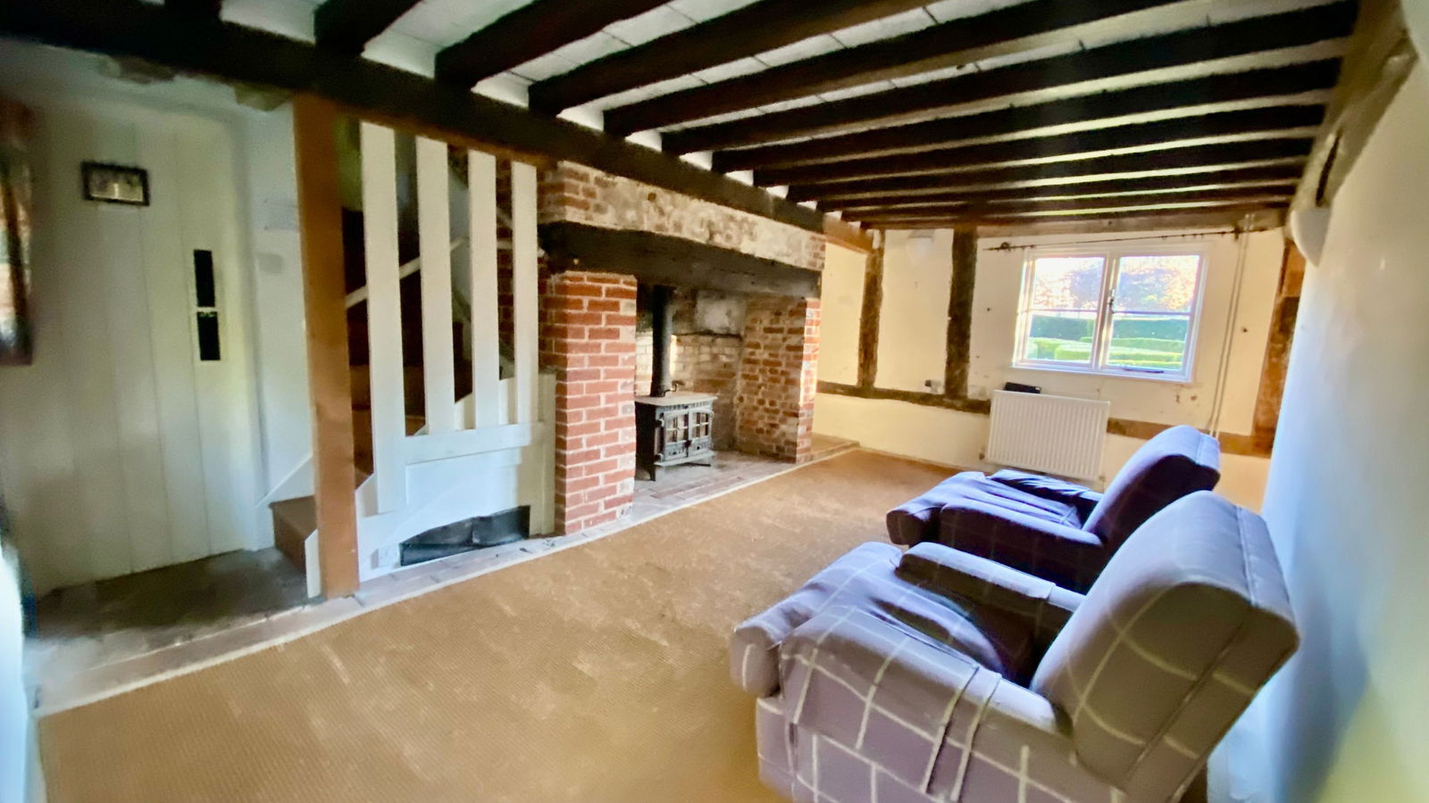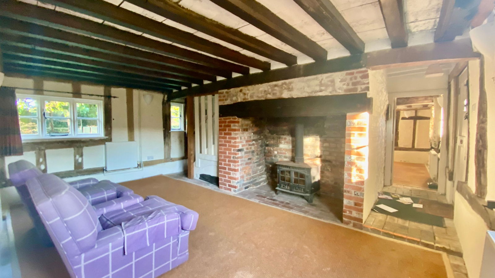 The heavy timber front door, featuring a spy glass, opens into an entrance lobby with attractive brick-laid flooring that continues throughout the ground floor. The living room is a triple-aspect space of great character, featuring exposed timber framing, heavy ceiling beams, and mullion windows. The focal point is an impressive 7-foot-wide inglenook fireplace with a bressummer and bridging beam. A door leads from the living room to the rear garden.