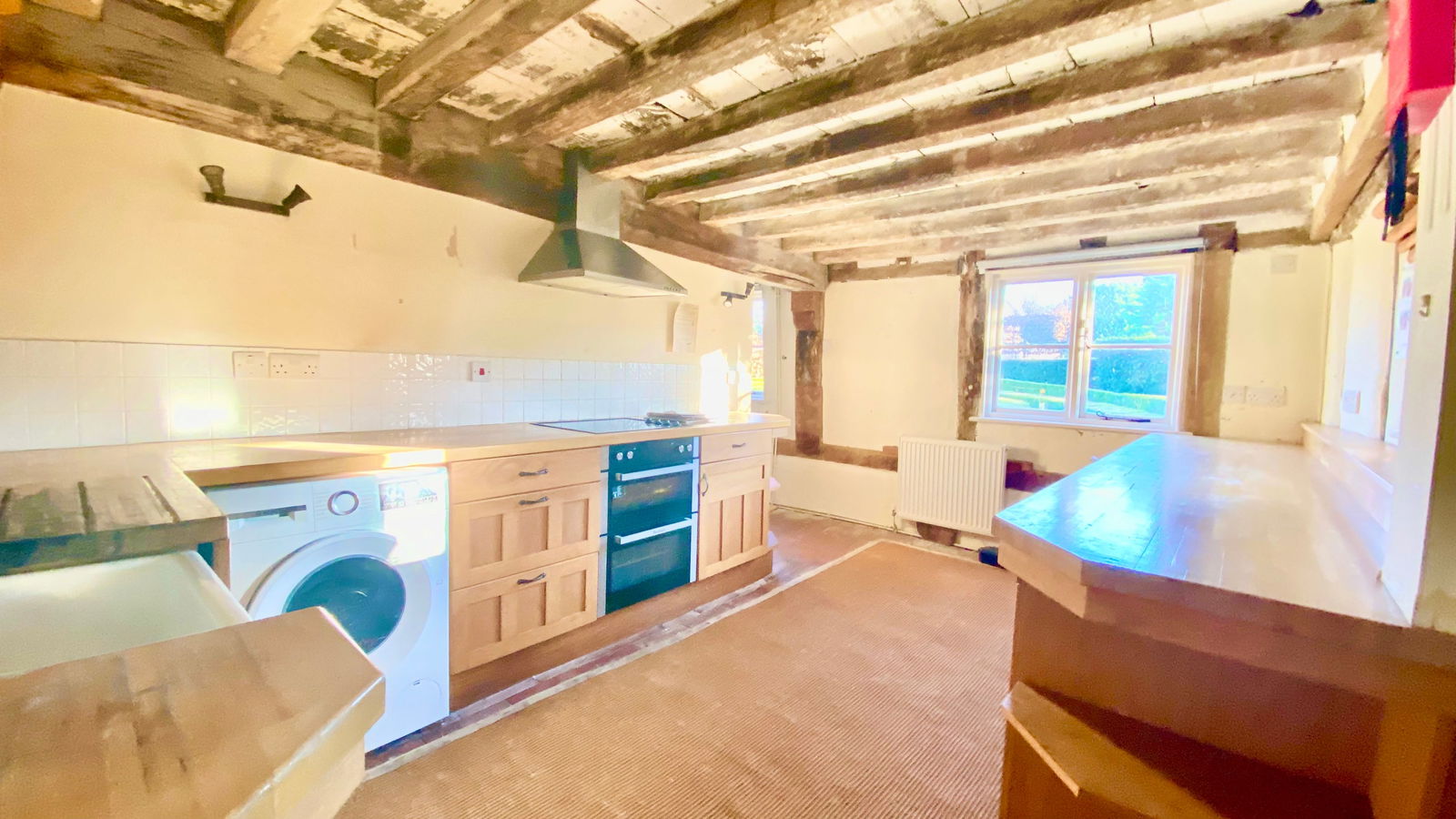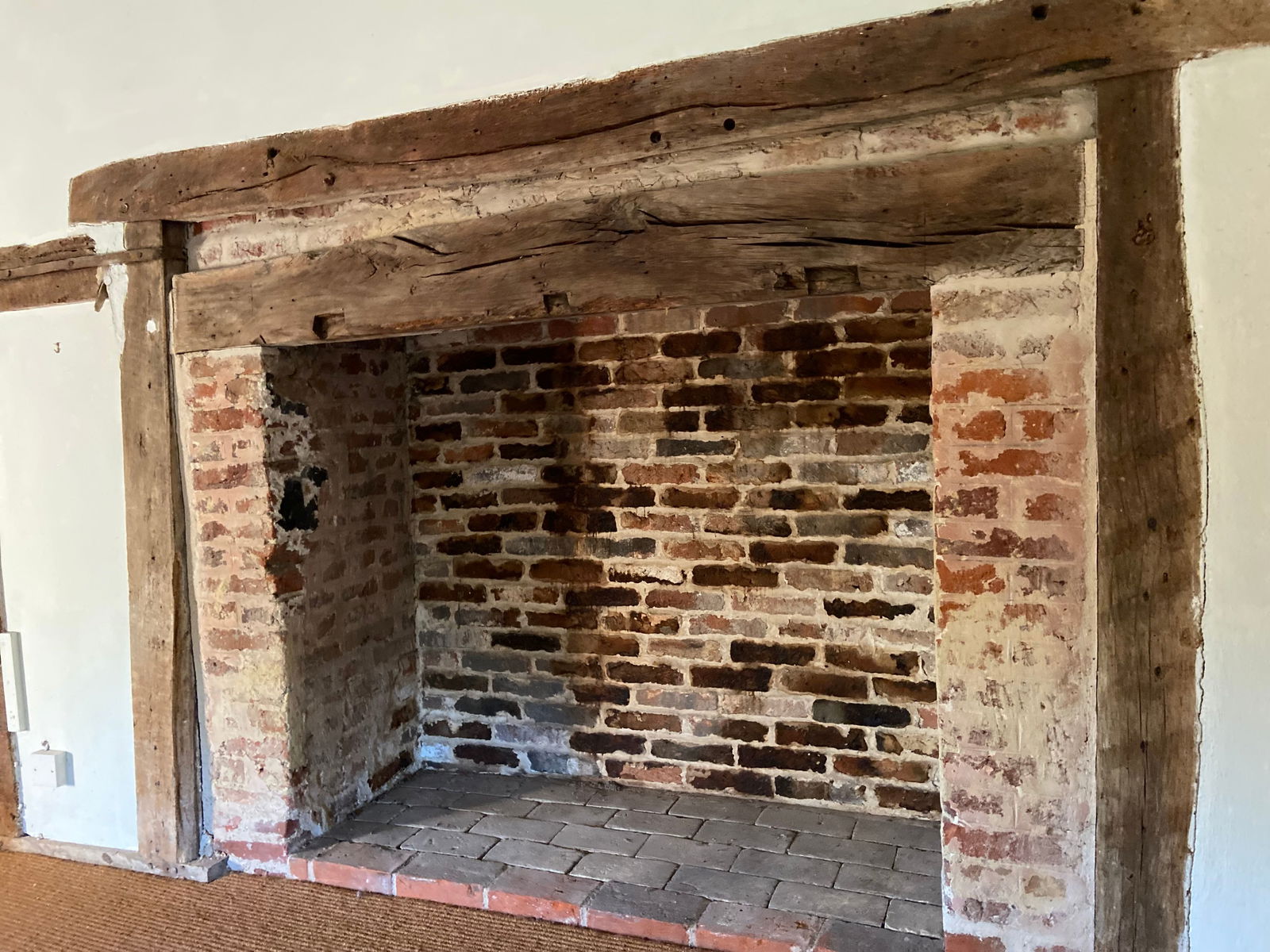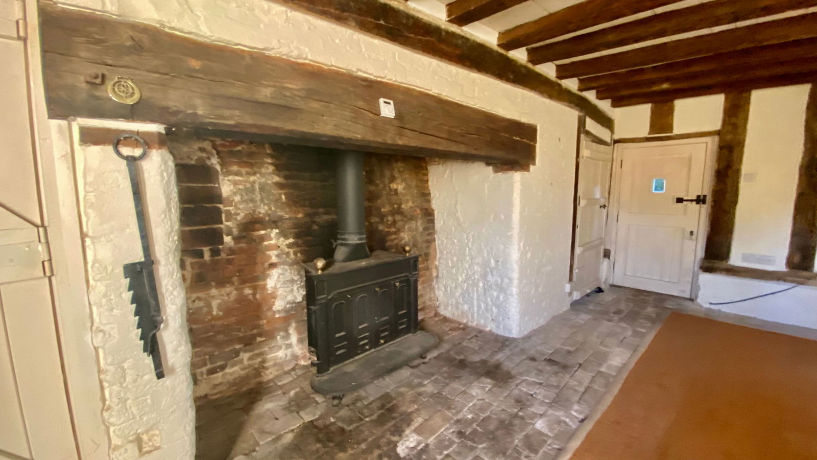 The heavy timber front door, featuring a spy glass, opens into an entrance lobby with attractive brick-laid flooring that continues throughout the ground floor. The living room is a triple-aspect space of great character, featuring exposed timber framing, heavy ceiling beams, and mullion windows. The focal point is an impressive 7-foot-wide inglenook fireplace with a bressummer and bridging beam. A door leads from the living room to the rear garden.