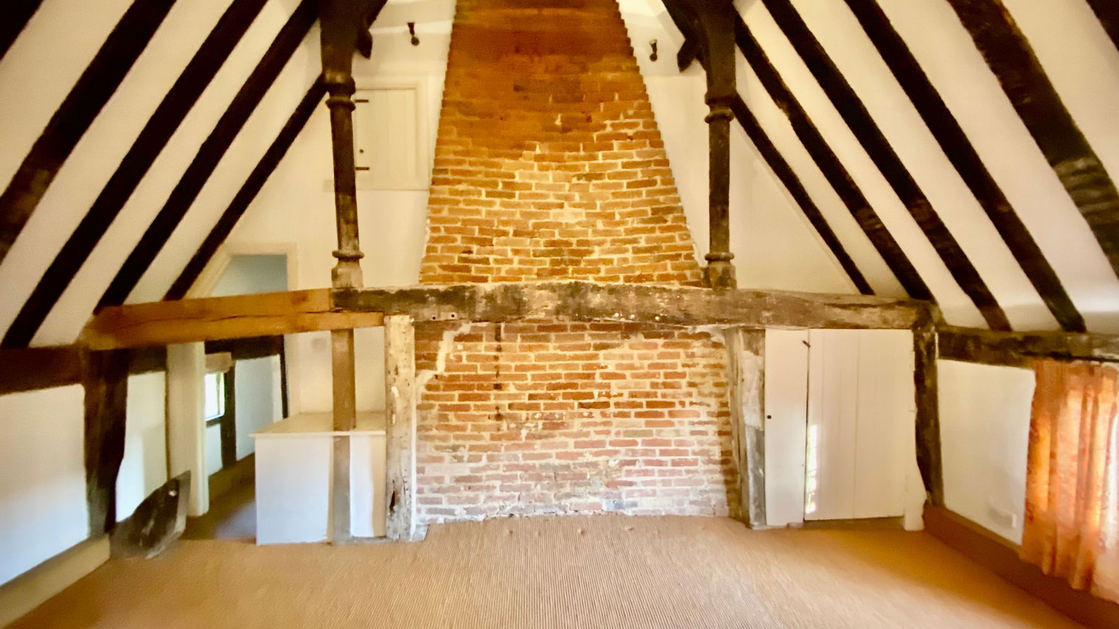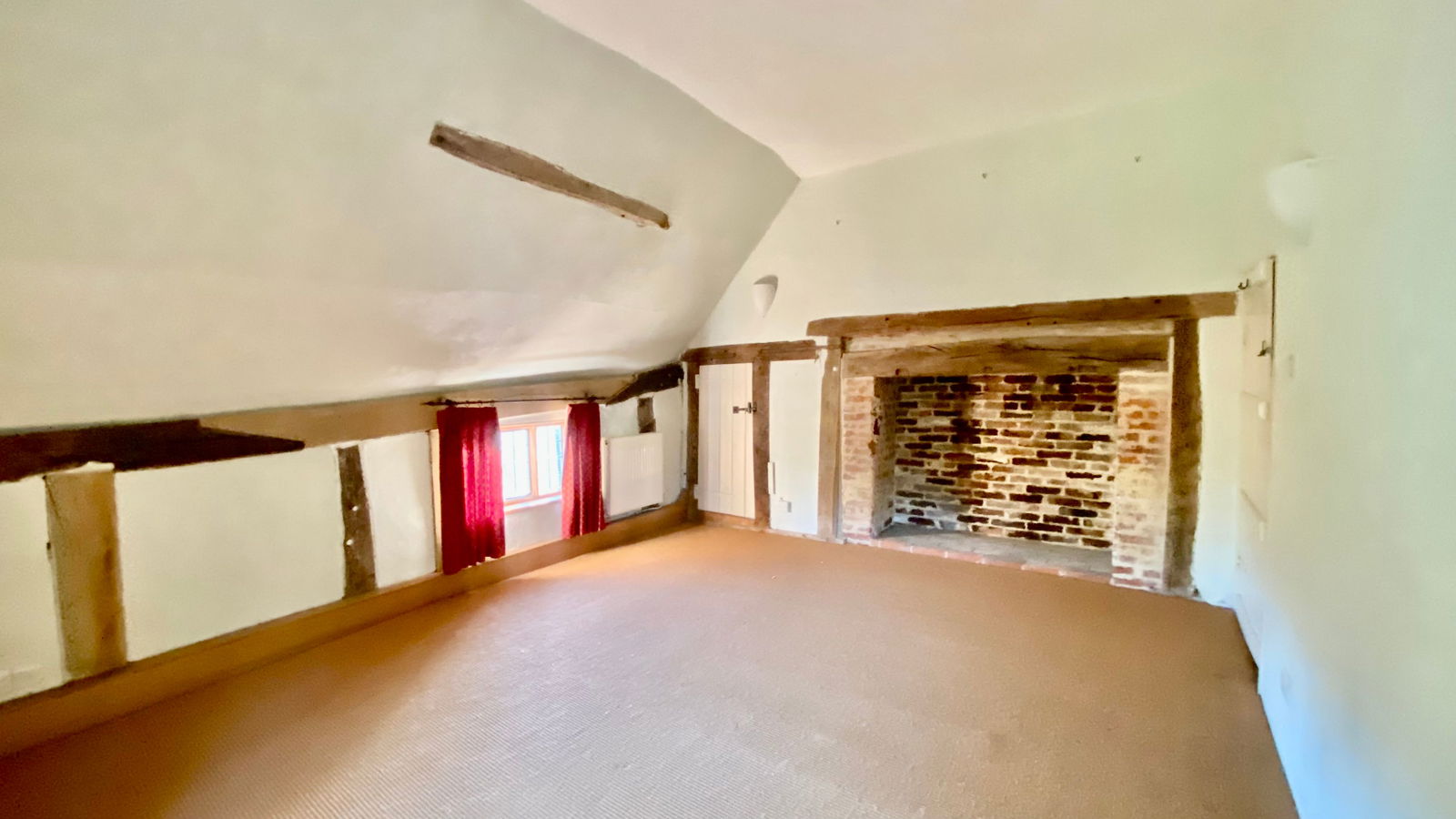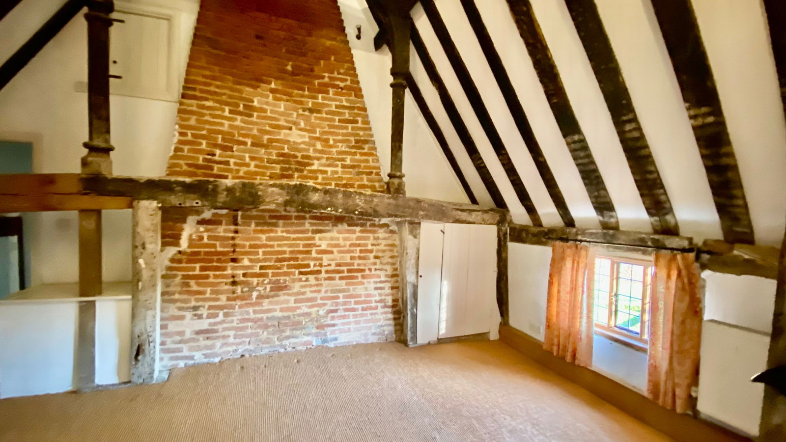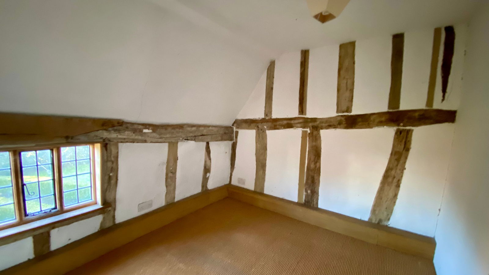 Bedroom 2, accessible from both staircases, is another impressive double-aspect room. It includes mullion windows overlooking the gardens, an exposed brick chimney breast, and a fine example of the rare Queen Post roof truss, with octagonal posts and carved capitals and bases. This architectural detail is specifically referenced in the Grade II* Listing notes. A door from this room leads to a secondary landing and Bedroom 3, which features exposed framework and a mullion window overlooking the front garden. The shower room includes a tiled cubicle with a power shower, a pedestal hand washbasin, and a side window.