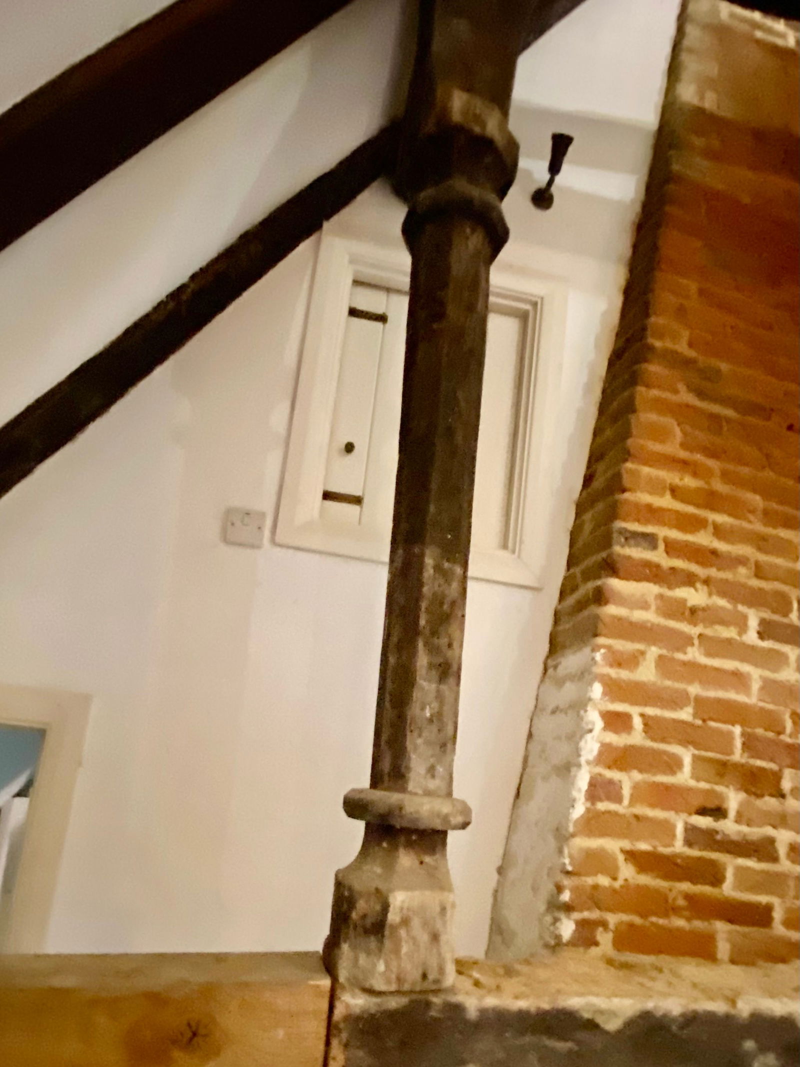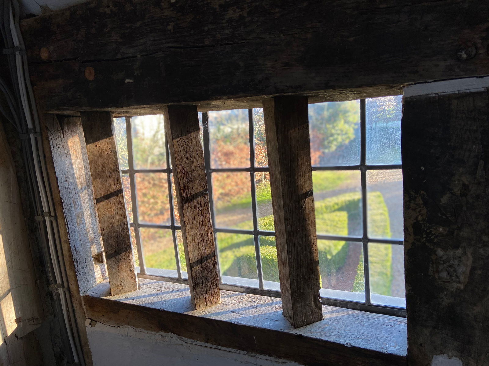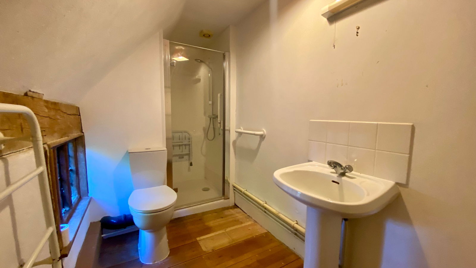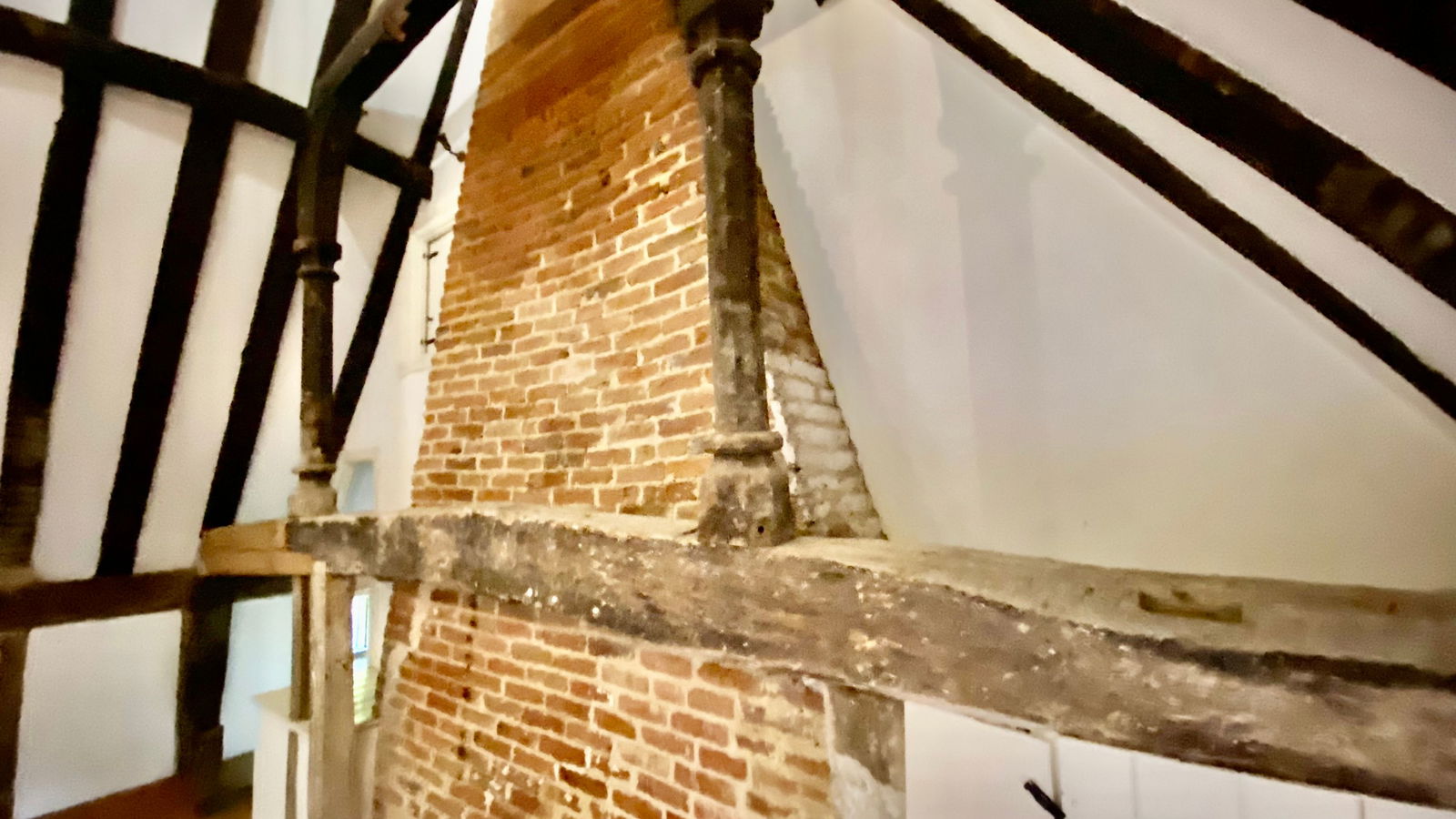 Bedroom 2, accessible from both staircases, is another impressive double-aspect room. It includes mullion windows overlooking the gardens, an exposed brick chimney breast, and a fine example of the rare Queen Post roof truss, with octagonal posts and carved capitals and bases. This architectural detail is specifically referenced in the Grade II* Listing notes. A door from this room leads to a secondary landing and Bedroom 3, which features exposed framework and a mullion window overlooking the front garden. The shower room includes a tiled cubicle with a power shower, a pedestal hand washbasin, and a side window.
