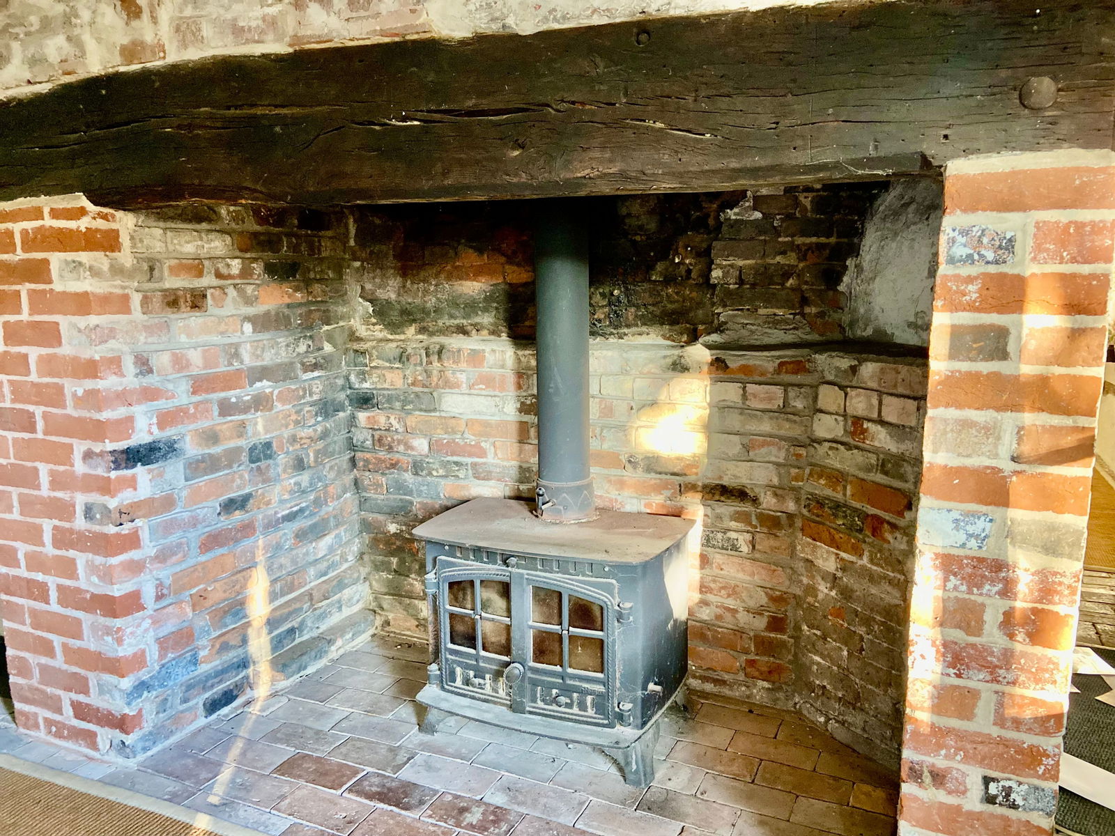 The dining room is light-filled, with windows overlooking both the front and rear gardens. It also boasts exposed timber framing, a beamed ceiling, and an inglenook fireplace housing a black cast iron wood-burning stove. The kitchen is equipped with oak wall units, base cabinets, and solid oak work surfaces, along with integrated appliances, a Butler sink, and a pantry cupboard under the stairs. This double-aspect room enjoys natural light and has a door leading to the side garden.