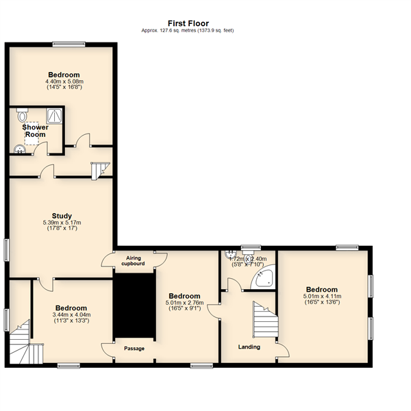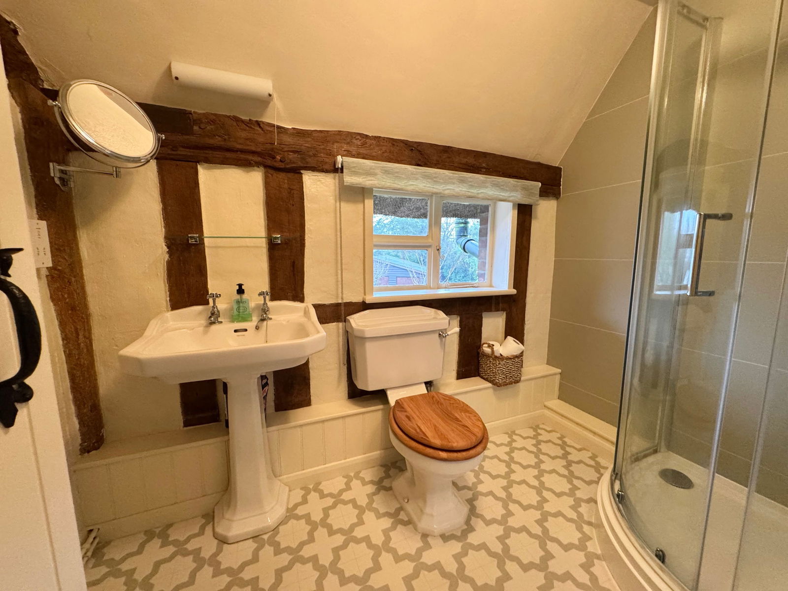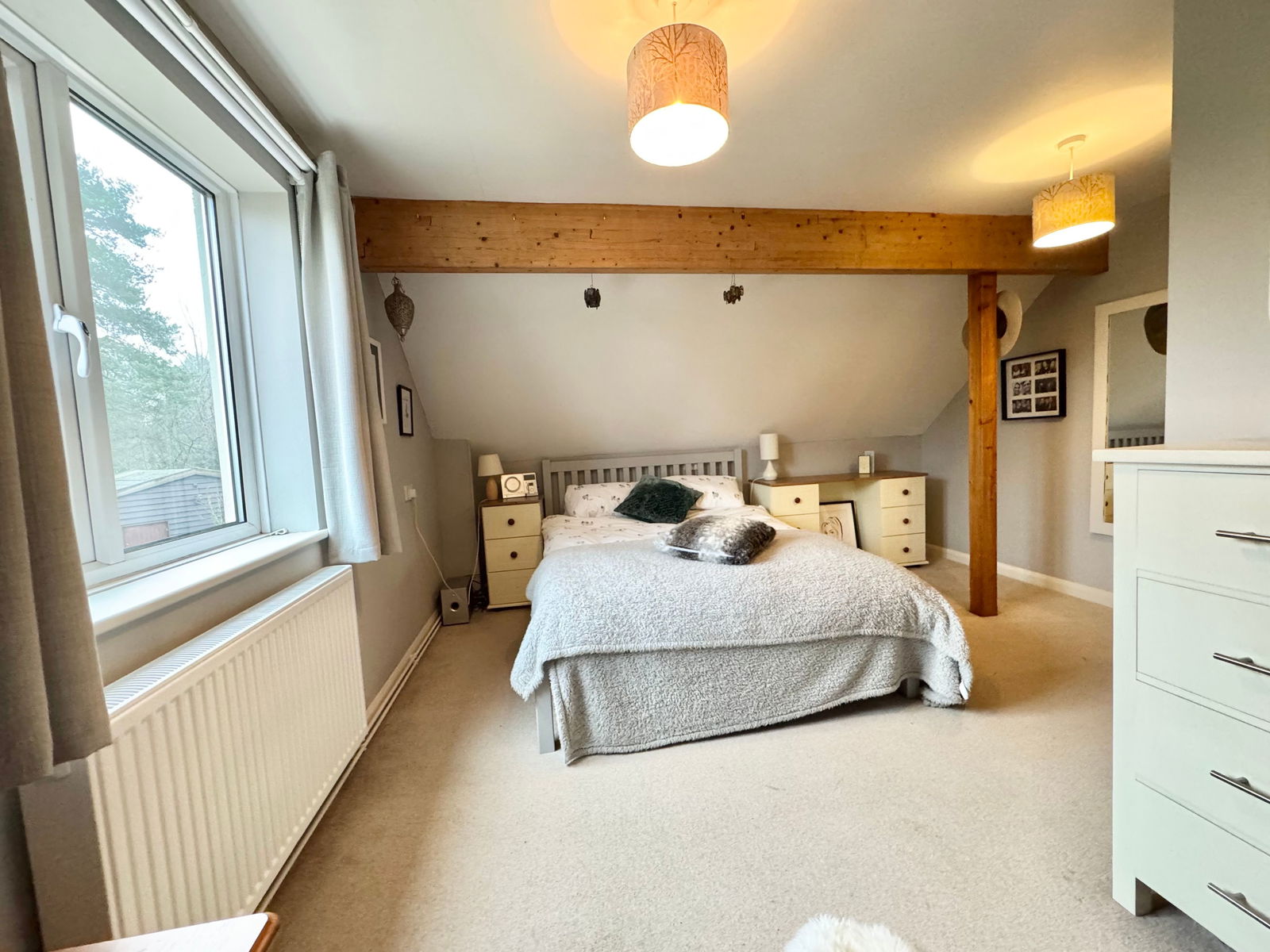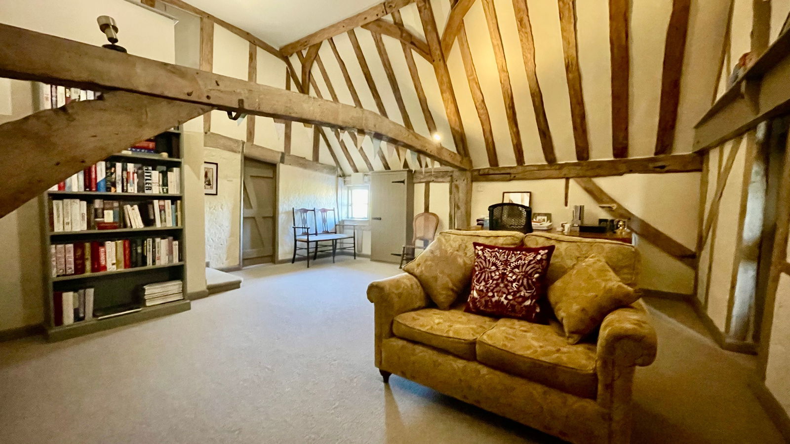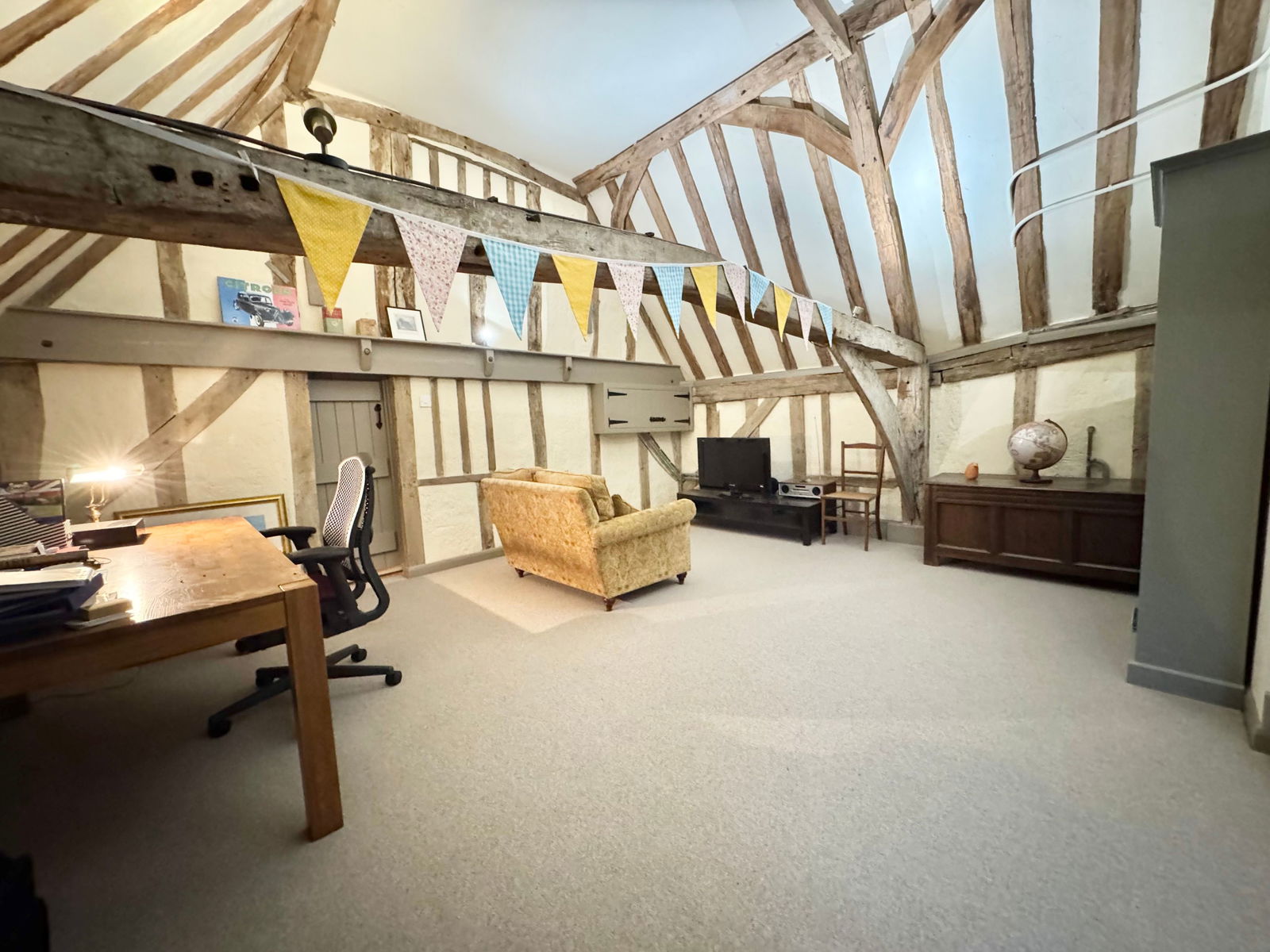 A first floor landing with Tudor mullioned window gives access to a well proportioned double aspect master bedroom and a shower room, with the adjoining bedroom currently used as a dressing room to form a master suite. A further bedroom overlooking the front garden has a staircase to the ground floor and a doorway to the magnificently vaulted first floor study/sitting room.