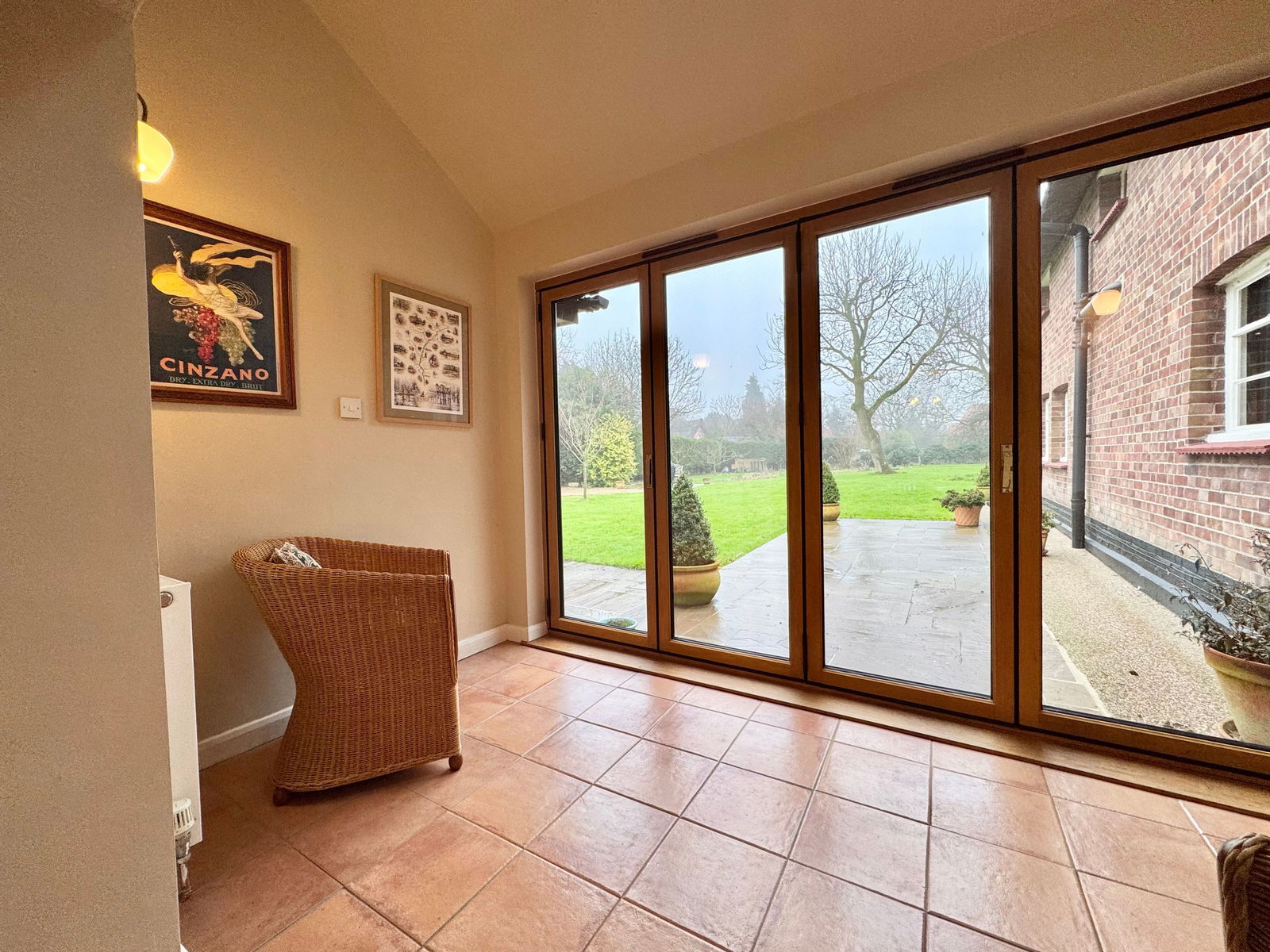 The kitchen incorporates a range of fitted cupboards, an island unit, an electric 2 oven Aga and a walk-in larder. Partially separated by open studwork, the accommodation flows through to the dining area and the sun room with wonderful views over the south facing garden through the double bi-fold doors.