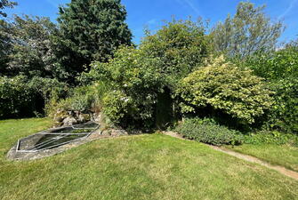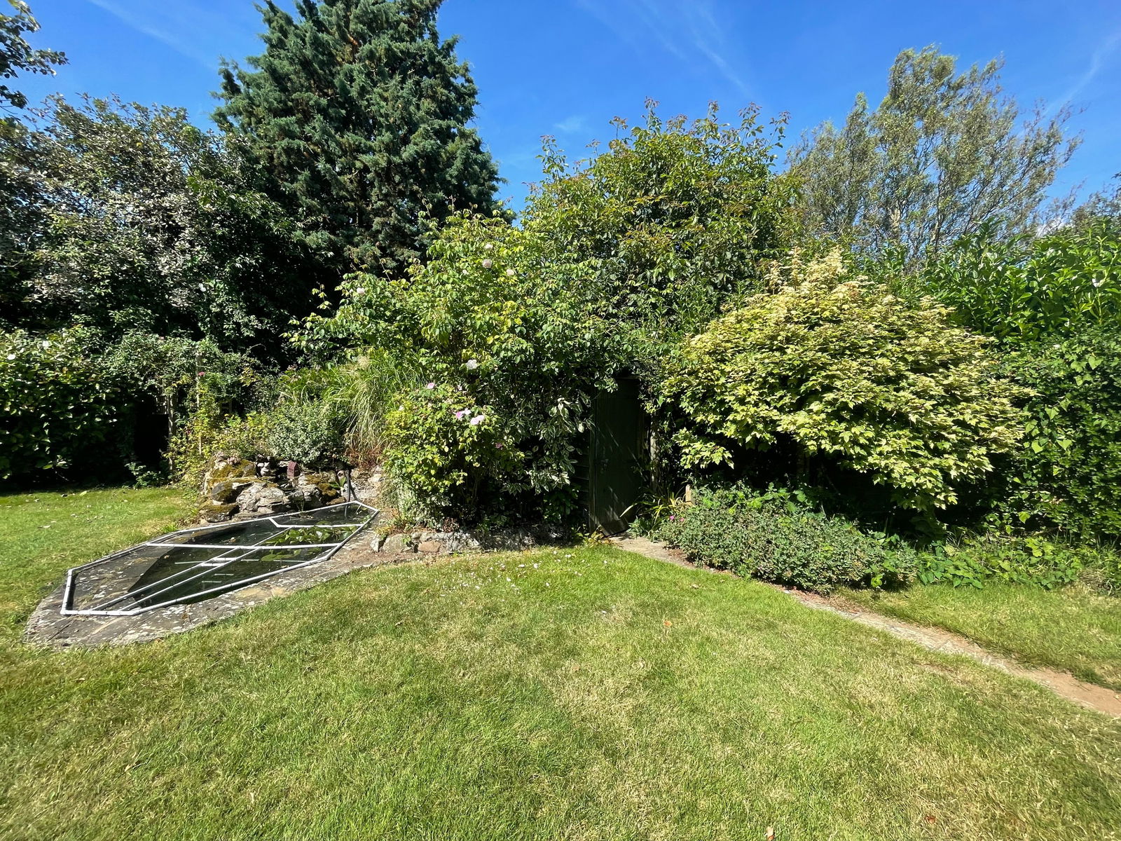 The property is approached via a tarmac driveway leading to a brick weave parking area in front of the house, offering space for several cars. There are two garages with electrically operated doors, one of which has a courtesy door leading to the rear garden. The front garden includes a lawn, mature shrubs, hedging, and a large vegetable plot. The private rear garden is screened with evergreen hedging and established shrubs and features a patio area, pond, utility area, and a large shed with power. The entire plot covers approximately 0.37 acres (0.150 hectares).