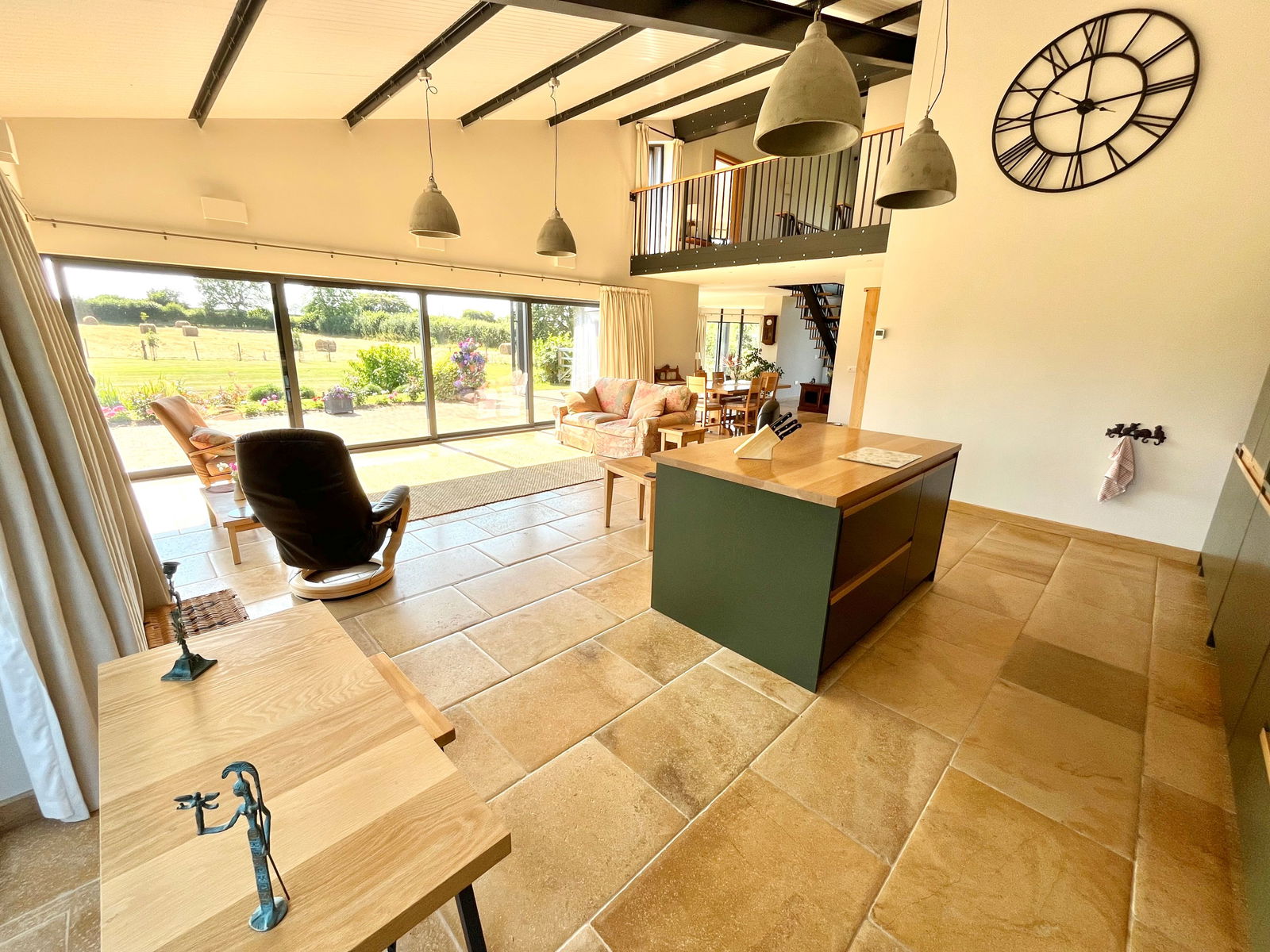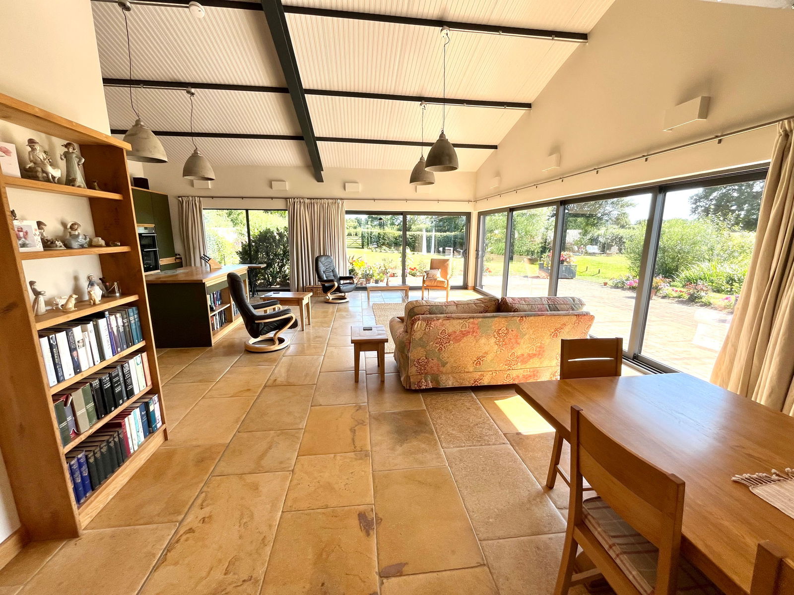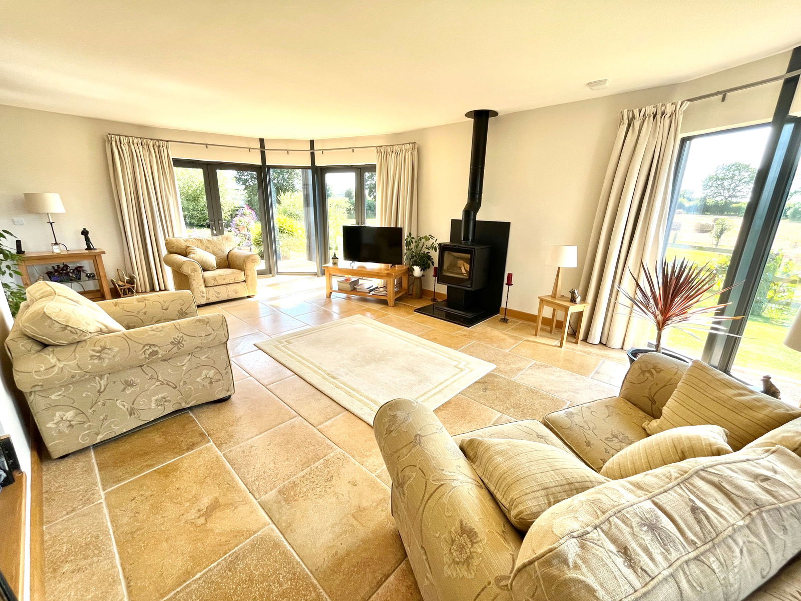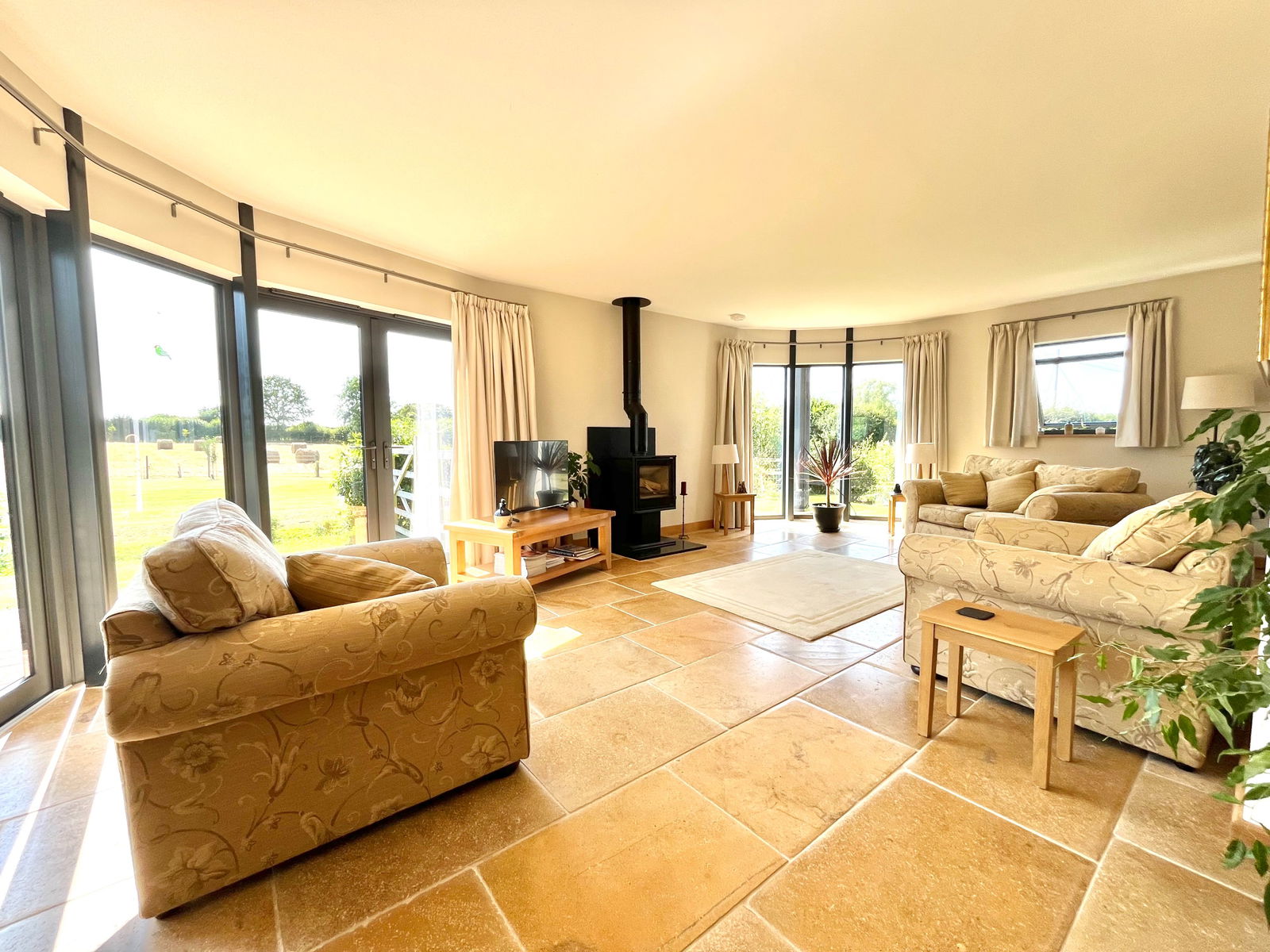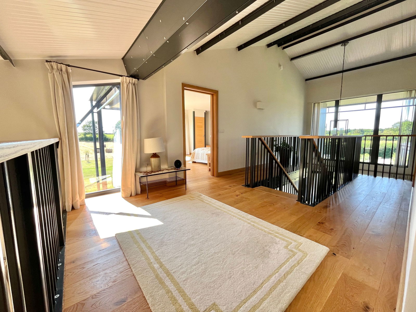 Welcome to Hay barn House, an architecturally stunning modern barn conversion set within approximately 4.069 acres of idyllic countryside. This exceptional property offers a perfect blend of contemporary design and natural beauty whilst providing very economical living. Upon entering, you're greeted by a striking modern staircase that ascends to a galleried landing, providing an impressive vantage point over the spacious family room. The ground floor features a well-appointed bedroom with an en suite shower room, a practical utility room and boiler room, and a generously sized lounge adorned with curved windows, offering uninterrupted panoramic views of the rolling hay fields.