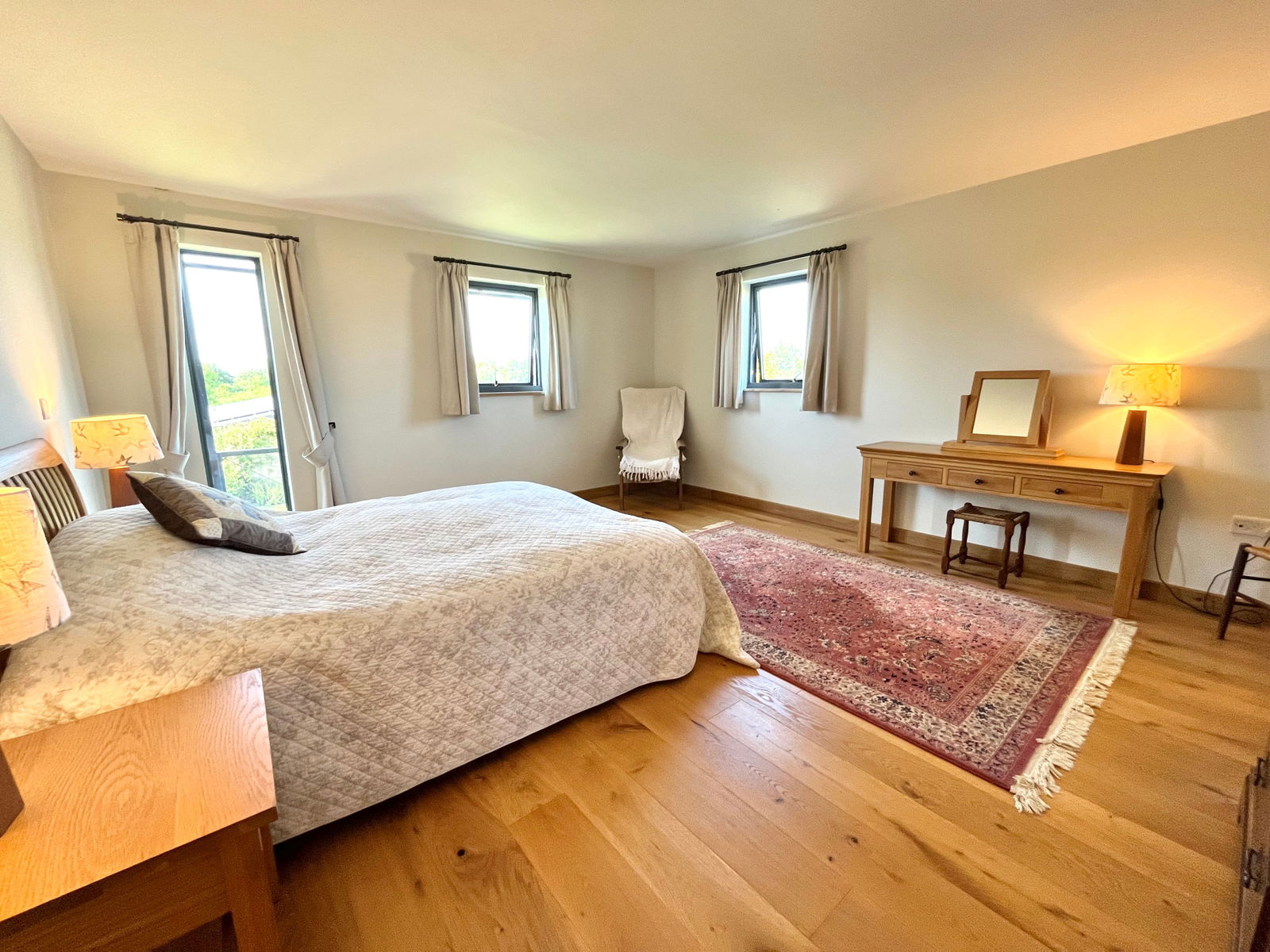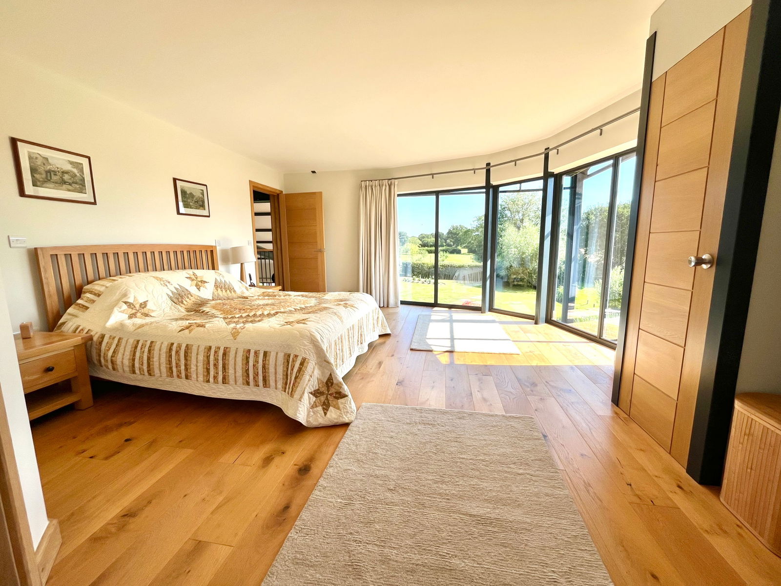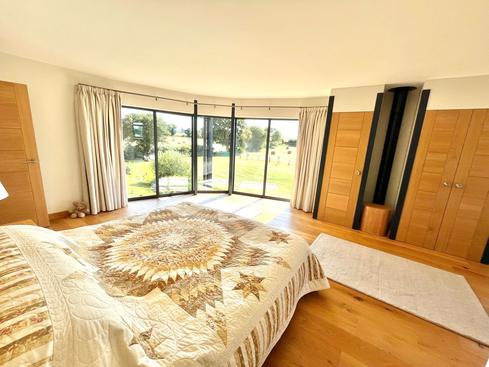 Upstairs, the first floor continues to impress with expansive field views from every window. The luxurious main bedroom features large, curved windows that frame breathtaking vistas, while the spacious second bedroom boasts an en-suite bathroom and a walk-in wardrobe. A versatile third bedroom, currently used as a craft room, can easily be converted into an additional sleeping area.