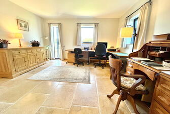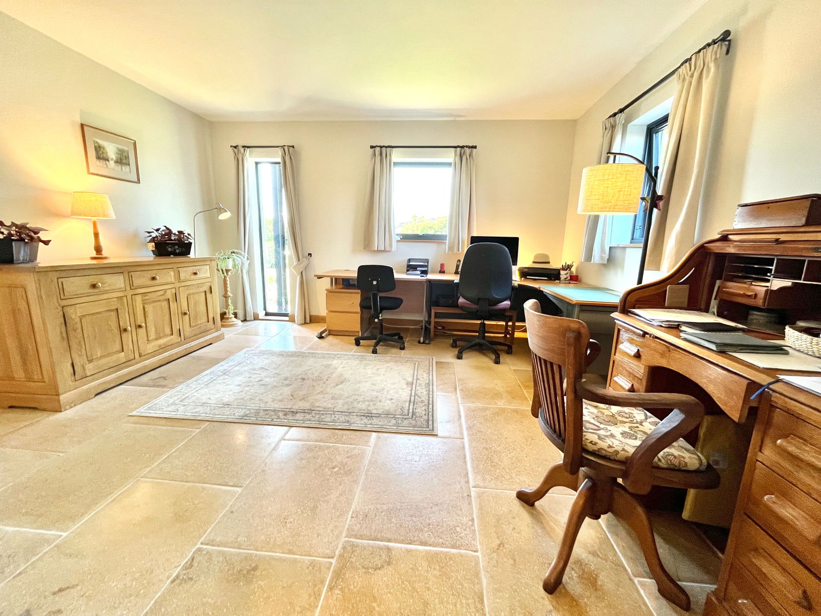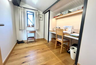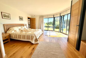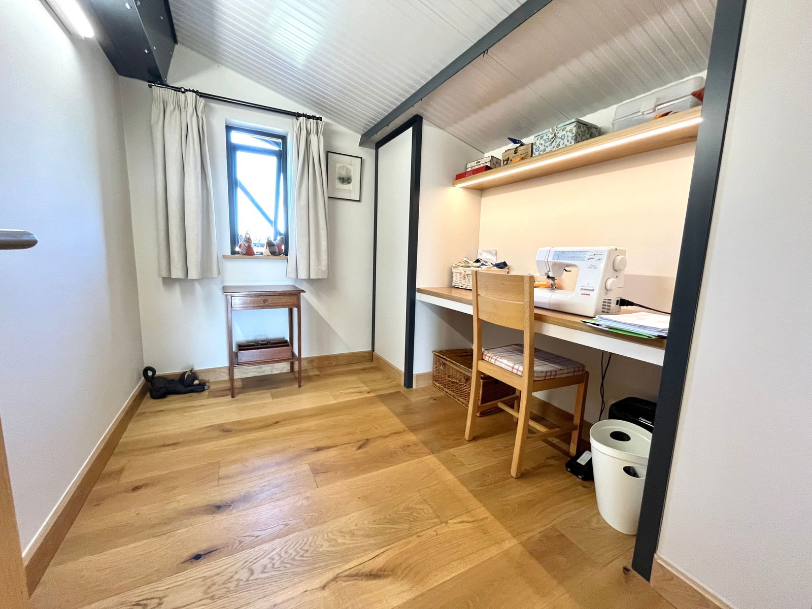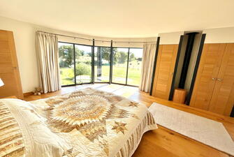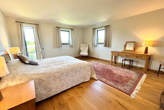 Upstairs, the first floor continues to impress with expansive field views from every window. The luxurious main bedroom features large, curved windows that frame breathtaking vistas, while the spacious second bedroom boasts an en-suite bathroom and a walk-in wardrobe. A versatile third bedroom, currently used as a craft room, can easily be converted into an additional sleeping area.