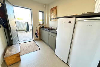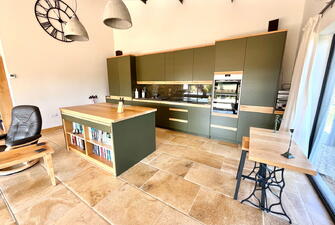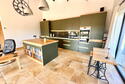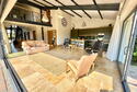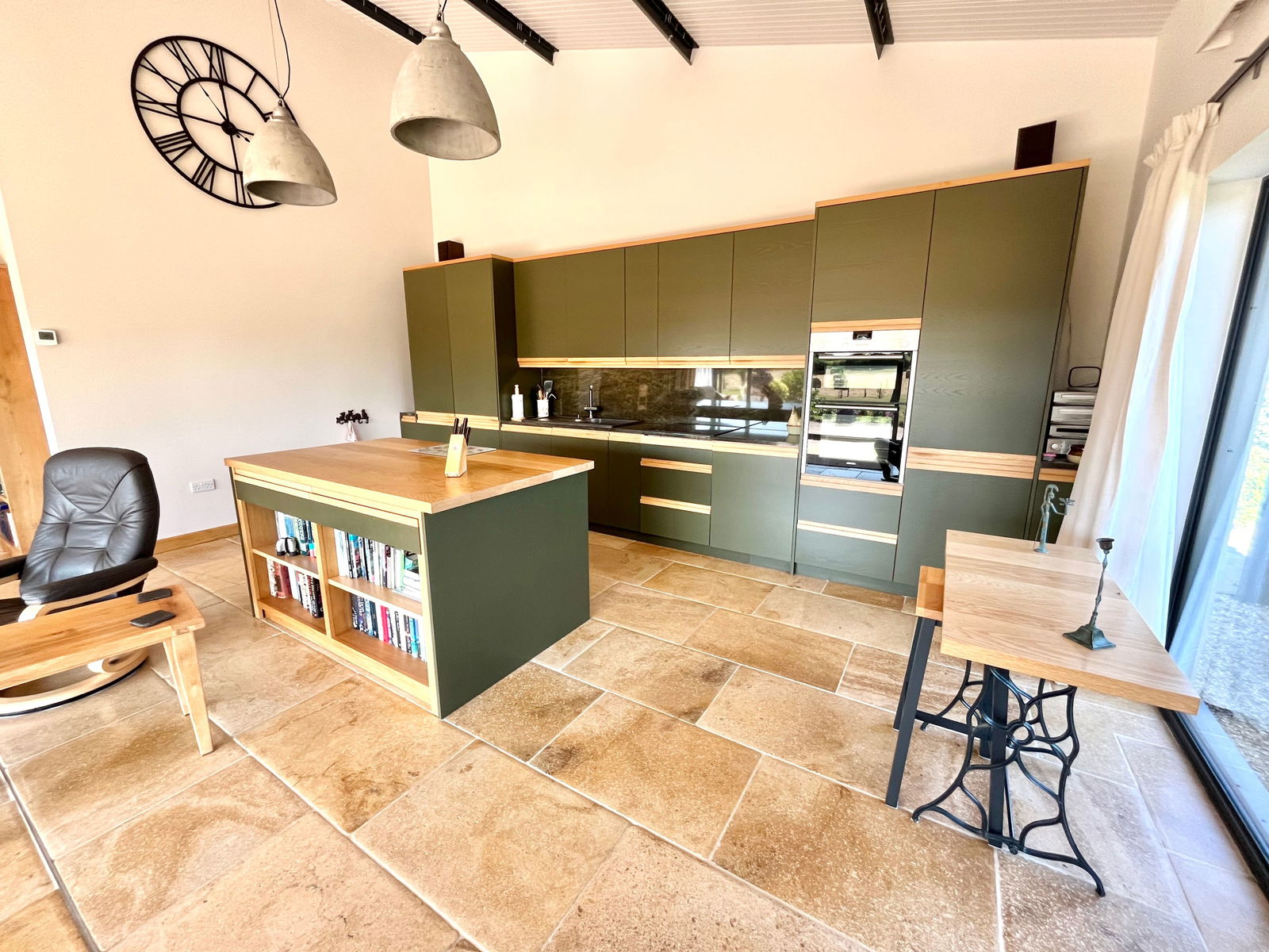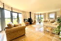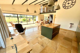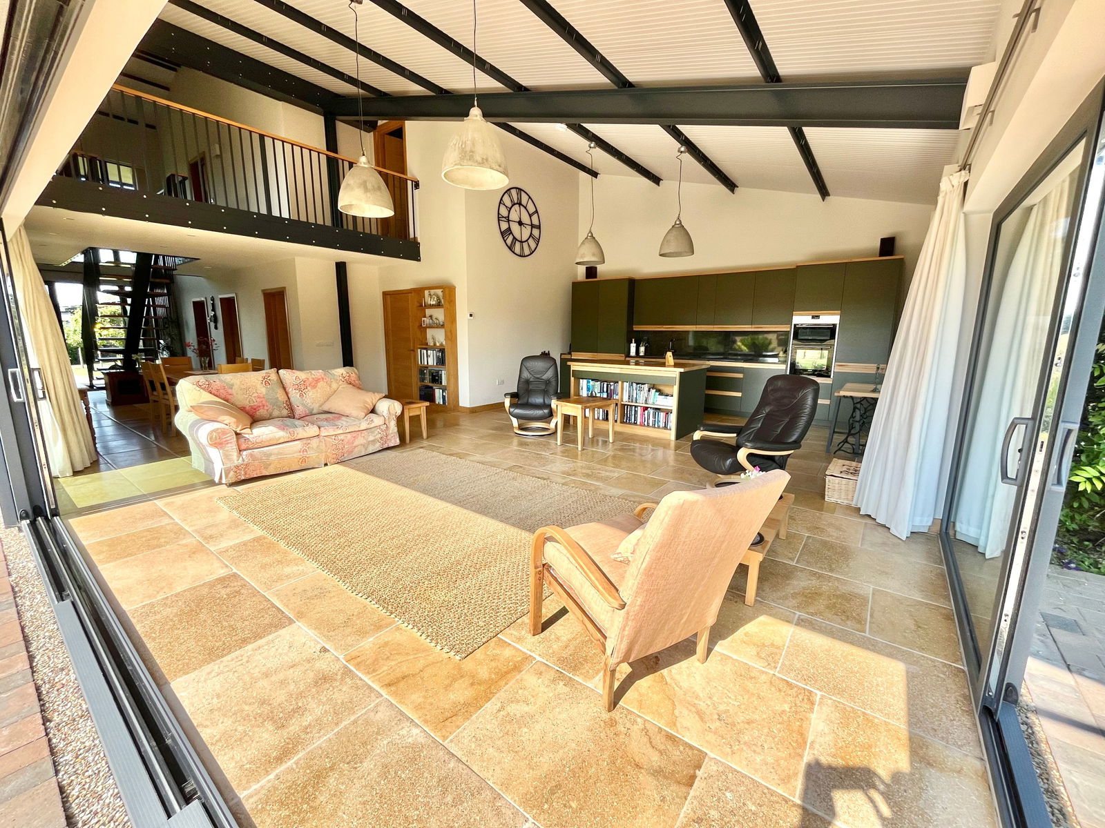 The open-plan kitchen/diner and family room is a focal point of the home, equipped with retractable doors that seamlessly connect indoor living with the stunning outdoor landscape, ideal for entertaining and enjoying the serene surroundings.