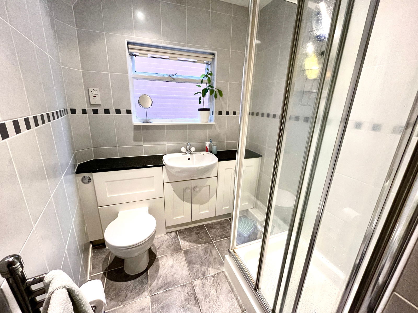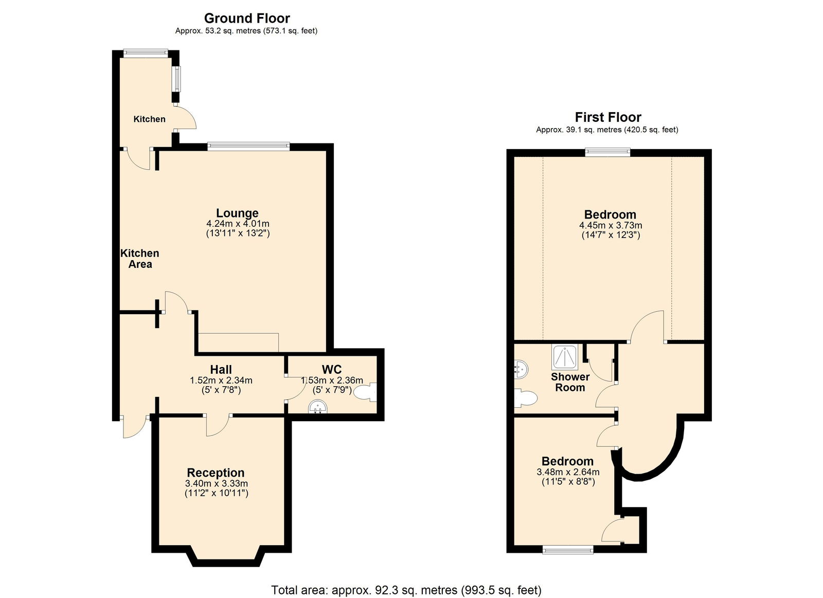 The compact and well-designed kitchen includes an open-plan overflow section that blends seamlessly into the lounge area. A ground-floor WC also functions as a cloakroom.