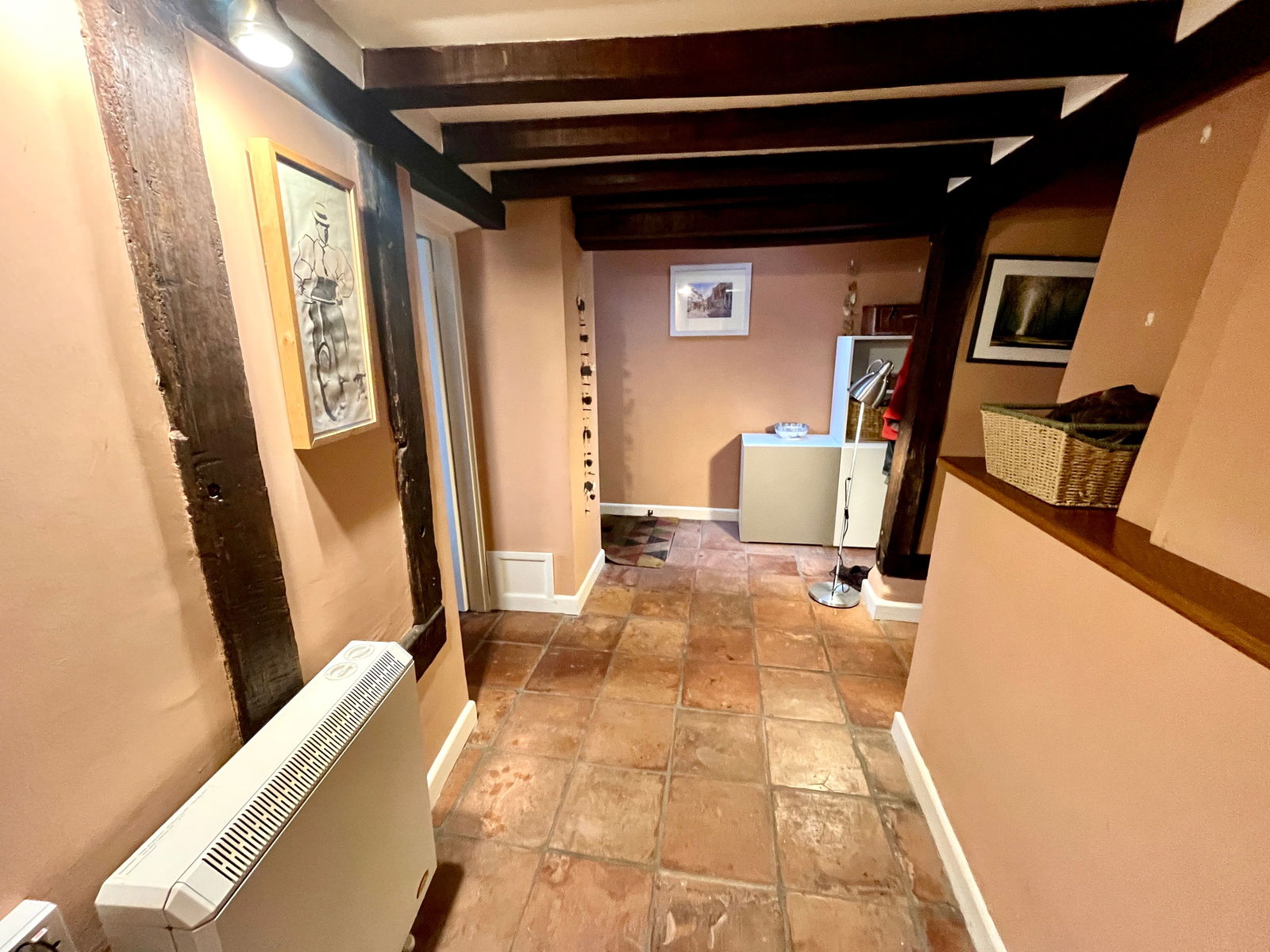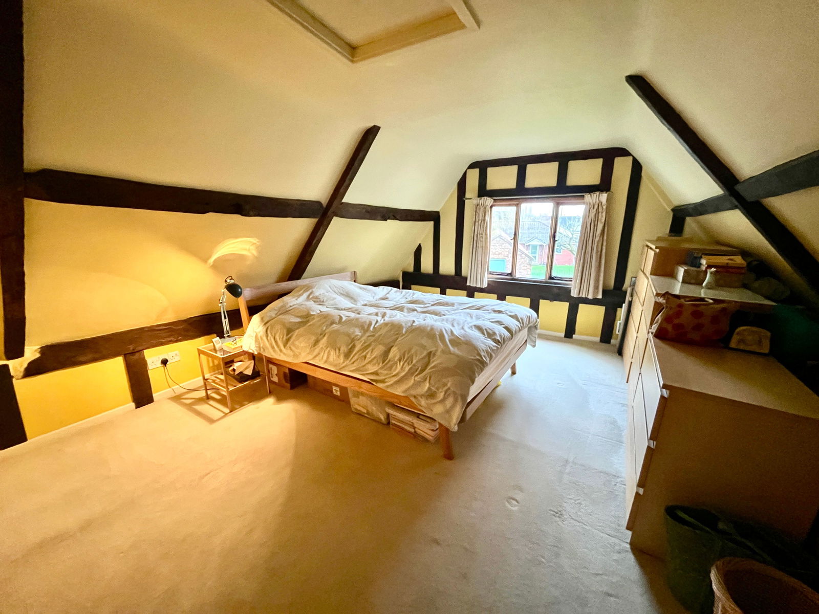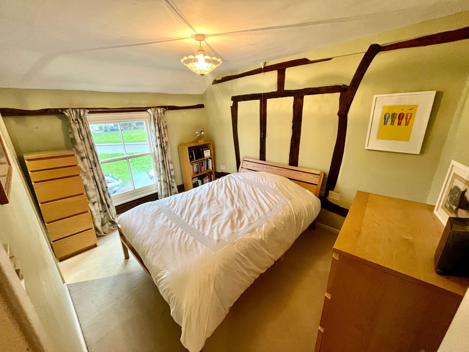 Upstairs, the main bedroom boasts a vaulted ceiling with exposed beams, offering lovely views over the garden. The front-facing room has striking views of the green, showcasing beautiful Queen Post woodwork. A modern shower room features a shower, vanity basin, and WC.