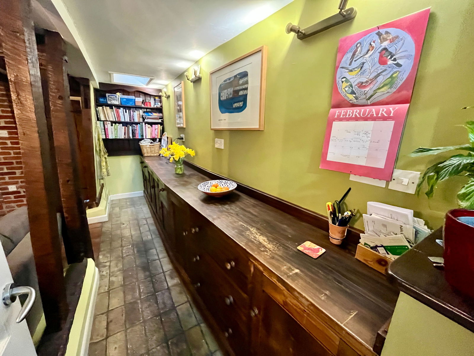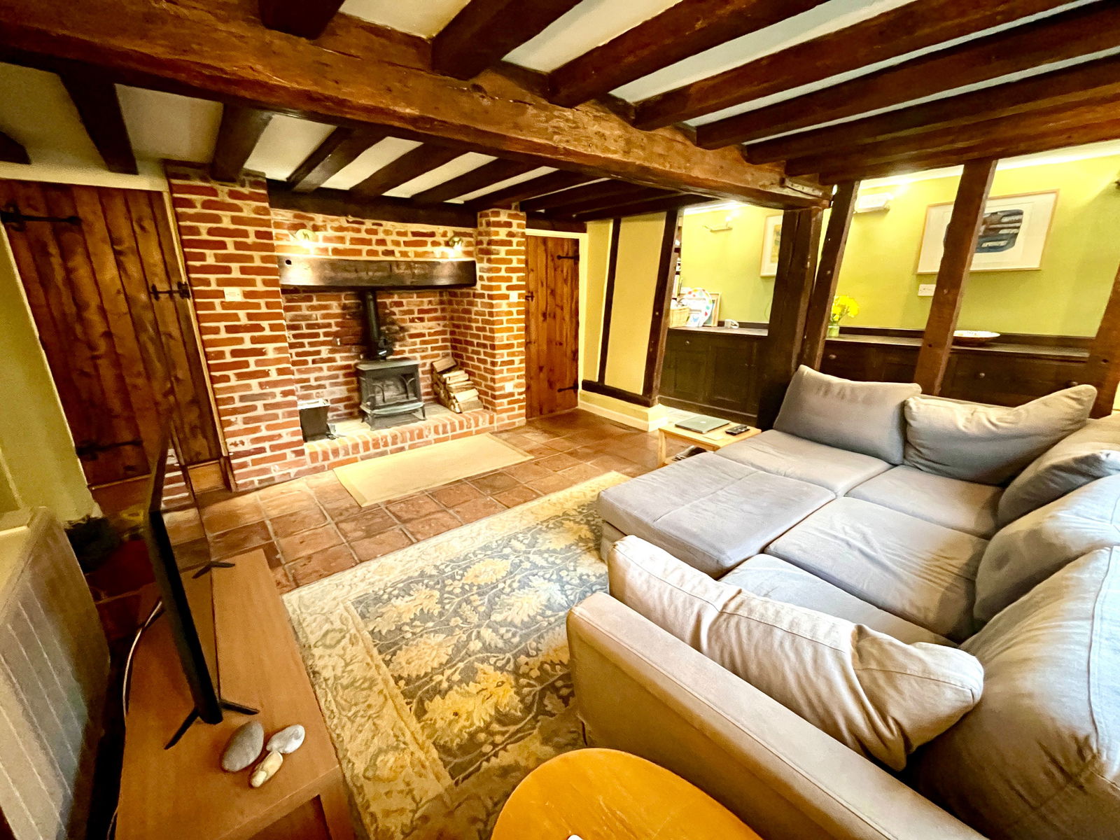 The welcoming entrance hall leads to the second reception room, currently used as a dining room, offering enviable views of the Market Place Green. The lounge serves as the heart of the home, featuring an exposed brick fireplace with a wood burner, an inglenook, and hidden witches' marks and signatures, adding to the property's historic charm.