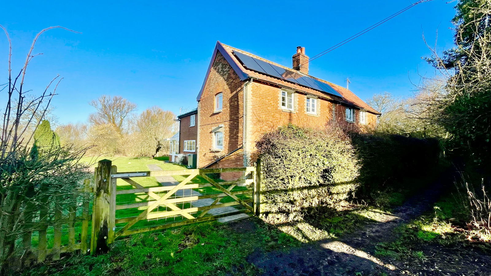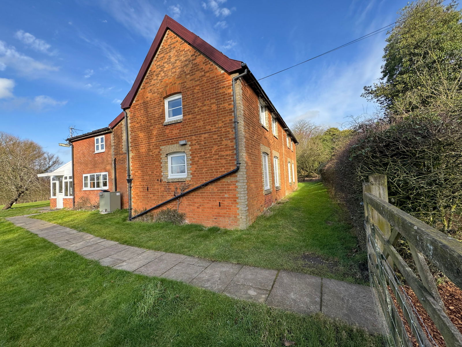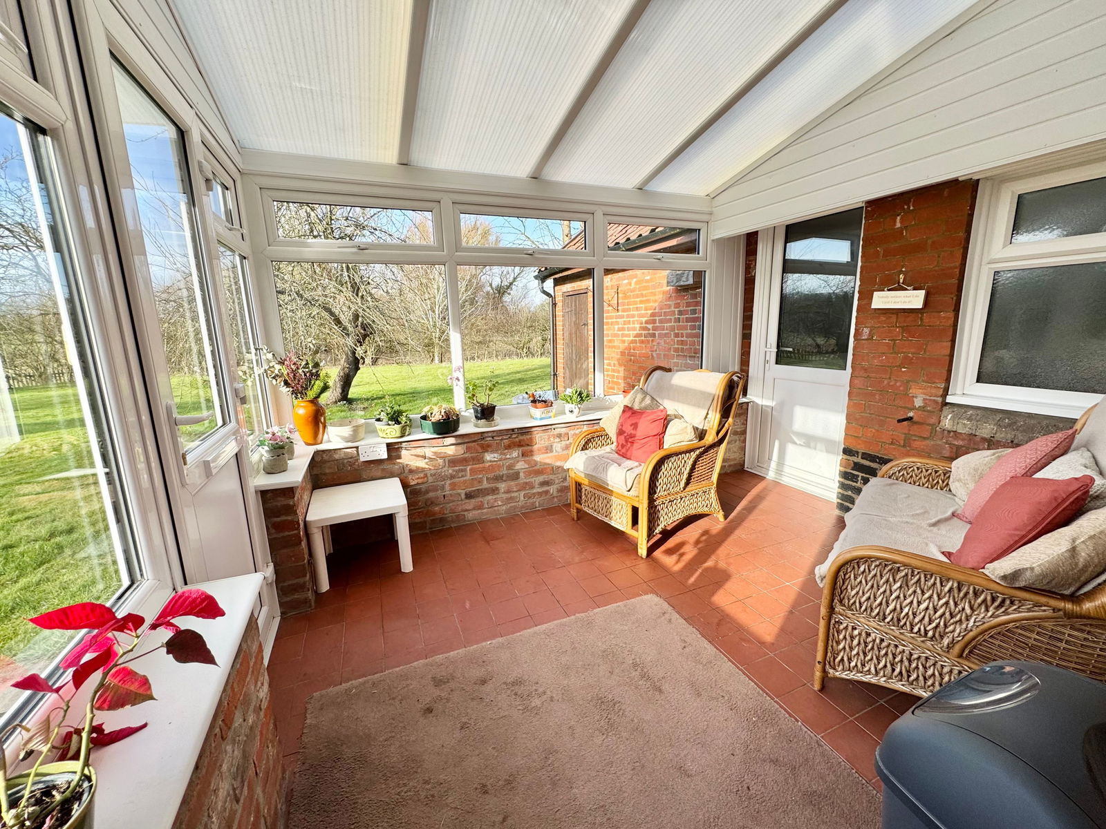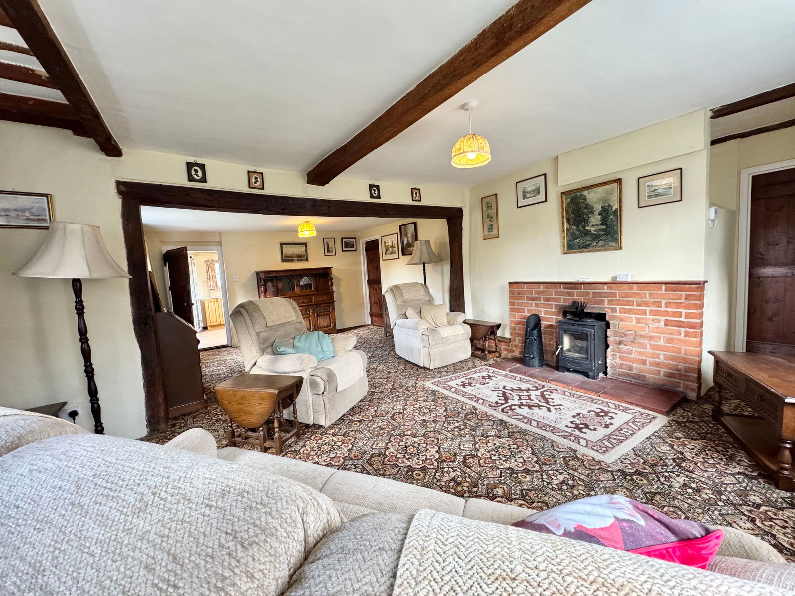 This spacious five-bedroom cottage, originally two separate dwellings, is nestled in extensive gardens within a secluded location near the heart of Banham. The ground floor offers generous living space, including a large sitting room with exposed timbers and a brick fireplace. Adjoining this is a formal dining room with an additional brick fireplace and charming exposed ceiling beams. The kitchen/breakfast room, fitted with an extensive range of pine base and wall units, features an inset stainless steel sink, fitted oven, hob with hood, and dual-aspect windows overlooking the garden. A separate utility room provides additional storage and plumbing for a washing machine, while a rear porch/conservatory offers access to the gardens. A lobby off the kitchen leads to a separate WC. The reception hall, with a window to the rear gardens, features a staircase leading to the first floor with storage beneath. Upstairs, five well-proportioned bedrooms provide ample accommodation. Bedroom one and bedroom two are both spacious, double-aspect rooms, partially divided by exposed studwork. Bedroom three has a window to the side aspect, while bedroom four enjoys stunning double-aspect views over the gardens and surrounding farmland. Bedroom five, also with a side window, offers additional flexible space. The family bathroom is fitted with a bath, separate shower cubicle, WC, and vanity hand wash basin with storage.