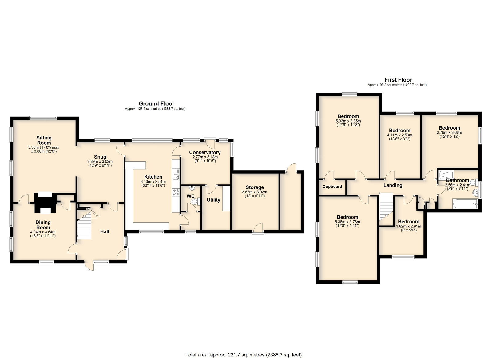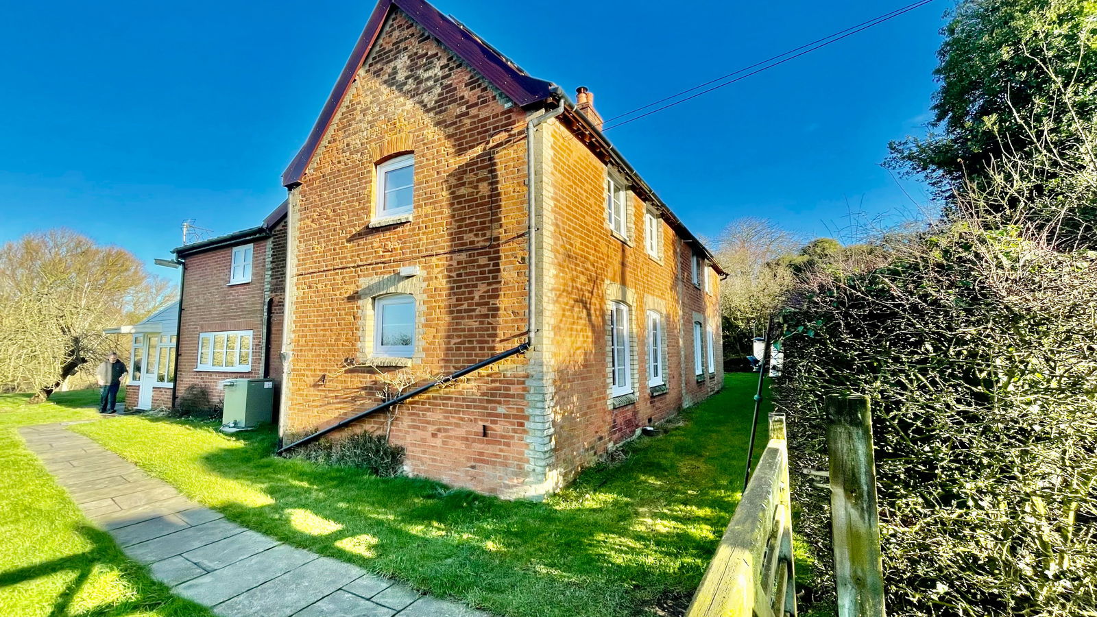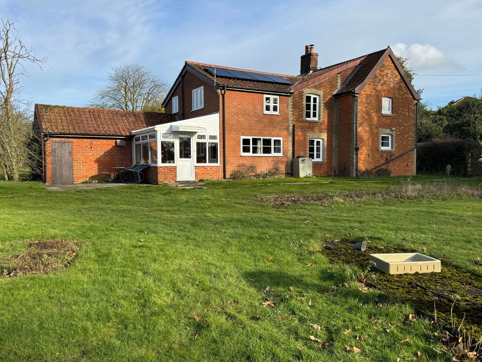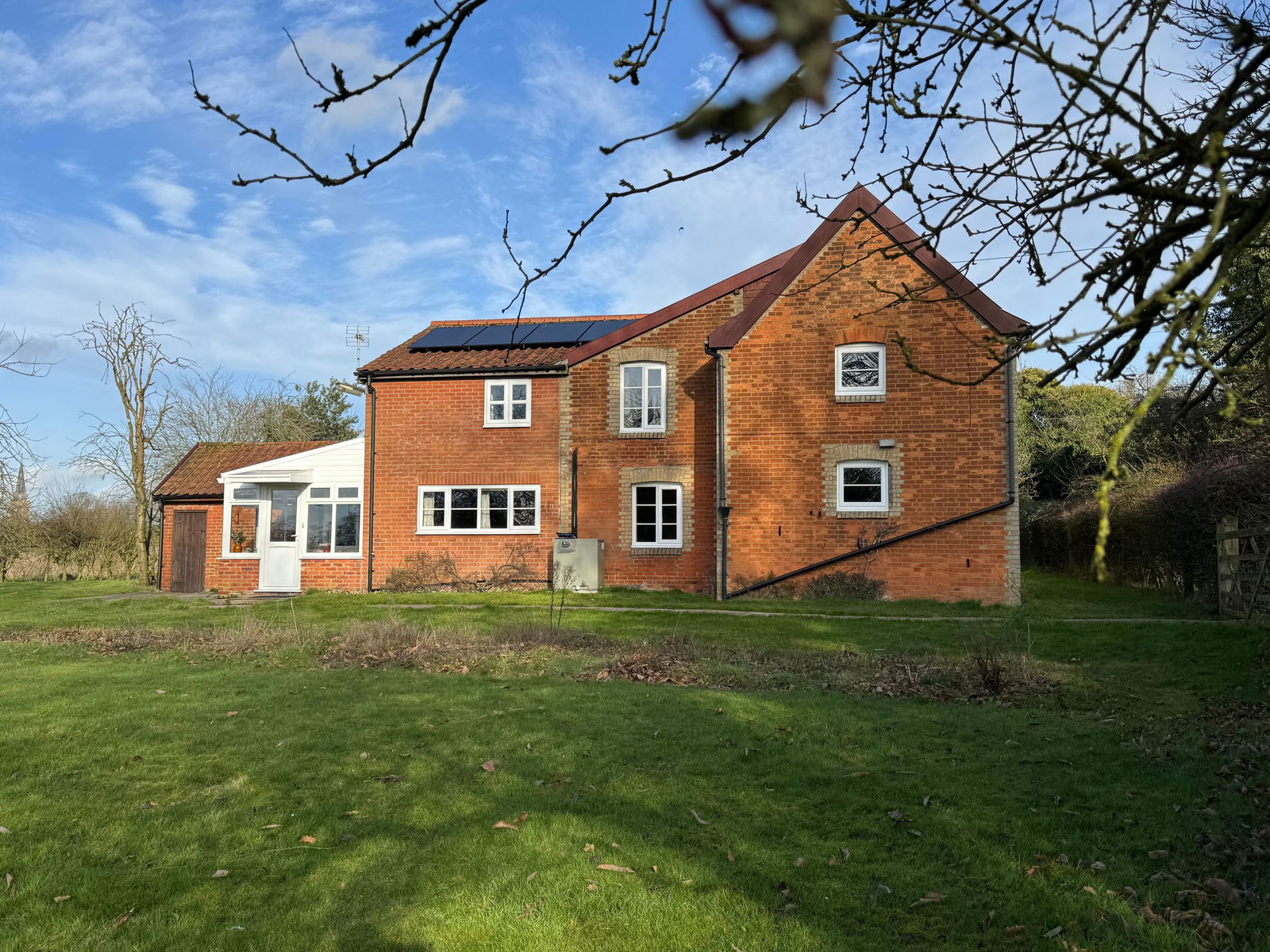 This spacious five-bedroom cottage, originally two separate dwellings, is nestled in extensive gardens within a secluded location near the heart of Banham. The ground floor offers generous living space, including a large sitting room with exposed timbers and a brick fireplace. Adjoining this is a formal dining room with an additional brick fireplace and charming exposed ceiling beams. The kitchen/breakfast room, fitted with an extensive range of pine base and wall units, features an inset stainless steel sink, fitted oven, hob with hood, and dual-aspect windows overlooking the garden. A separate utility room provides additional storage and plumbing for a washing machine, while a rear porch/conservatory offers access to the gardens. A lobby off the kitchen leads to a separate WC. The reception hall, with a window to the rear gardens, features a staircase leading to the first floor with storage beneath. Upstairs, five well-proportioned bedrooms provide ample accommodation. Bedroom one and bedroom two are both spacious, double-aspect rooms, partially divided by exposed studwork. Bedroom three has a window to the side aspect, while bedroom four enjoys stunning double-aspect views over the gardens and surrounding farmland. Bedroom five, also with a side window, offers additional flexible space. The family bathroom is fitted with a bath, separate shower cubicle, WC, and vanity hand wash basin with storage.