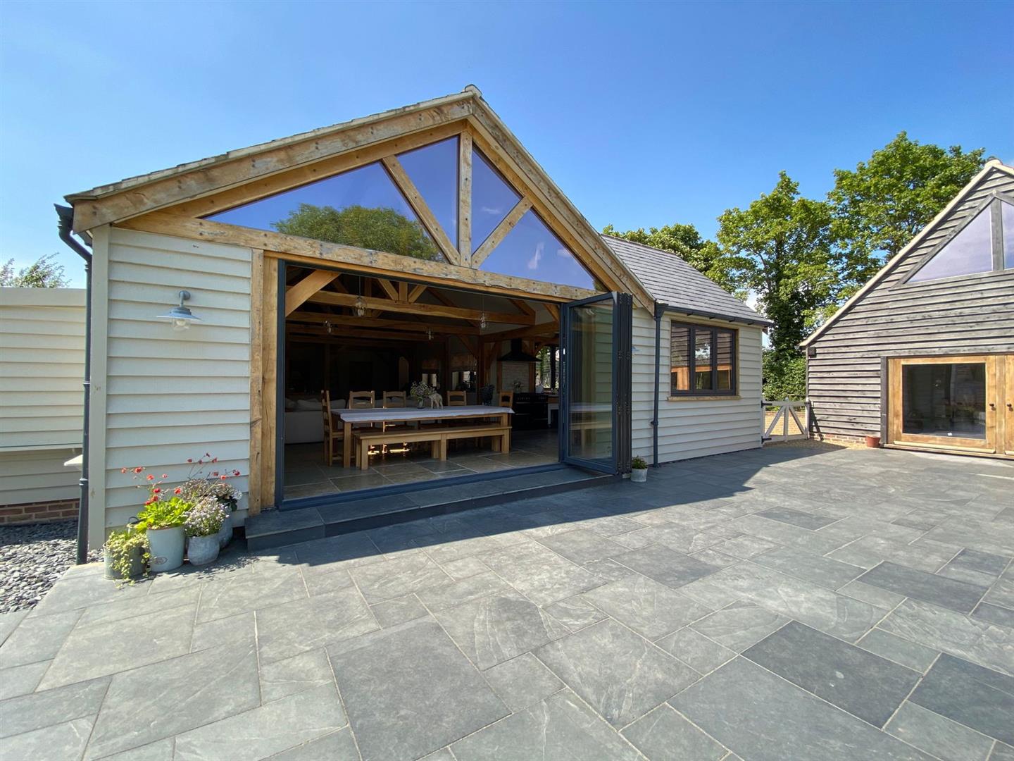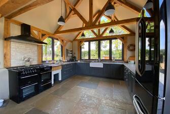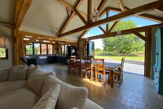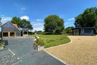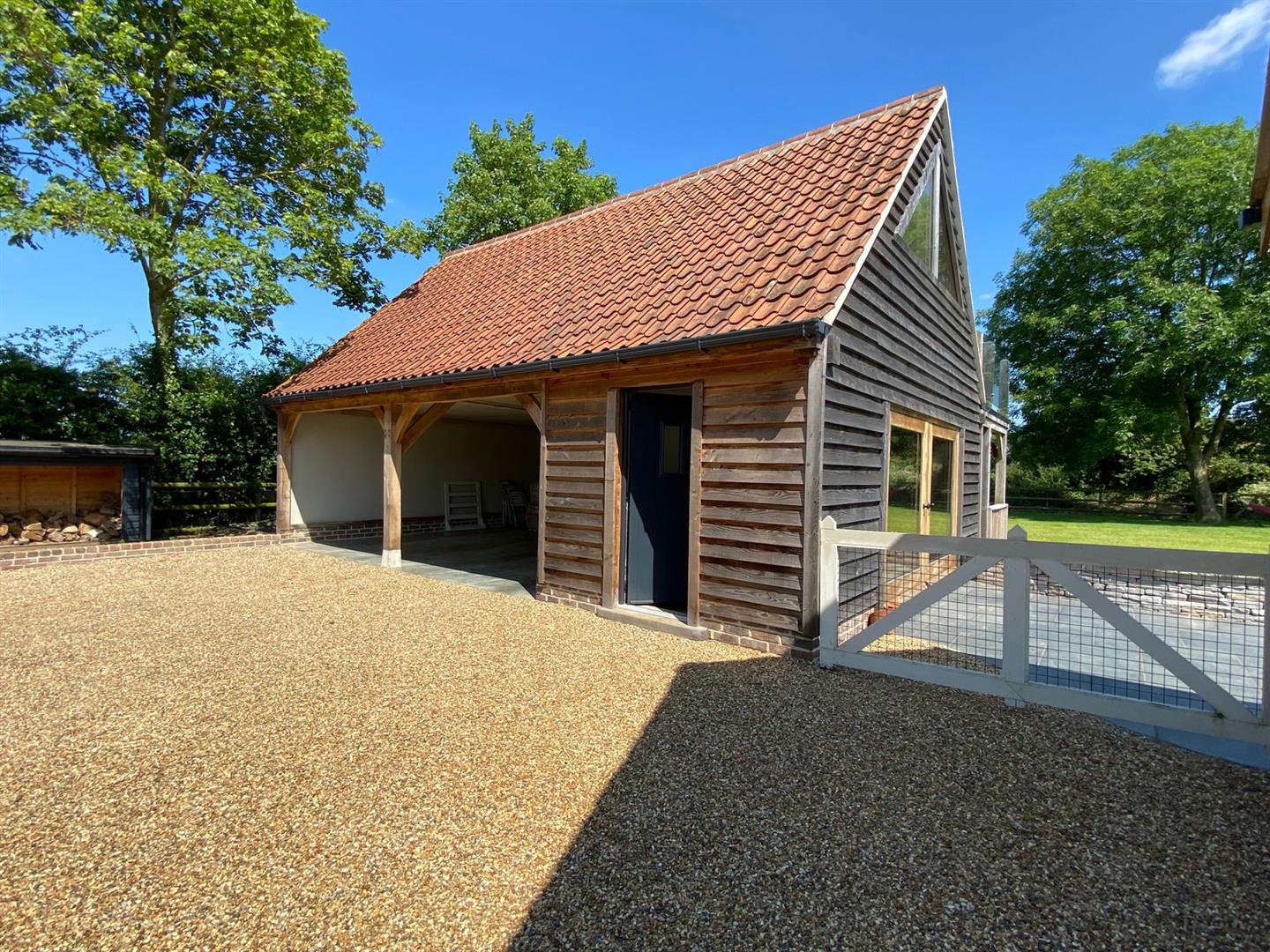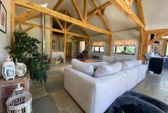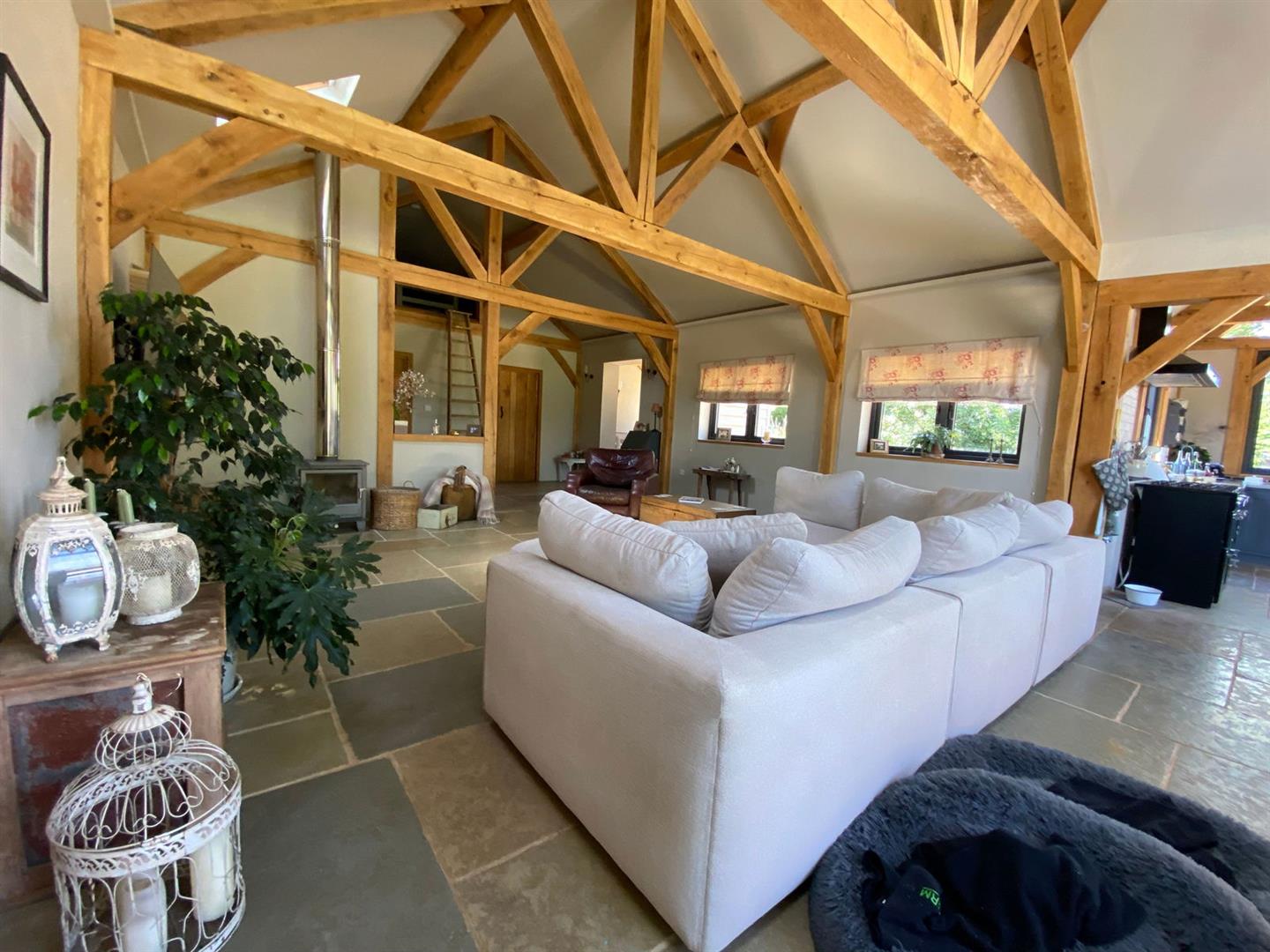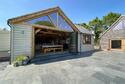 Step into the captivating main barn, a masterpiece of design with beautifully exposed oak framework, elegant window sills, and intricate trim. The flush Anthracite windows provide a striking contrast to the light feather board cladding. Inside, the barn exudes spaciousness and natural light, starting with a welcoming entrance hall. The fully vaulted open-plan living area is truly stunning, featuring a custom-built kitchen and dining space that seamlessly blend functionality and style. This barn includes two generously sized en suite bedrooms and a charming mezzanine level for additional space. The practical yet stylish elements include an open plan layout and useful utility/boot room . The living area boasts a recently installed wood-burning stove and exquisite flagstone flooring.