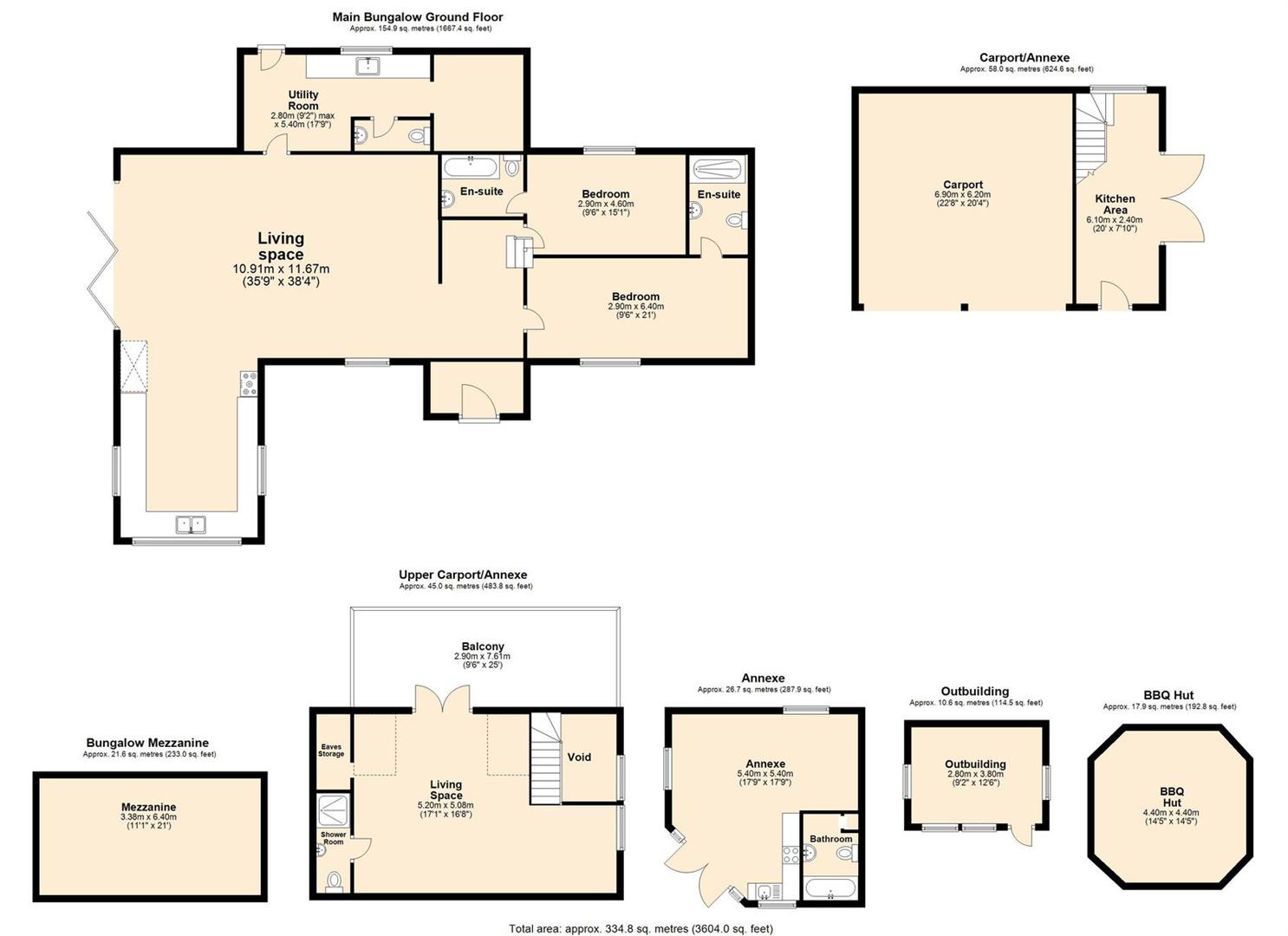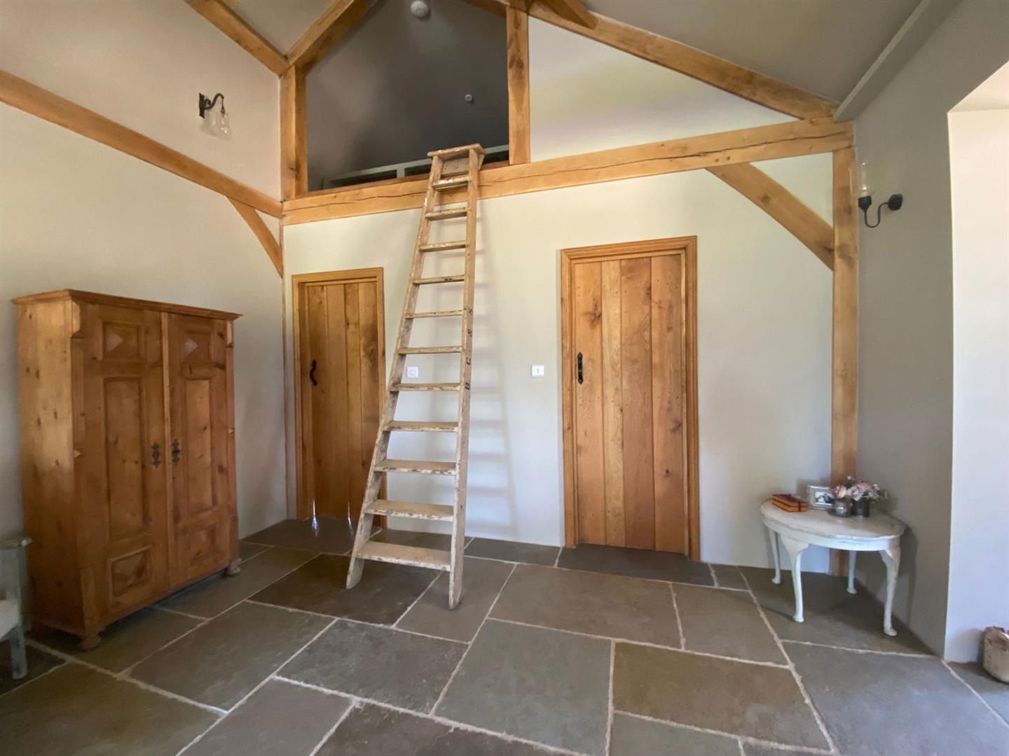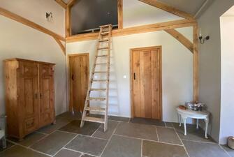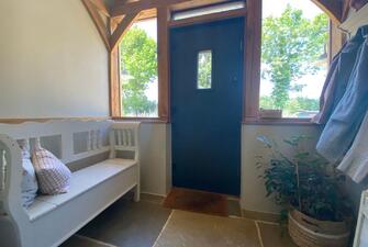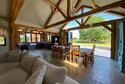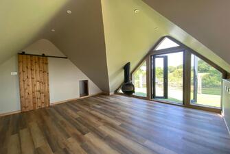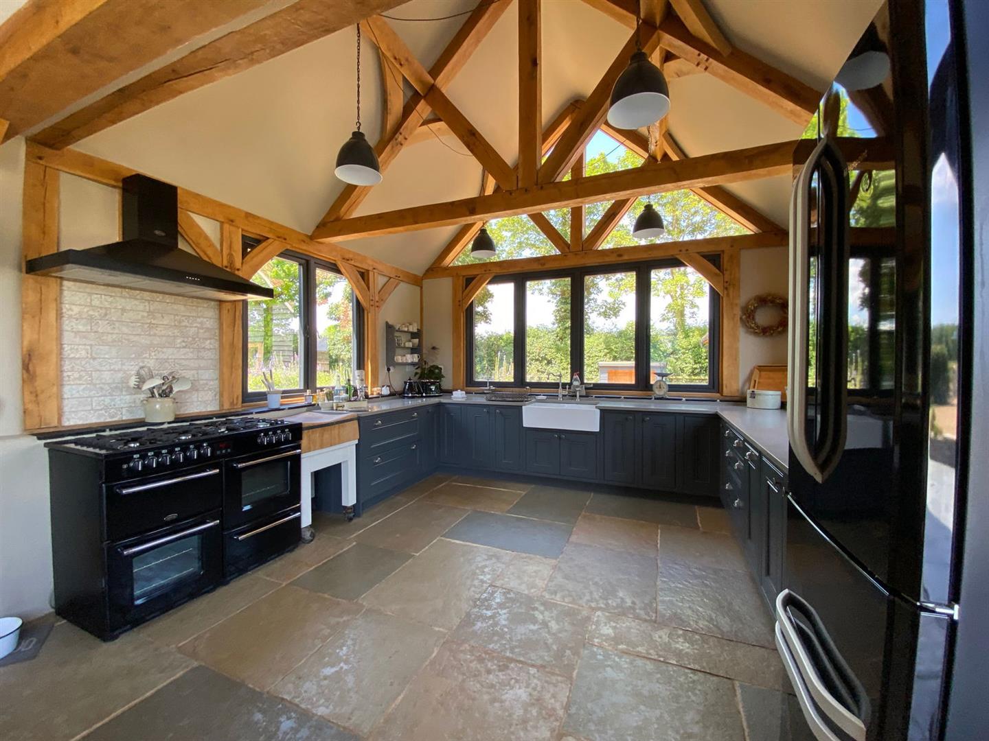 Step into the captivating main barn, a masterpiece of design with beautifully exposed oak framework, elegant window sills, and intricate trim. The flush Anthracite windows provide a striking contrast to the light feather board cladding. Inside, the barn exudes spaciousness and natural light, starting with a welcoming entrance hall. The fully vaulted open-plan living area is truly stunning, featuring a custom-built kitchen and dining space that seamlessly blend functionality and style. This barn includes two generously sized en suite bedrooms and a charming mezzanine level for additional space. The practical yet stylish elements include an open plan layout and useful utility/boot room . The living area boasts a recently installed wood-burning stove and exquisite flagstone flooring.
