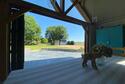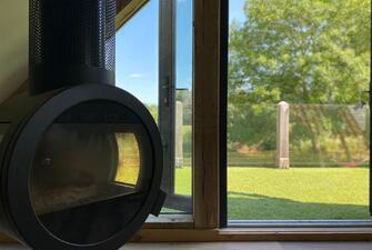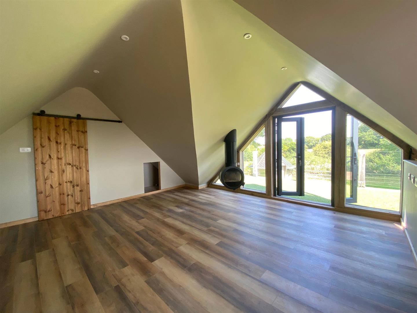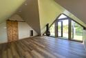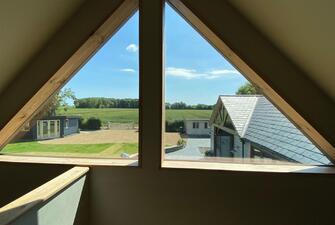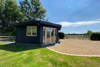 The versatile cart lodge features two spacious bays for vehicles and an attached gardener’s shower room. Inside, there is provision for a kitchen installation, and stairs lead to a breathtaking vaulted living room with floor-to-ceiling glazing. This area also features a suspended wood-burning stove, a modern shower room, and a balcony with panoramic countryside views. Below the balcony, you'll find a covered alfresco kitchen and entertaining area, perfect for hosting gatherings and enjoying the outdoors.
