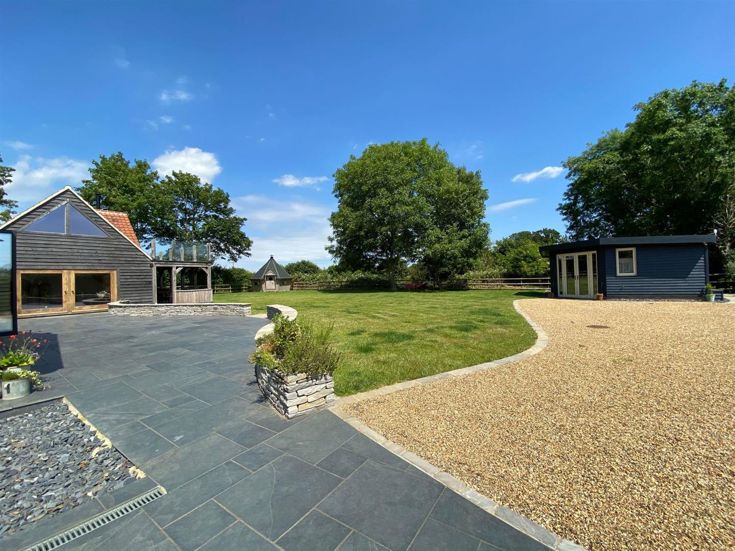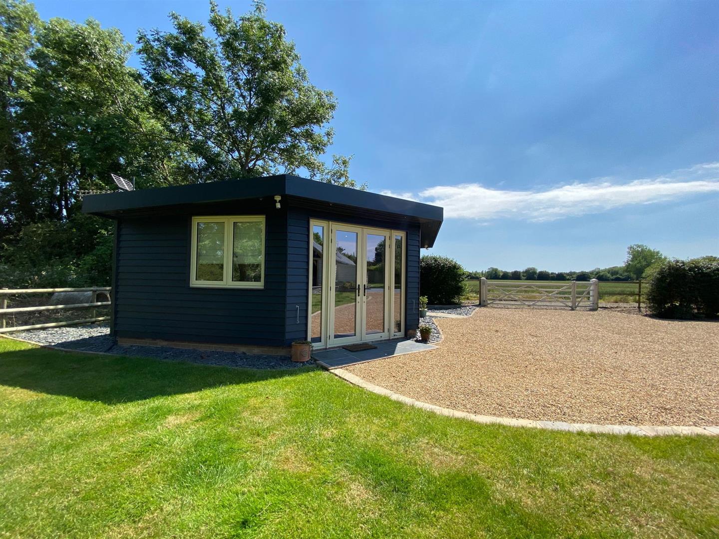 The property is perfectly positioned to enjoy a private and tranquil countryside setting. A substantial sun terrace invites relaxation, while the fully enclosed garden, mainly laid to lawn, includes a charming BBQ hut. This delightful hut adds a unique touch to the outdoor space, offering a cozy spot for cooking and entertaining all year round. Additionally, there is a substantial garden building thoughtfully designed with the potential to become an additional annexe or a stylish office space.