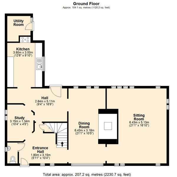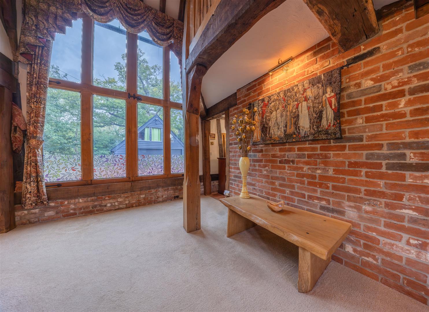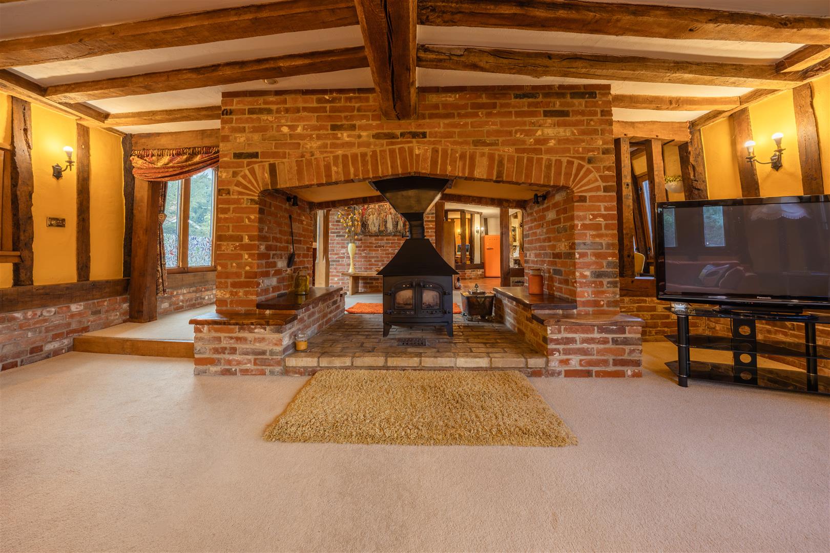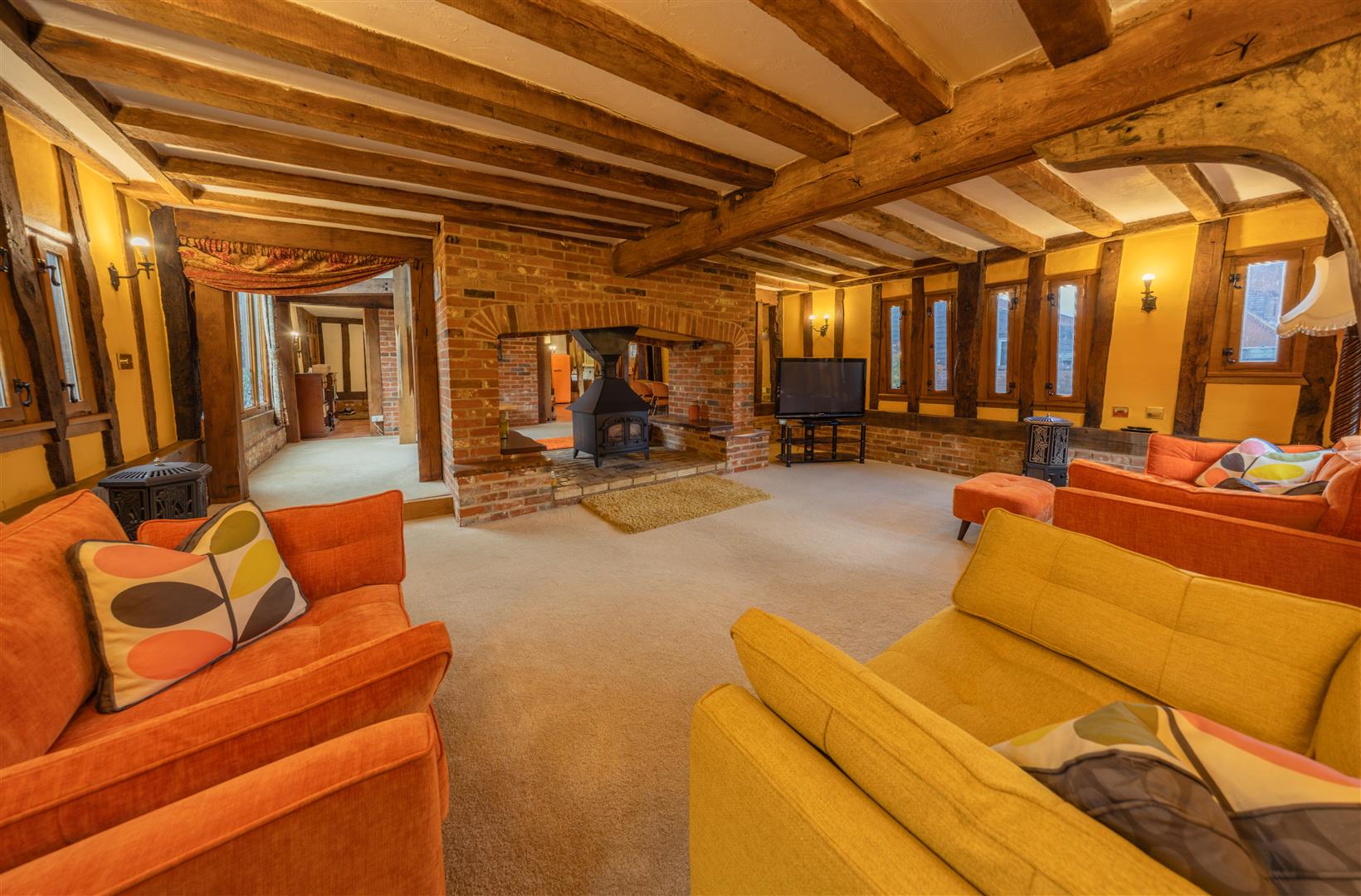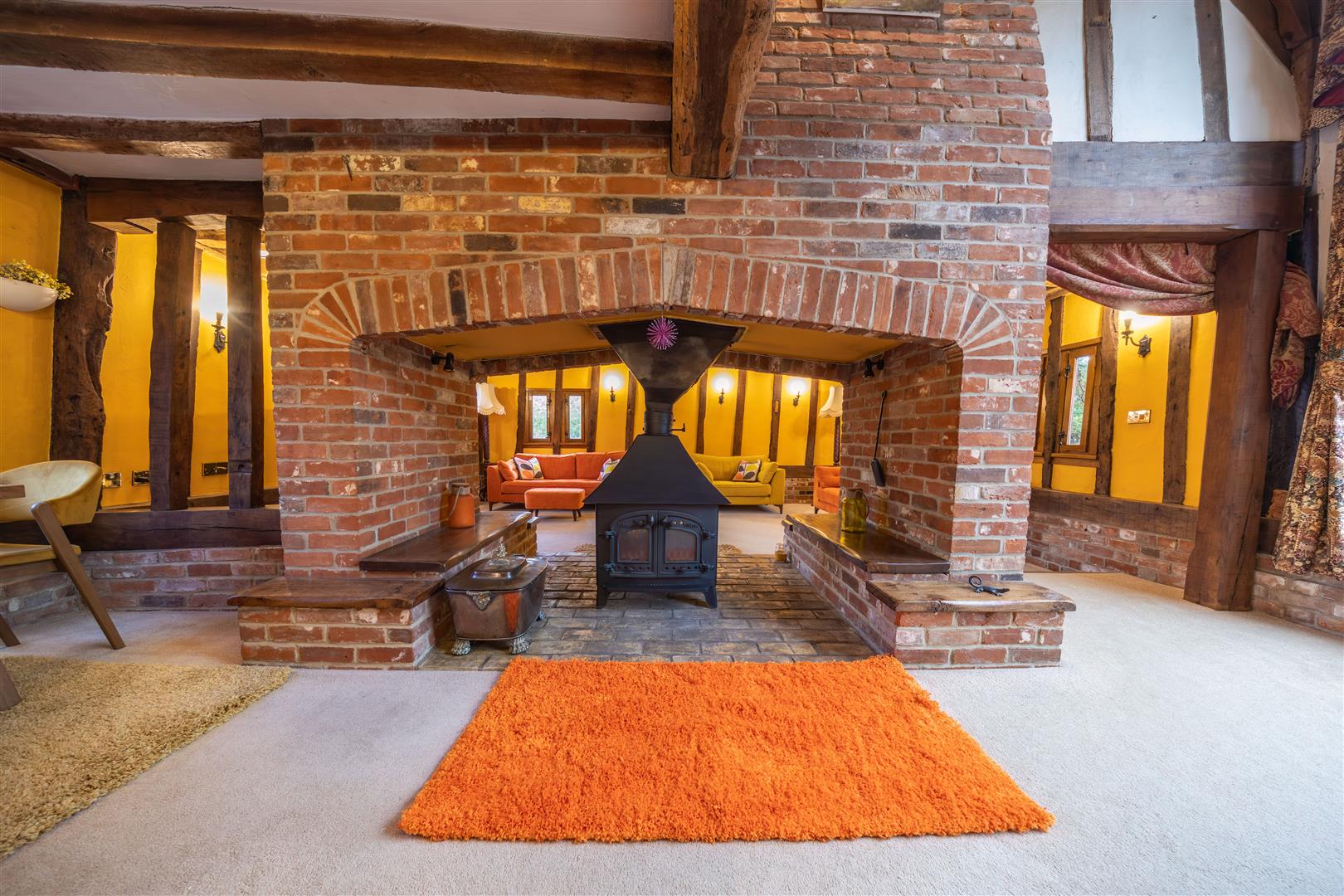 The primary living space encompasses two generously proportioned reception areas, each enhanced by the warm ambiance of a wood-burning stove nestled within a substantial inglenook fireplace that gracefully connects these rooms. The main hall offers convenient access to the kitchen, study, and a well-appointed cloakroom.
