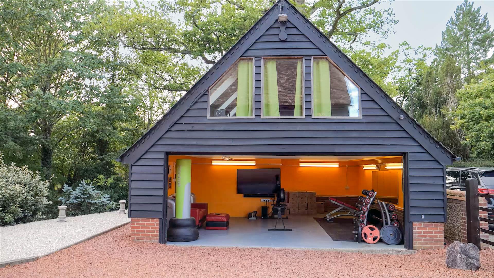 The entrance to the property is accessed through a sturdy wooden five-bar gate, leading to a gravel driveway that offers ample parking space for multiple vehicles. Directly across from the barn, you'll find the garage/gym, which includes a studio on the upper floor. Moving along the eastern side of the property, you'll discover a charming patio and an inner courtyard. This area is ideal for enjoying al fresco dining while relishing delightful views of the river.