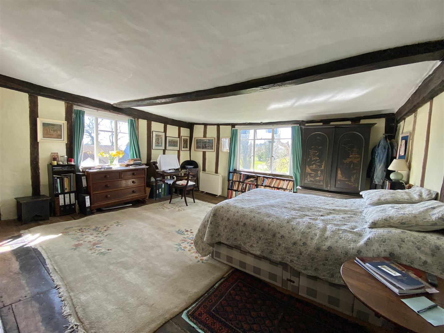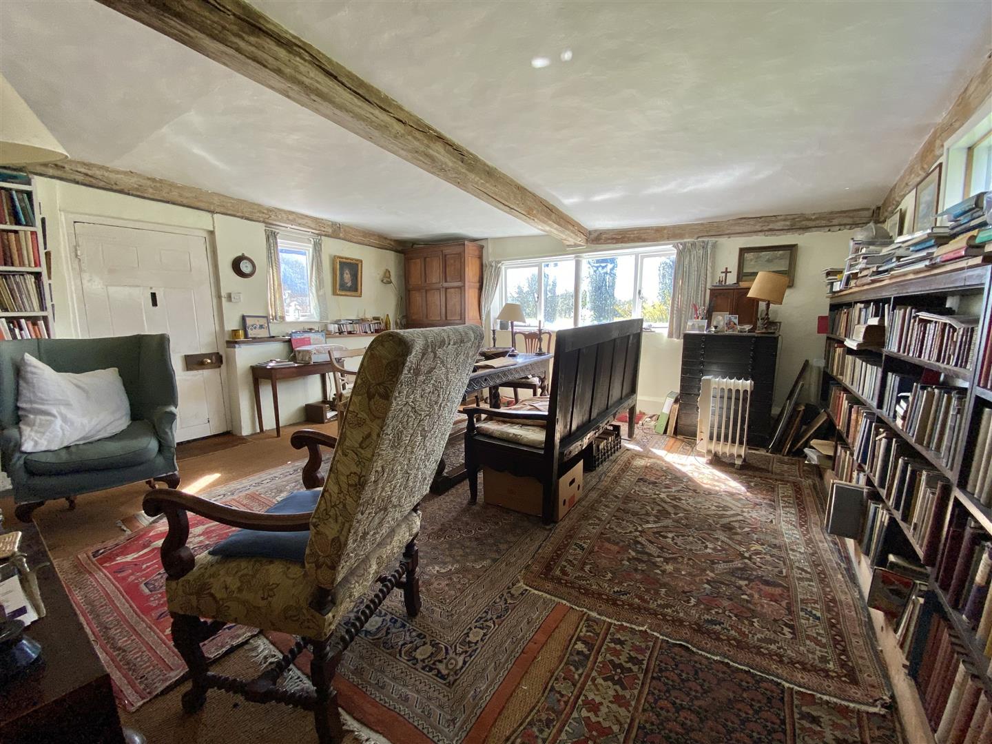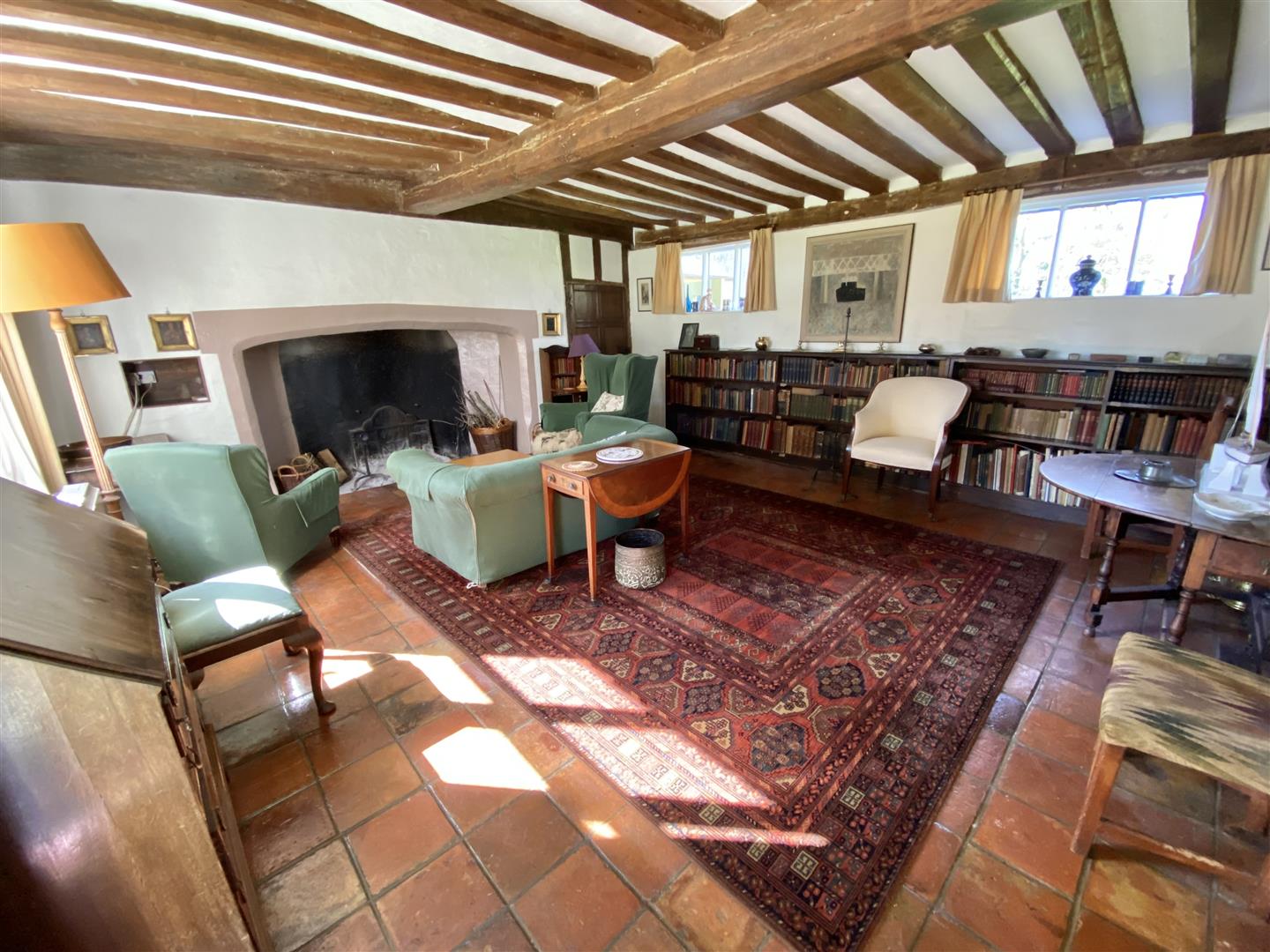Walnut Farm is a very attractive house with its rendered exterior and steeply pitched plain tiled roof hiding a very finely timbered house within. Much of the timber frame is exposed and it is easy to understand why the house is Listed as Grade II with its impressive fireplaces, some with Georgian inserts, original period doors, and wide board floors of oak or possible elm. There is some improvement work that could be done which would allow a new owner to make their own mark on this house and it is one that many would describe as having been largely untouched which is a positive statement!