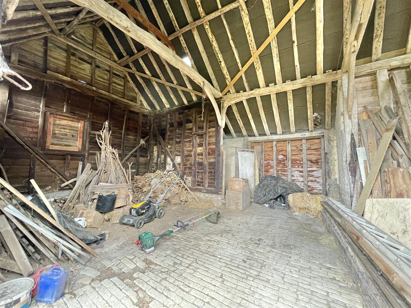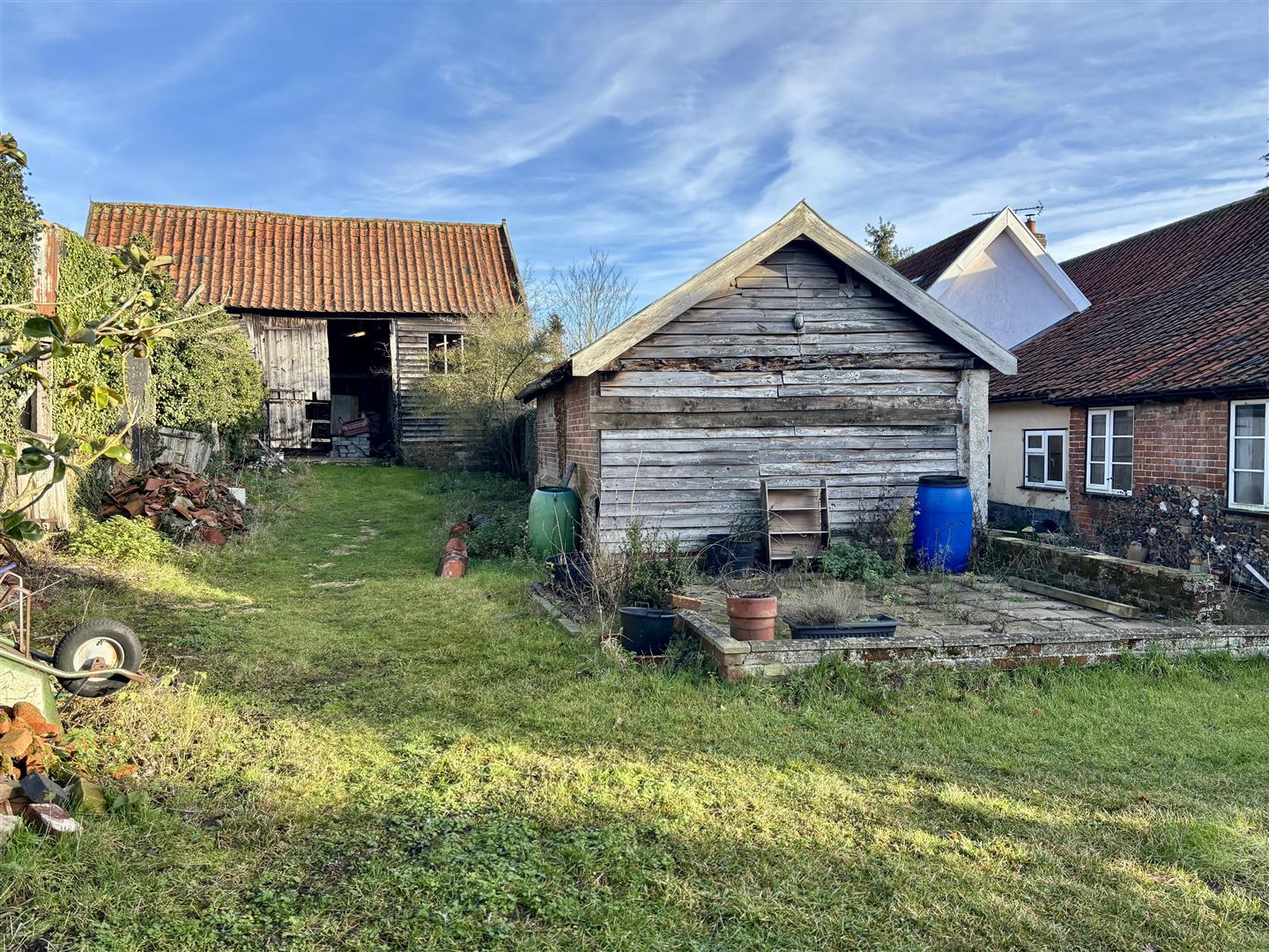 Walk further along, there are a range of dilapidated clay lump outbuildings, as well as a brick, timber and clay lump constructed threshing barn, also requiring work.