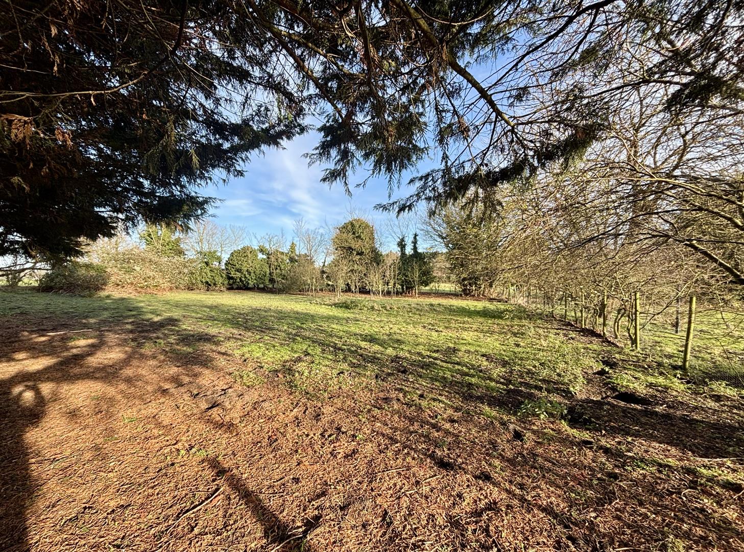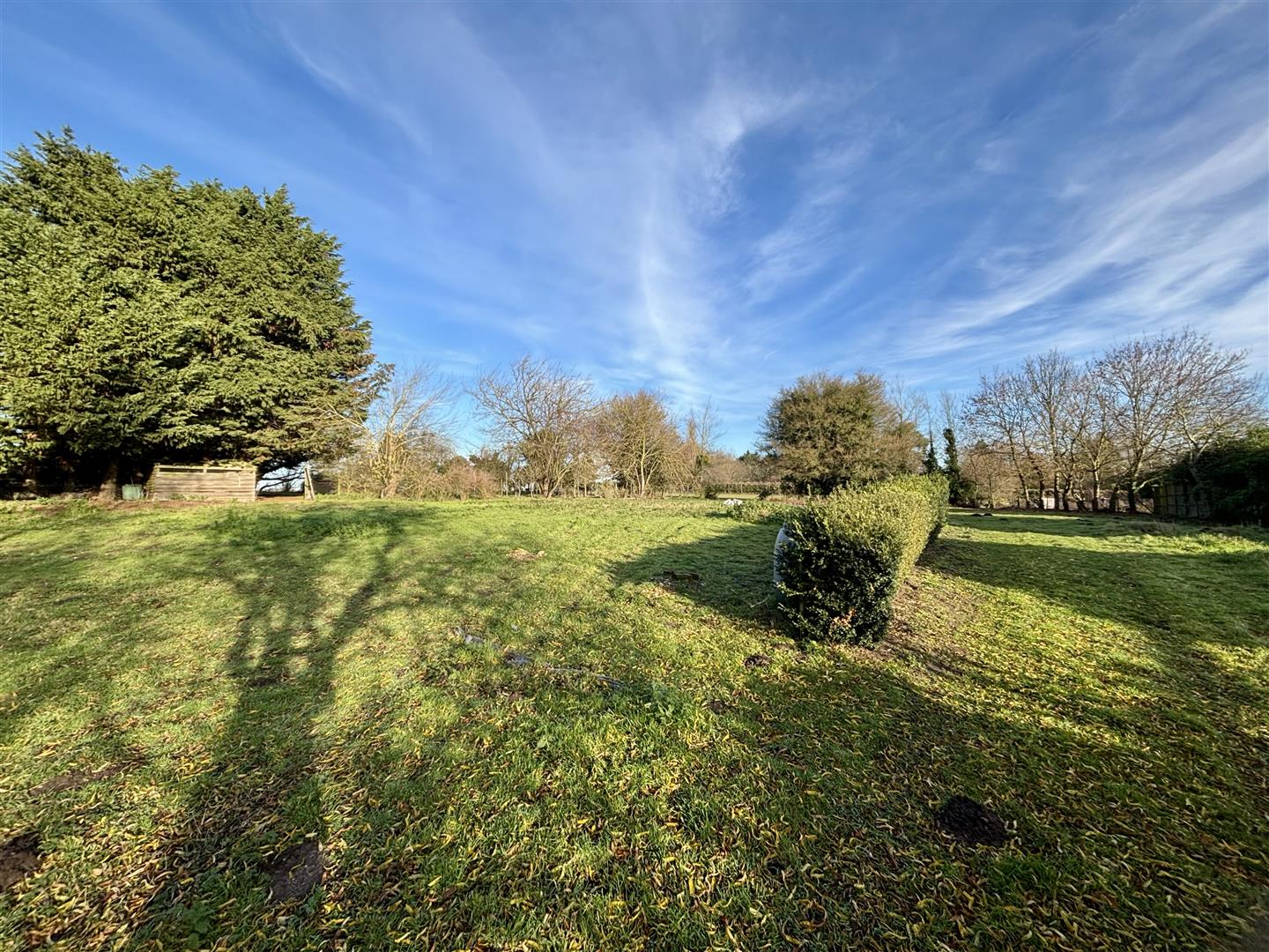 Continuing along the incline, the grounds open up into a grass field, edged with mature shrubs and trees. A smaller parcel of grassland can be found at the top of the property.
