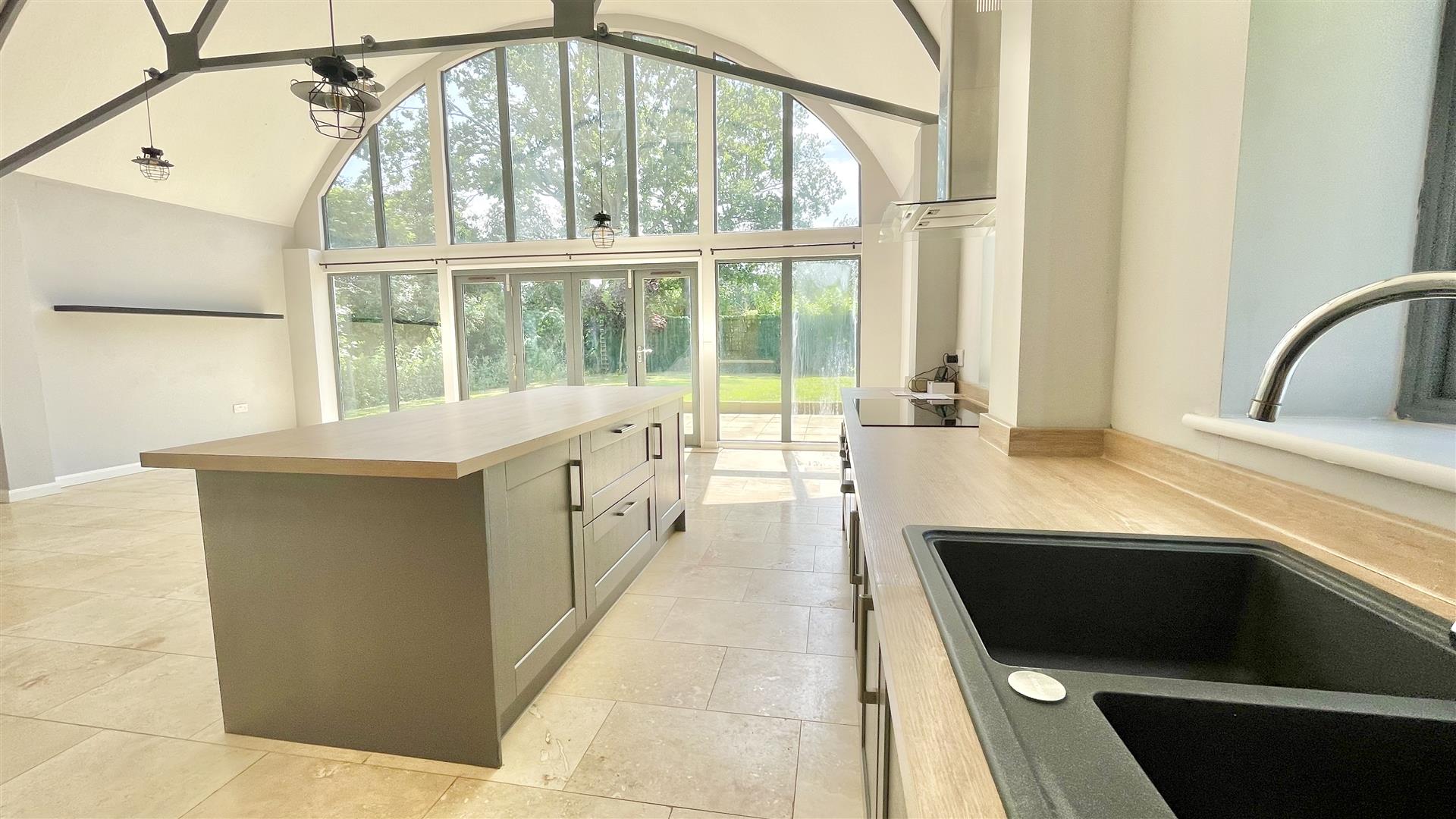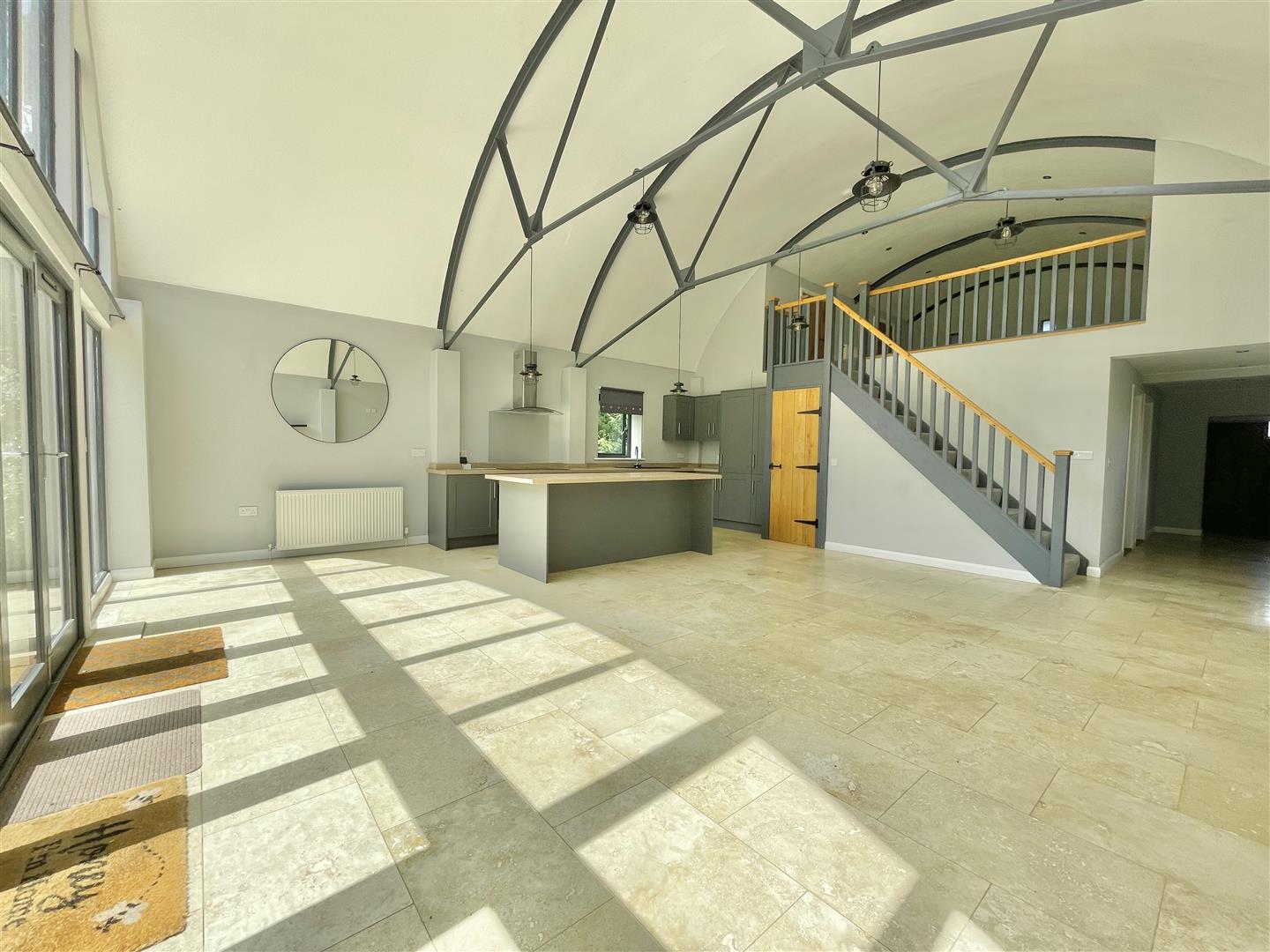 As the name states, at one time the property was a Cinema which was used by the servicemen and women stationed at the airbase, and the visible film projector holes in the first floor bedroom provide a nod to its previous use. The Old Cinema has since been extensively renovated by the current seller, and offers a unique opportunity to purchase a bright, spacious home with heritage. The accommodation is spread across two floors, with the Mezzanine area at the front allowing for a multitude of uses, such as a cosy winter snug, or further bedroom space if necessary. A large open plan kitchen/living room is below and this is a wonderful, bright space which has a 'wow' factor, not only due to it being a social hub which is ideal for parties and family gatherings, but also its glazed gable end that's flooded with light for much of the day.