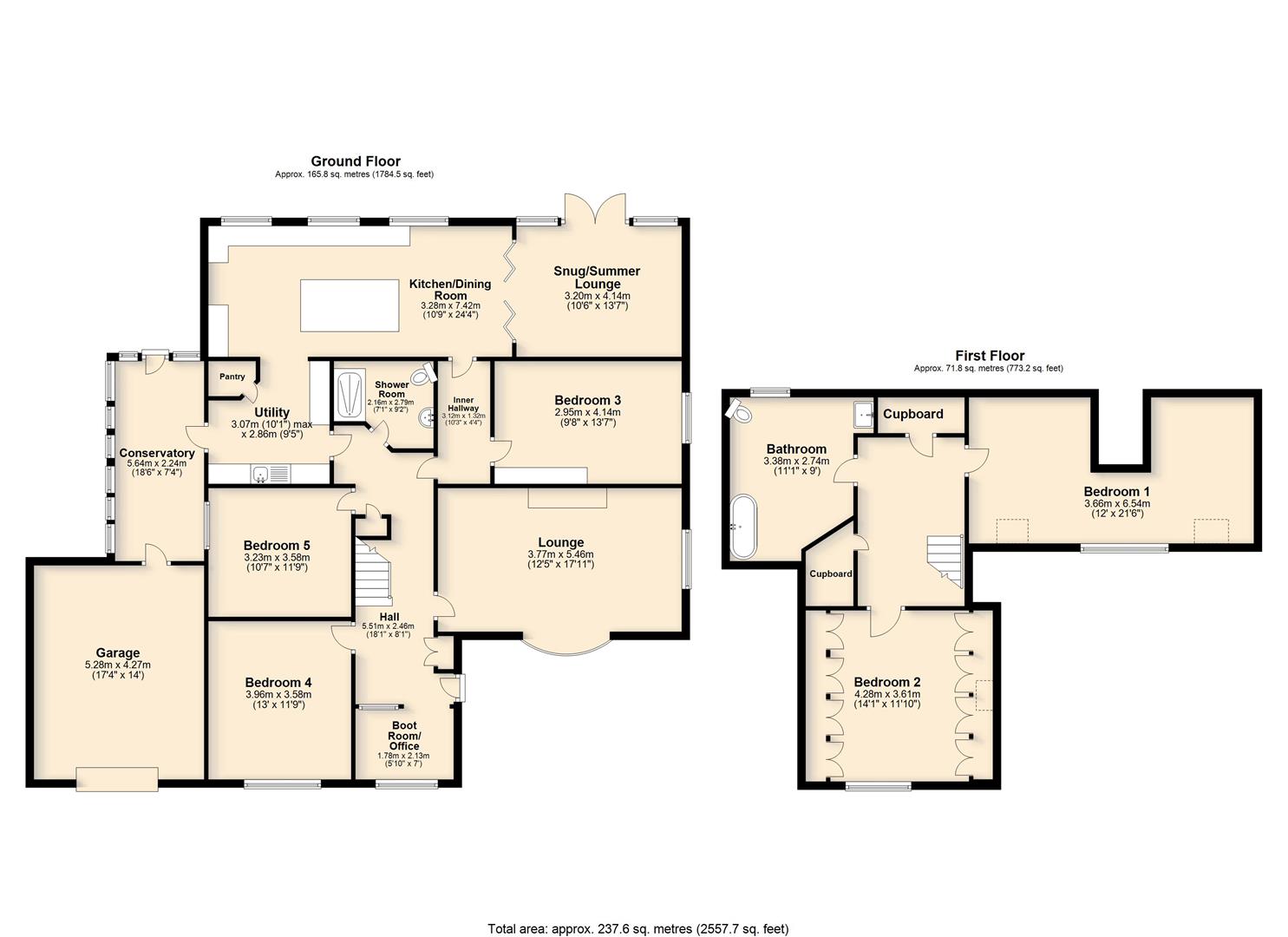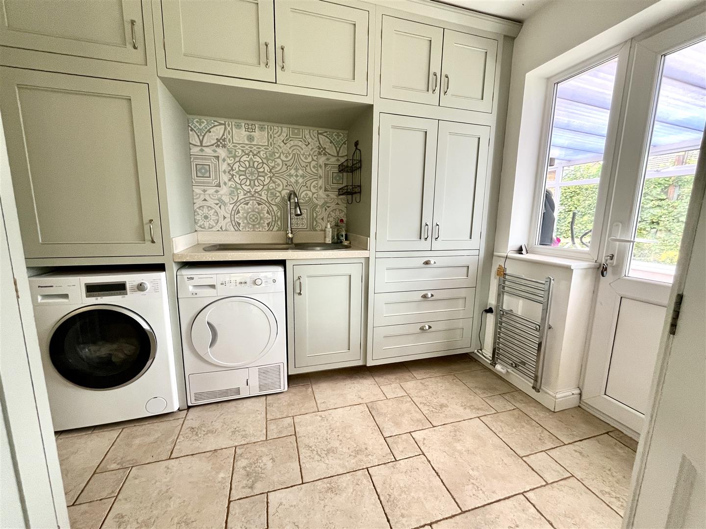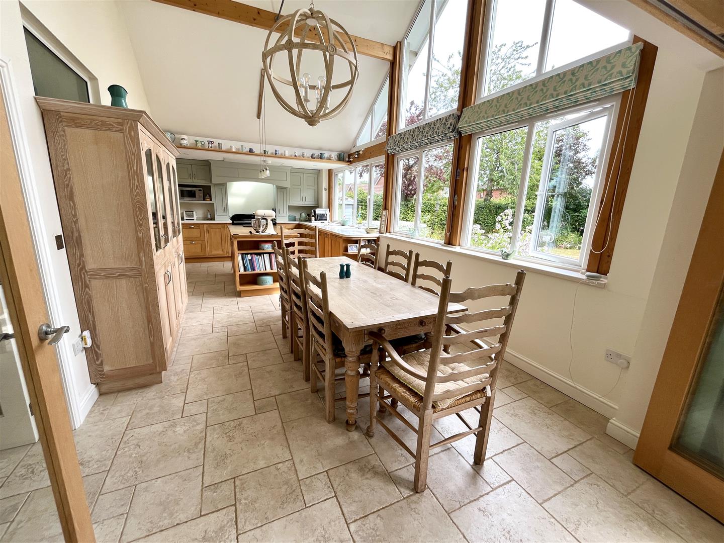 Nestled at the end of a sweeping driveway, this impressive five-bedroom detached family home offers versatile living accommodation with bedrooms thoughtfully arranged across both the ground and first floors. Upon entering, you're greeted by a welcoming entrance hall that sets the tone for the spacious layout beyond. The ground floor features three generous double bedrooms, a home office/boot room, and a stylish lounge with dual-aspect windows and a charming wood burner – perfect for cozy winter evenings. At the heart of the home lies a stunning kitchen/dining room, complete with a bespoke fitted kitchen, central island, and a striking glass gable vaulted ceiling that floods the space with natural light and frames serene views of the garden. Adjacent to this, a snug/summer lounge with bi-folding doors between and patio doors seamlessly connects the indoor space with the outdoors from the snug. Additional ground floor highlights include a utility room with a walk-in pantry and custom cabinetry, a double shower room with WC, and a conservatory that leads to the mature garden and a large garage. Upstairs, the main bedroom suite offers privacy and comfort with a separate dressing area, while a further double bedroom features clever eaves storage. A well-appointed family bathroom includes a feature vanity sink, completing the first-floor accommodation. This beautifully presented home combines practical family living with stylish design and scenic surroundings – a truly exceptional property.