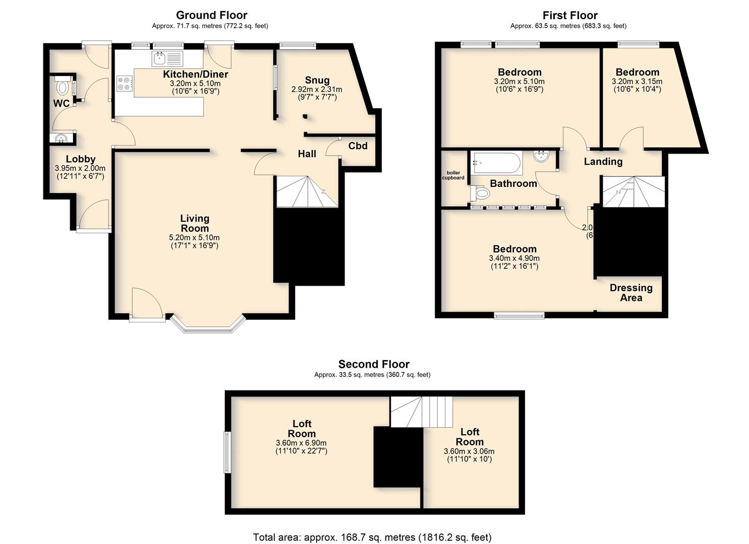 The first floor comprises two double bedrooms, a single bedroom, and a family bathroom. A staircase leads to the second floor, where two attic rooms provide flexible additional space suitable for guests, a home office or hobbies.