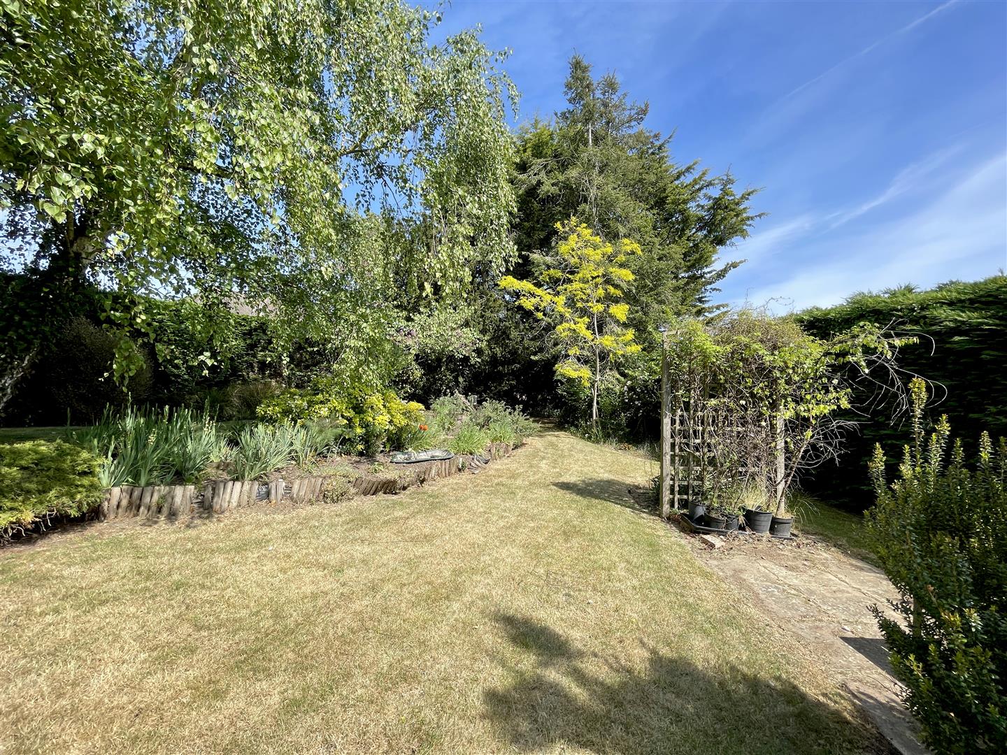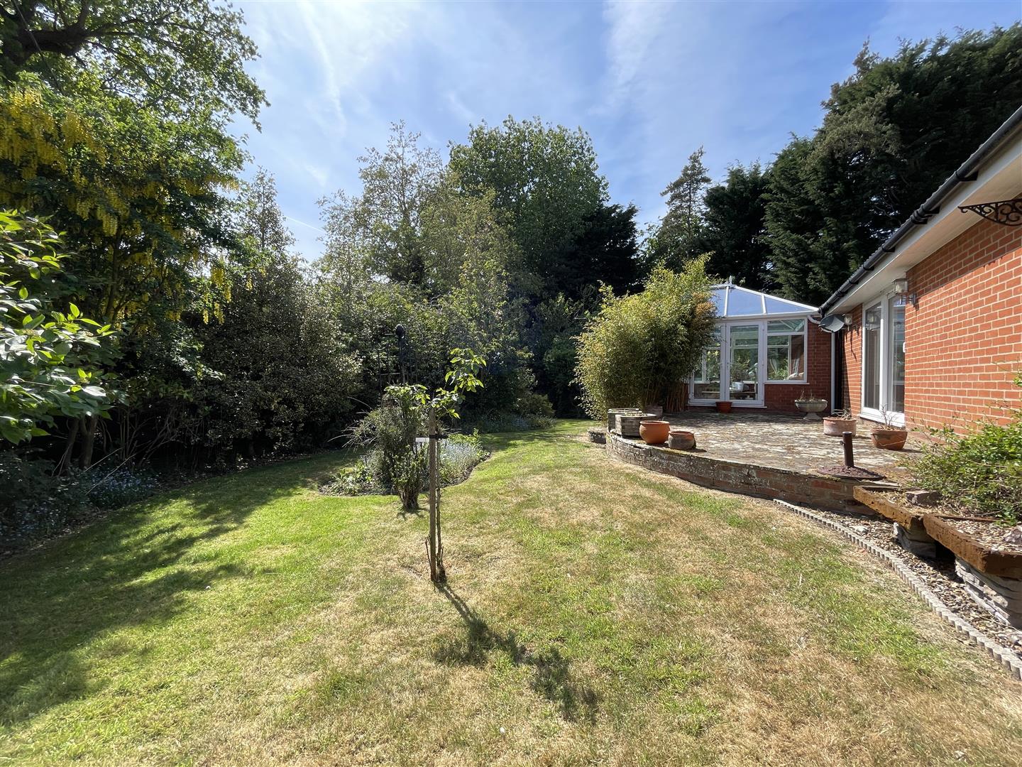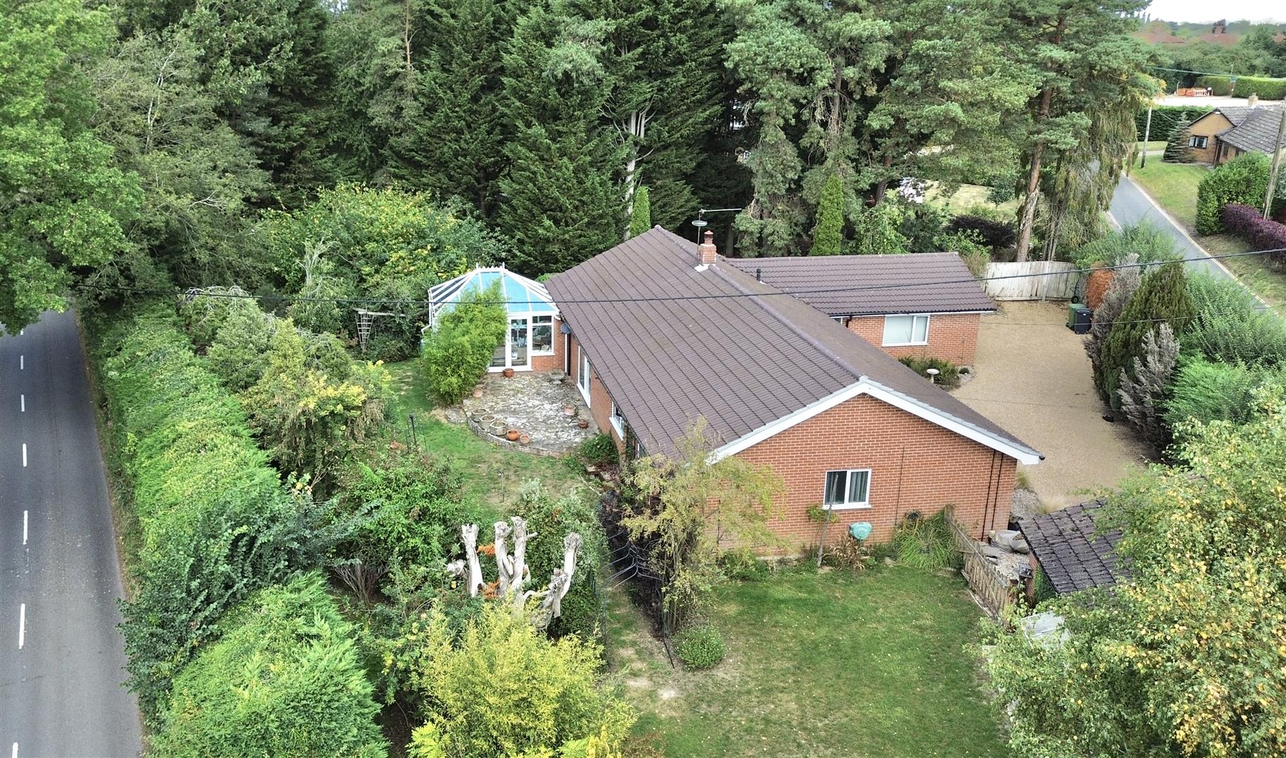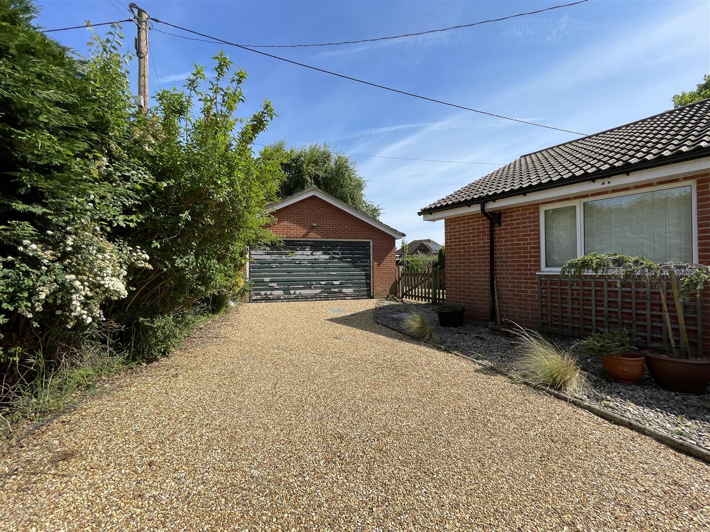 A shingle driveway provides spaces for several vehicles, with double garage found adjacent to the conifer hedging which runs along and screens the front boundary, helping to aid the feeling of privacy. The plot itself is mature, with various planting and landscaping. Triangular in shape, the garden and lawns leads to a point near the junction, where an old, interesting pillbox can be found in amongst various shrubs and trees.