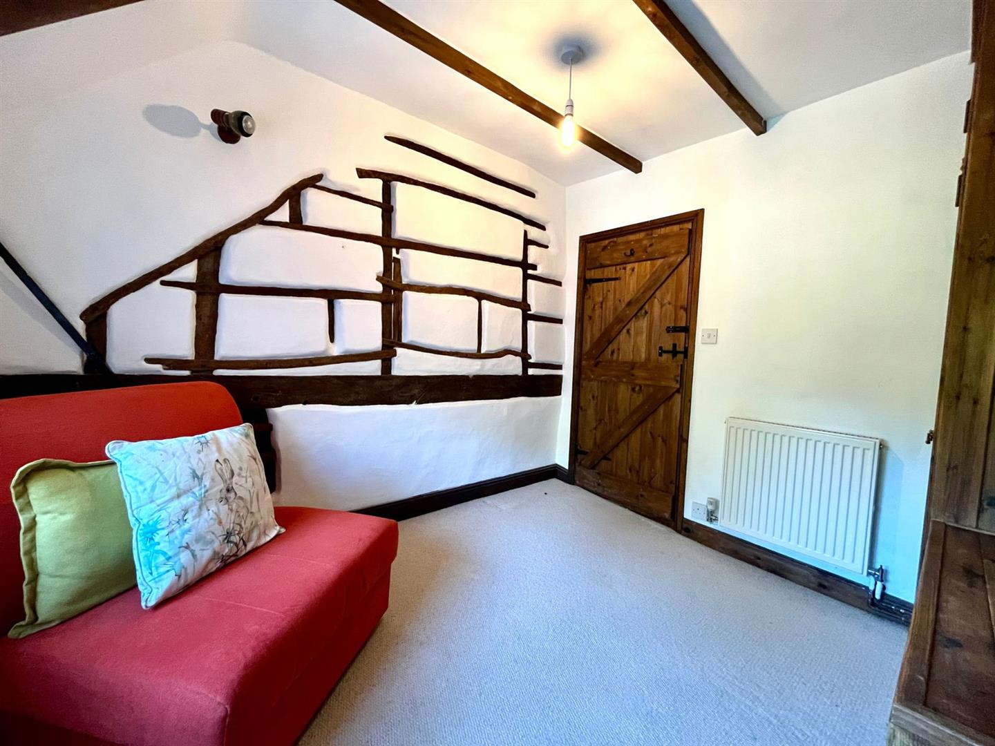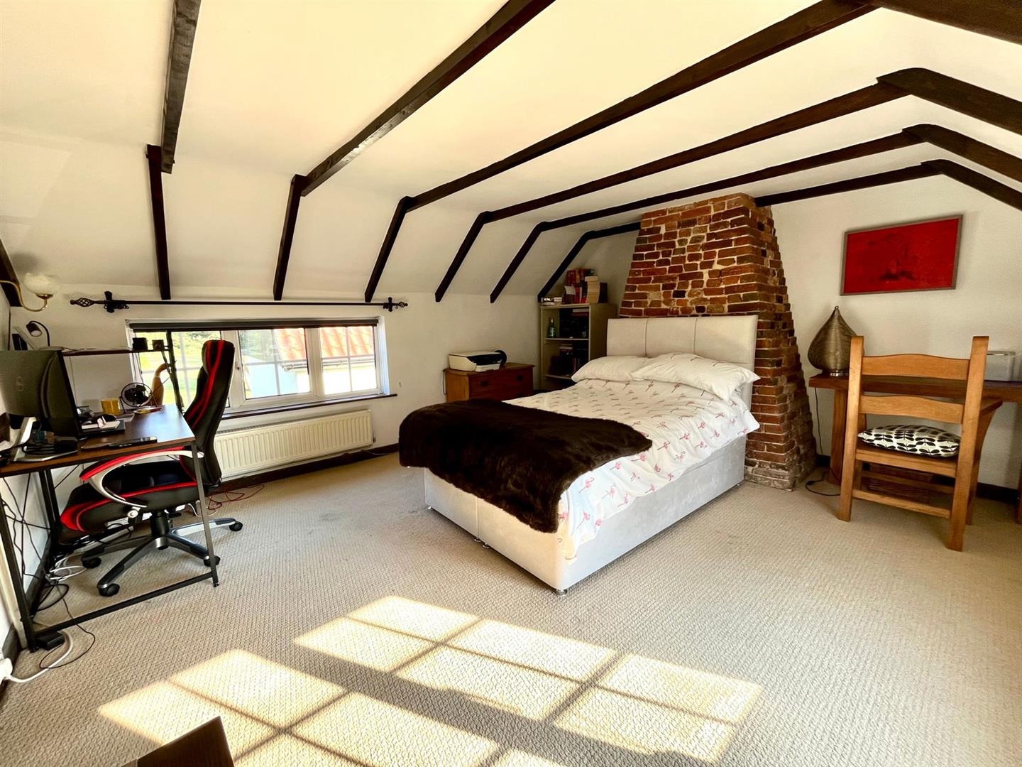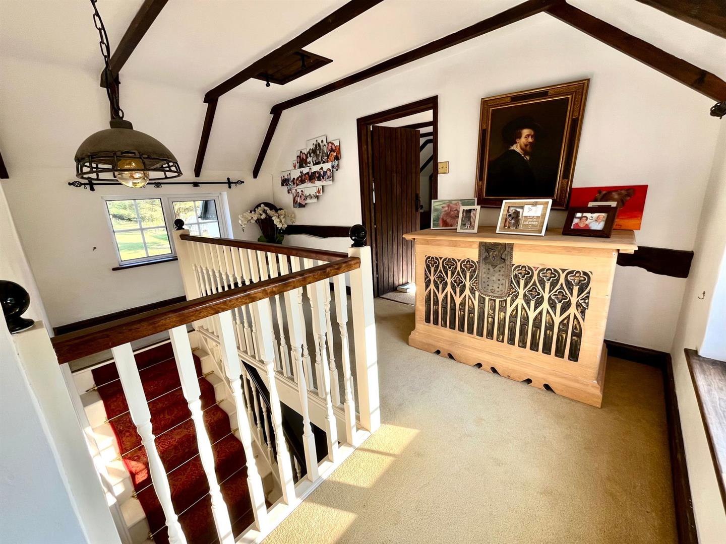 Upstairs, the original exposed beams are a prominent feature in all three additional bedrooms and the family bathroom. The first floor also enjoys a spacious landing area with views over the front garden, enhancing the sense of space and light.