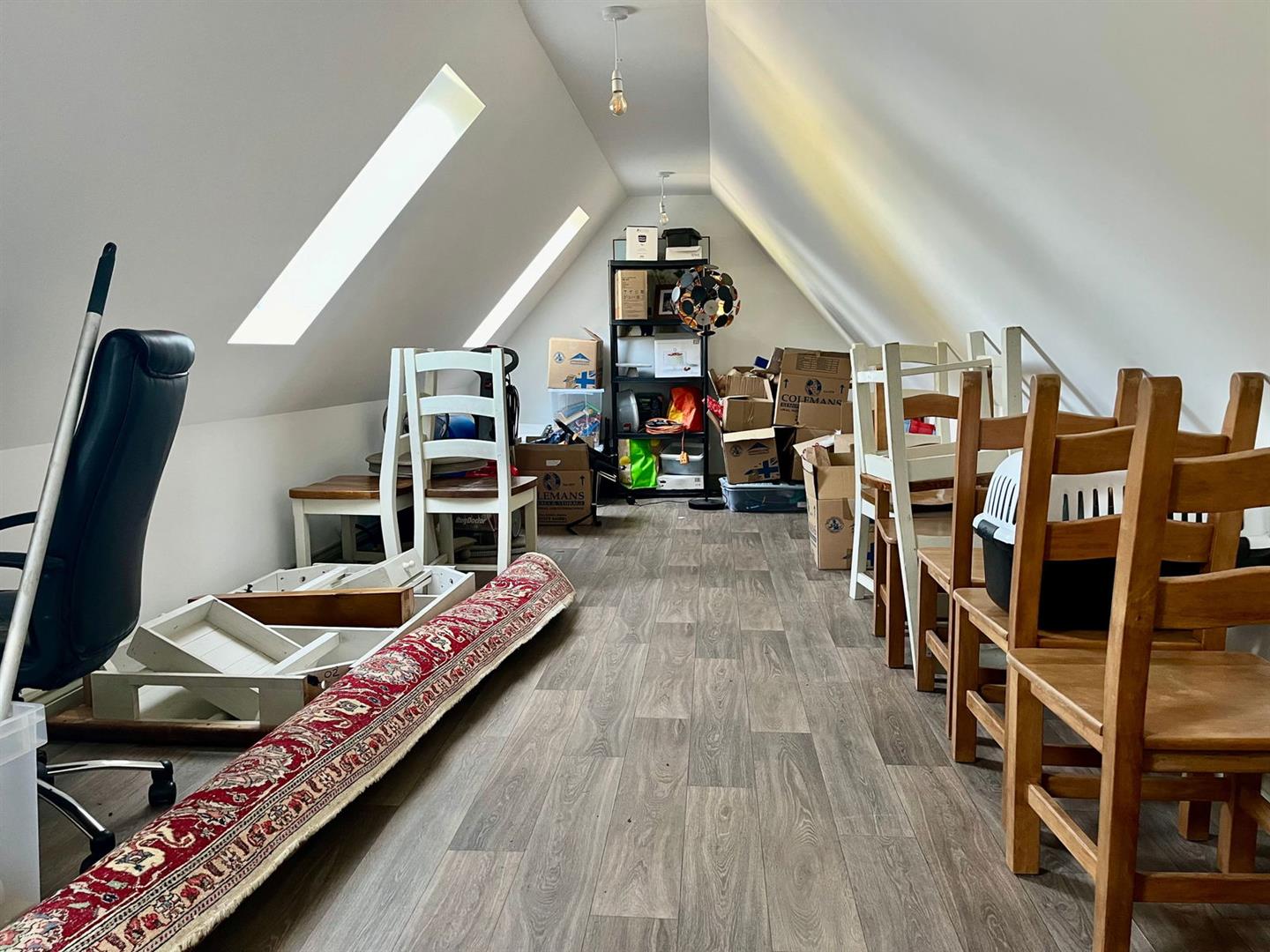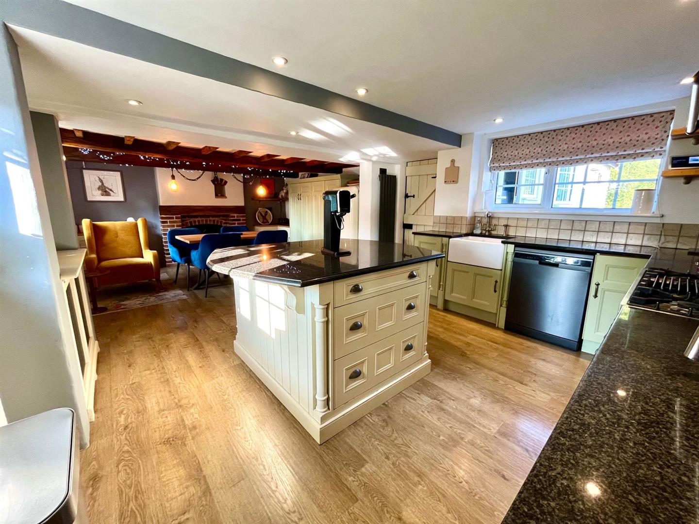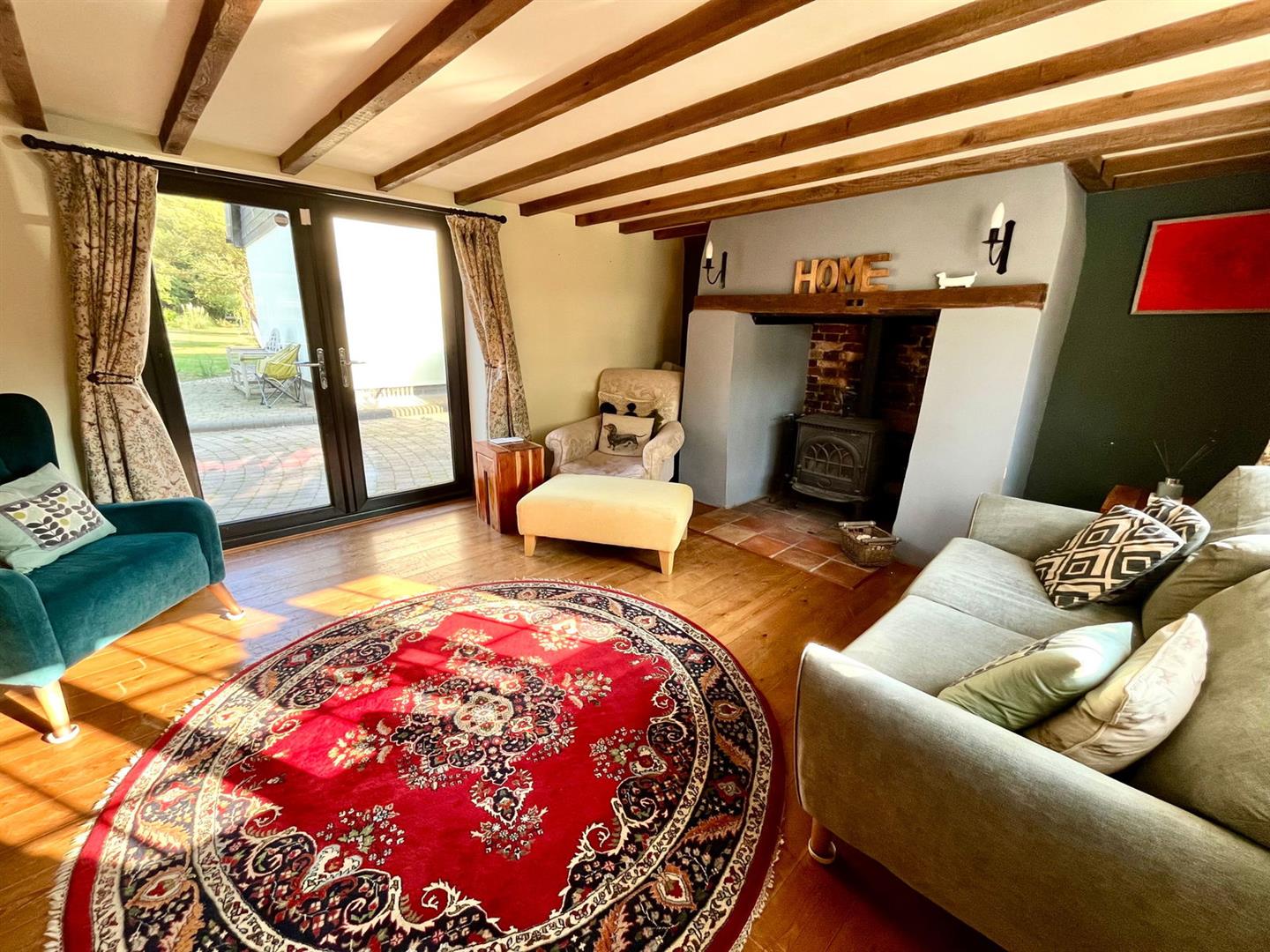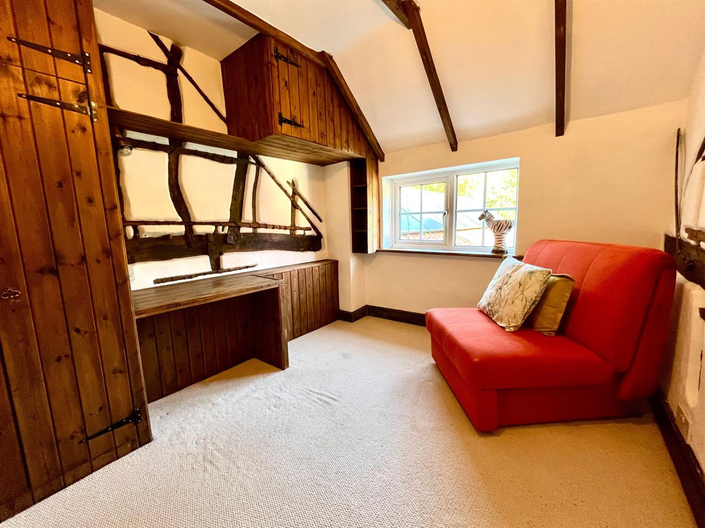 Upstairs, the original exposed beams are a prominent feature in all three additional bedrooms and the family bathroom. The first floor also enjoys a spacious landing area with views over the front garden, enhancing the sense of space and light.